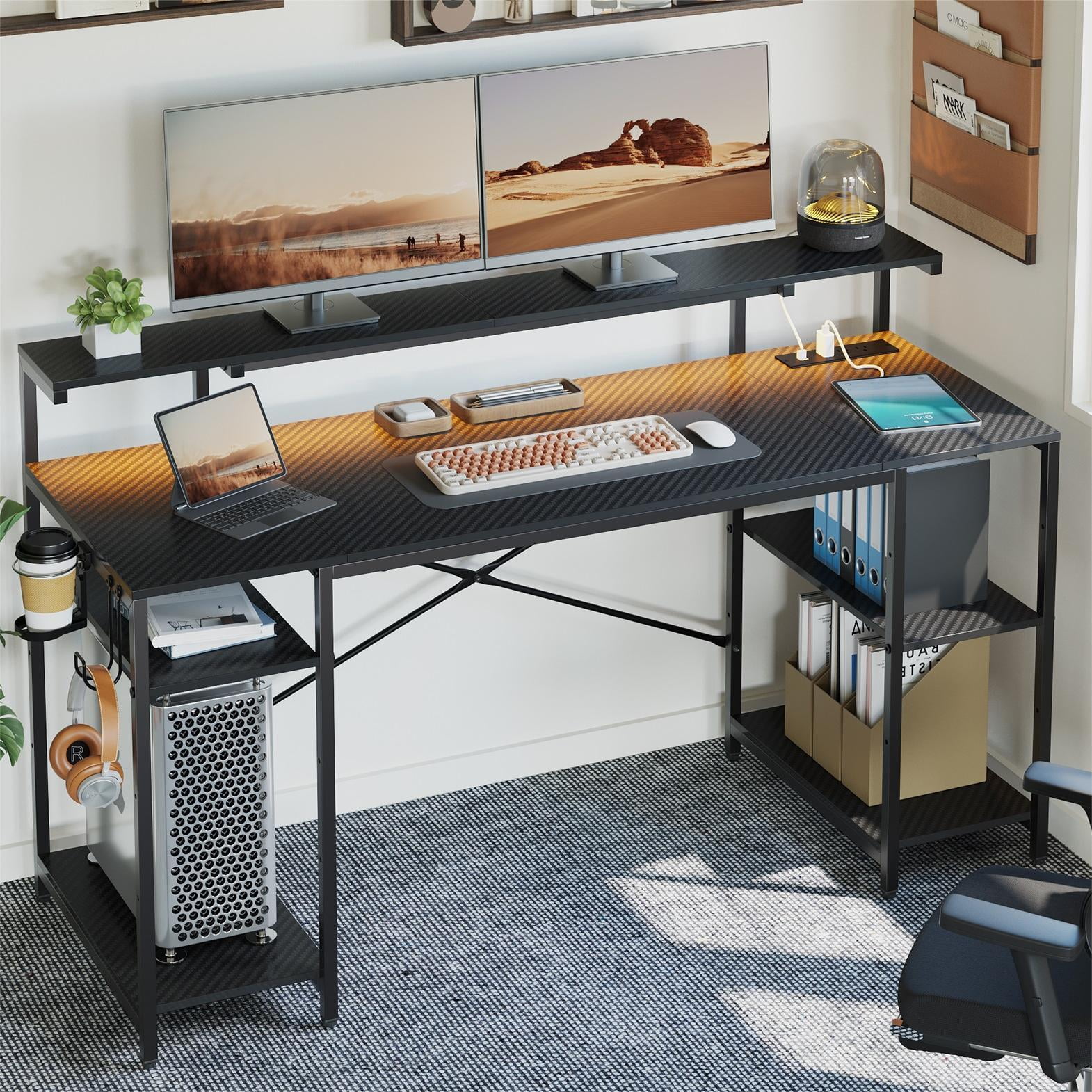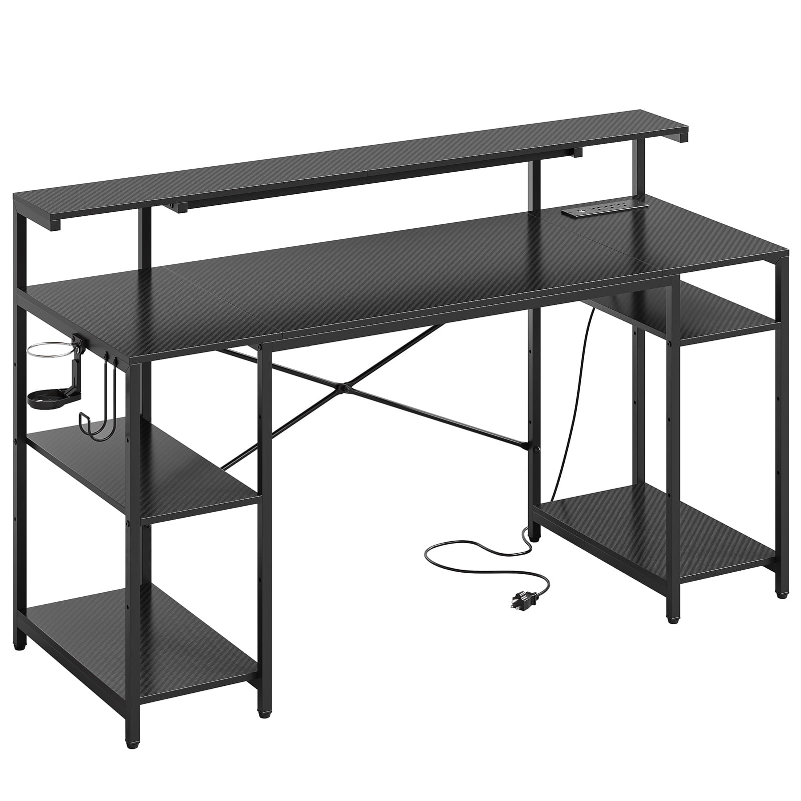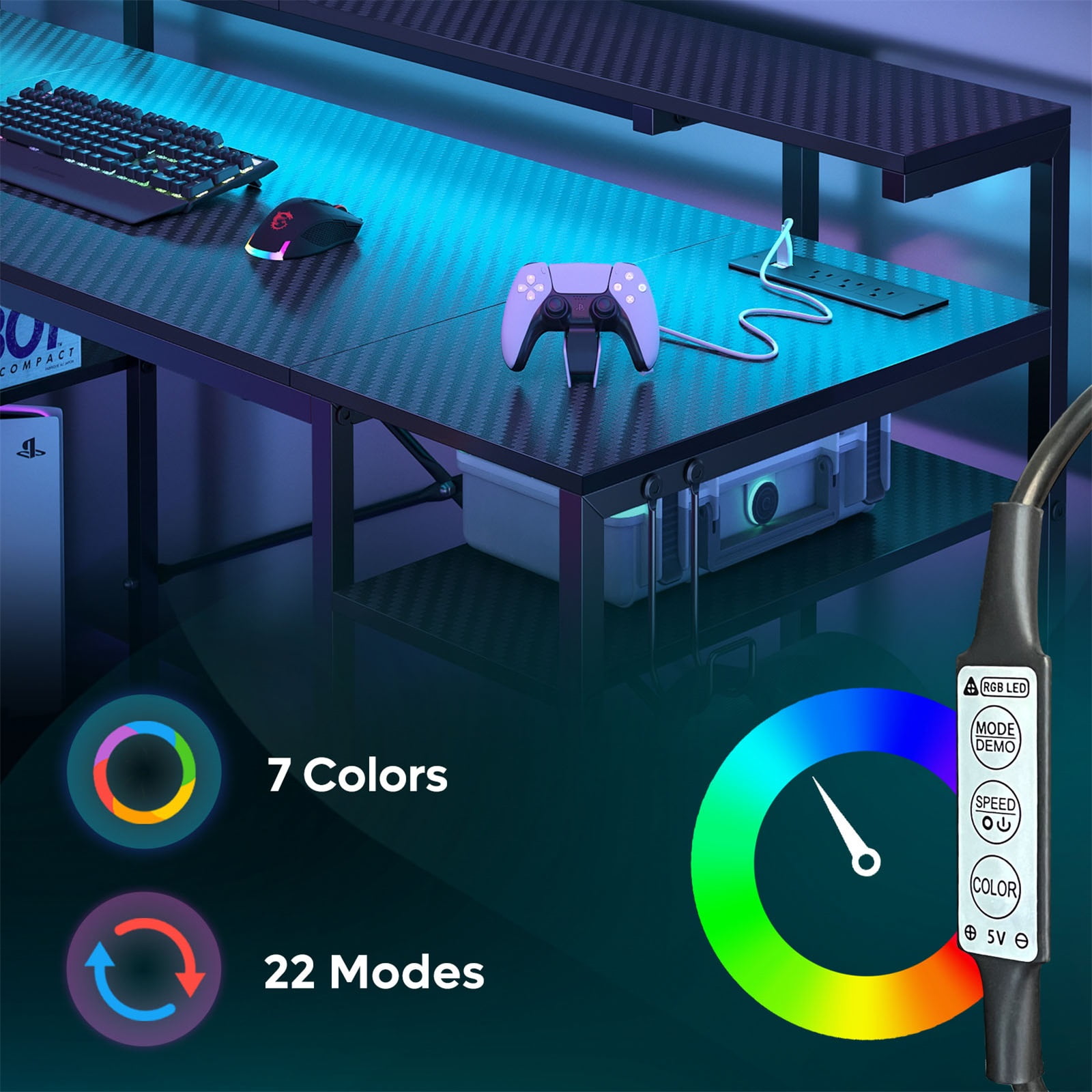 Bestier Gaming Desk with LED Light & Outlets 55″ Computer Desk with Monitor Stand, Black Carbon Fiber