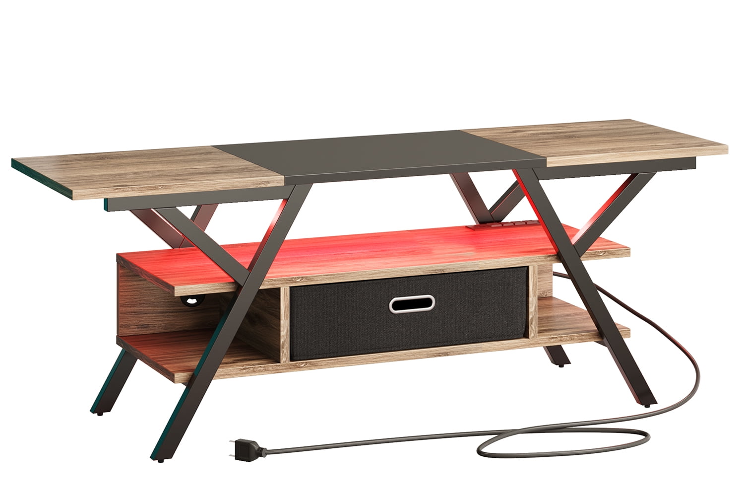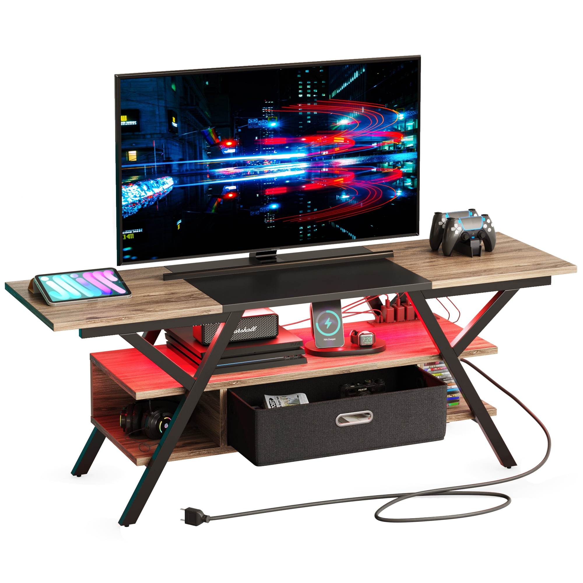The Bestier entertainment center TV stand can hold a maximum 65-inch TV, giving your living room a fresh makeover. Made from CARB-certified P2 particle board, it offers excellent stability and durability. The standout feature is its unique Y-shaped metal design with open storage on both sides and a detachable drawer in the center, combining both open and concealed storage options. Moreover, it comes with four power outlets and two USB ports, making it easy to charge gaming devices like controllers or other electronics. You can also personalize your space with seven color options and twenty dynamic LED lighting modes. Its simple and elegant design complements any living room, study, or game room decor perfectly.