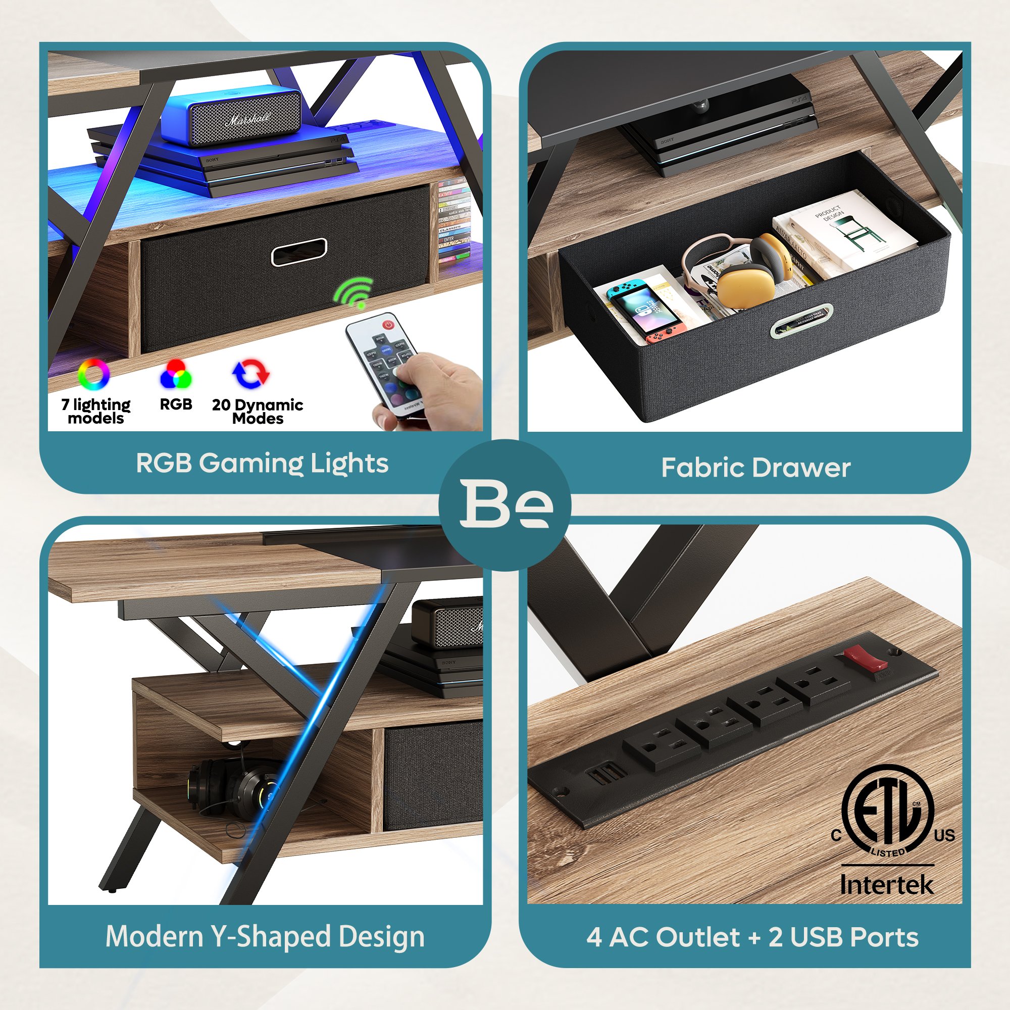 4 Outlets & 2 USB Ports: Fed up with messy wires behind your TV stand? No worries! The Bestier RGB TV stand has built-in power outlets, keeping your space neat and organized. No need for extra sockets. Easily charge your gaming devices hassle-free! Gaming Entertainment Center:This TV stand with cool LED lights gives you 7 main colors and 20 dynamic modes to jazz up your space. Whether you’re into immersive gaming, throwing home parties, or having a movie night, you’re gonna love it even more. Distinguish Design & Details:This TV stand rocks Y-shaped legs, color-matched panels, and a removable drawer! It’s built tough with a sturdy frame and CARB P2 particle boards, ensuring durability and easy cleaning. A stylish and practical addition to any living space! TV Console for up to 65 Inch TV: Dimension: 55″(L)×15.7” (W)×22” (H). Two tier shelves/4 compartments to store lots of stuff, like Xbox, game devices, sound bar, etc. You could also display your hero figures and turn on the rgb lights, there then comes your own world. Easy Assembly:Come with user-friendly instruction, you can put it up within 1.5h. Bestier offers great customer service before and after your purchase, 1-year quality guarantee. Please feel free to contact us for any questions or concern, we will solve them within 24h with all effort. Specifications: Material: P2 Particle Board + Metal Frame Overall Dimension: 55″(L)×15.7” (W)×22” (H). Tabletop Load Bearing: 100LBS Middle Shelf Load Bearing: 25LBS Bottom Shelf Load Bearing: 15LBS Overall Product Weight:48.5lb Self-assembly: All fixings and tools supplied. Overall Product Weight:48.5lb Self-assembly: All fixings and tools supplied.