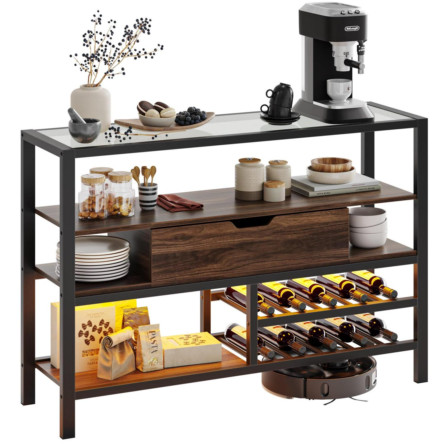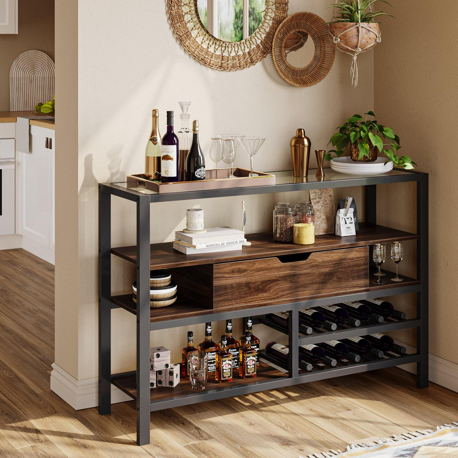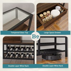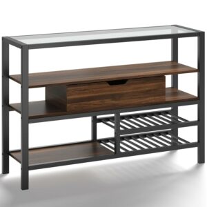 Bestier Glass Top Console Tables with Wine Rack and Storage Buffet Cabinet for Living Room, Walnut