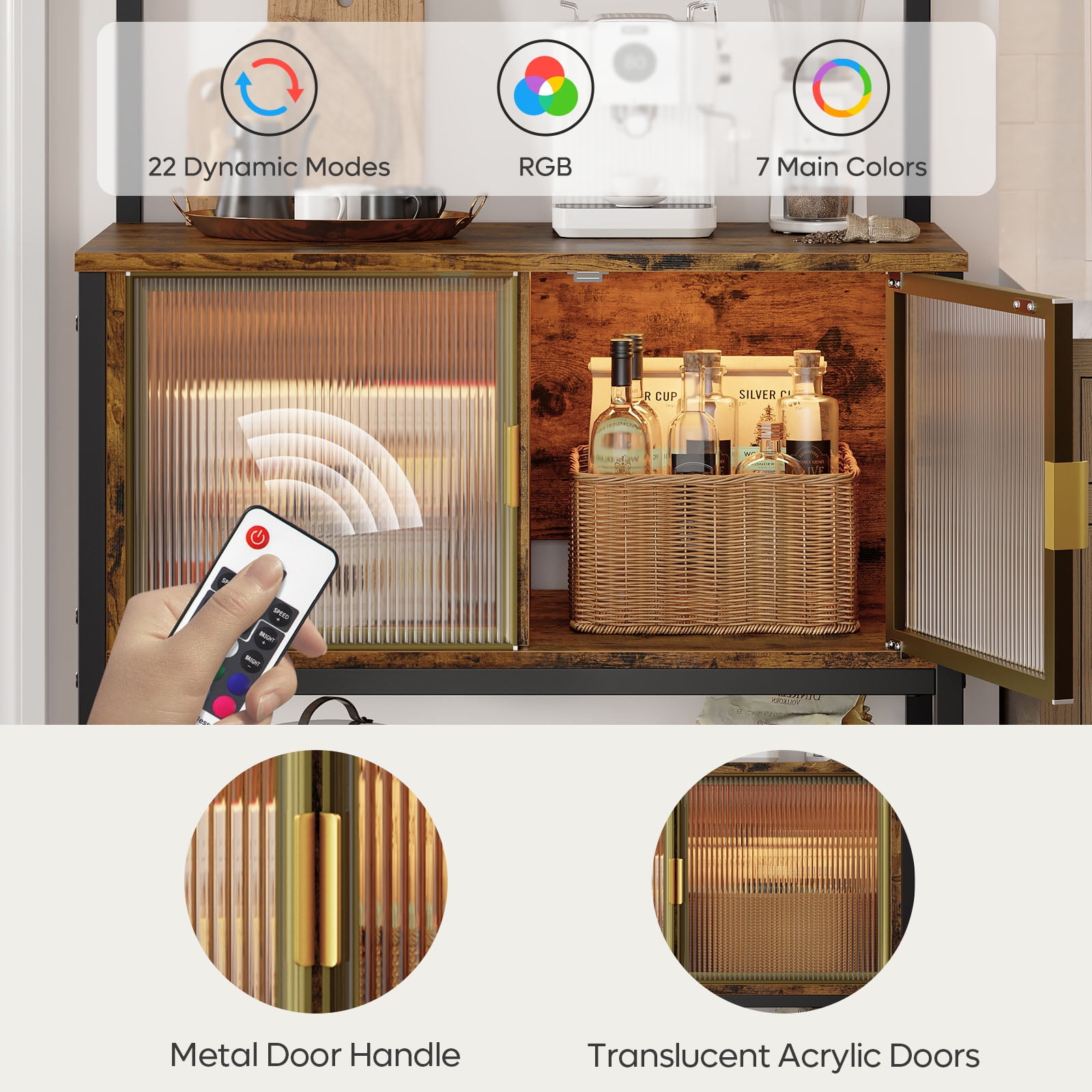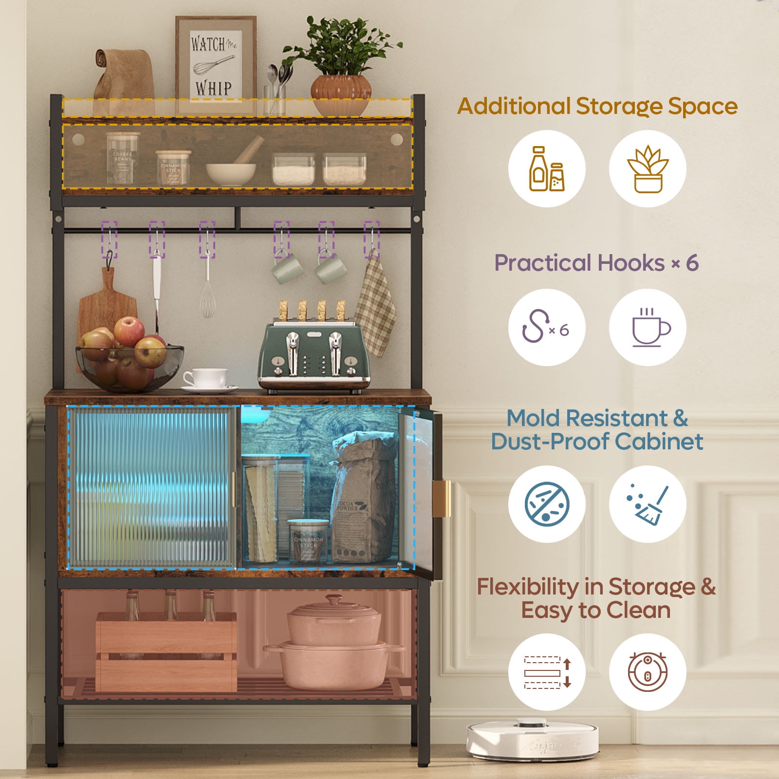 This 5-tier baker’s rack is a multifunctional, space-saving solution for your kitchen. With a robust iron frame and high-quality chipboard, it’s durable and perfect for organizing your essentials. The top shelf is ideal for spices, oils, and beverages, while the acrylic-doored cabinet protects wine from sunlight, dust, and moisture. The bottom shelf is great for fruits and vegetables, and the height is adjustable for added convenience. The spacious tabletop can accommodate a microwave, blender, and more, with 6 S-shaped hooks for hanging utensils and small items. The rack also features RGB light strips with 7 static colors and 22 light modes, adding a fashionable touch to your living room and providing night lighting for safety. This stylish blend of retro and modern design is not only a kitchen shelf but can also serve as a bookcase, microwave stand, or spice rack.