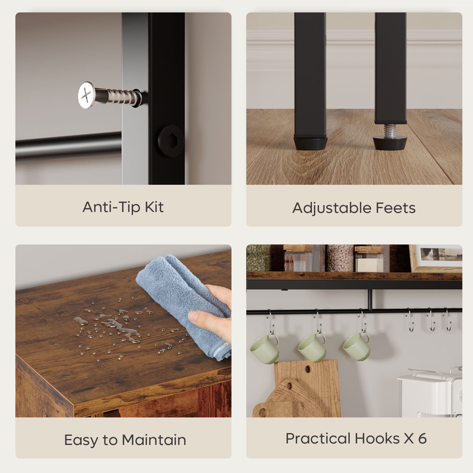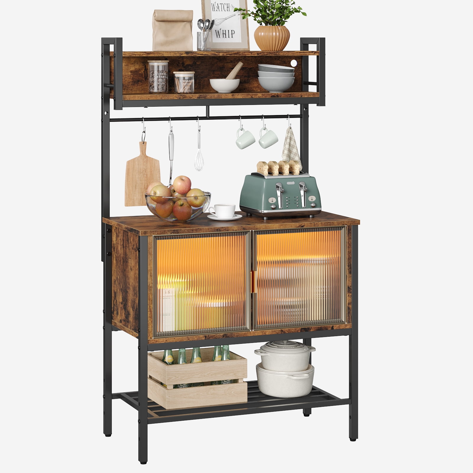 【Space Saving & Multifunctional】- The 5-tier baker’s rack is a multifunctional, space-saving kitchen solution. With cabinets for storage, it’s perfect for organizing spices, oils, coffee, and tea on the top shelf, while the acrylic-doored cabinet is ideal for wine and cookies. The bottom shelf is suitable for fruits and vegetables, and the height-adjustable design allows for a sweeper placement at the bottom. This rack is an excellent addition to any kitchen. 【Storage Rack with RGB Light Strips】- This storage rack equipped with RGB light strips, offers 7 static colors and 22 light modes, adding a fashionable touch to your living room and creating a festive atmosphere. It provides ample storage and countertop space and can double as an elegant bookcase, a handy microwave stand, or a neat spice rack. The light strip also offers nighttime illumination for safety. A multifunctional addition to your home. 【Spacious Countertop & Hutch Style】- The baker’s rack features a spacious countertop, perfect for a microwave, blender, coffee pot, spices, and more. Its hutch style includes 6 S-shaped hooks for hanging utensils and small items. The enclosed cabinet provides a safe storage space for wine and other items, protecting them from sunlight, dust, and dampness. This rack combines style and functionality for your kitchen. 【Essential for Home Organization】- This essential home organization piece features a sturdy iron frame and high-quality chipboard, enhancing the durability of the kitchen storage cabinet. It’s designed to keep your kitchen supplies organized on its spacious coffee stand. With a large storage capacity and a blend of vintage and contemporary style, it’s both functional and aesthetically pleasing. 【Simplified Assembly】- Bestier Baker’s Rack is designed for hassle-free assembly. It comes with a clear manual, installation video, and all necessary hardware for easy setup. We offer a 1-year warranty and lifetime customer service. If you encounter any issues with our microwave stand, please don’t hesitate to contact us. We’re here to help.