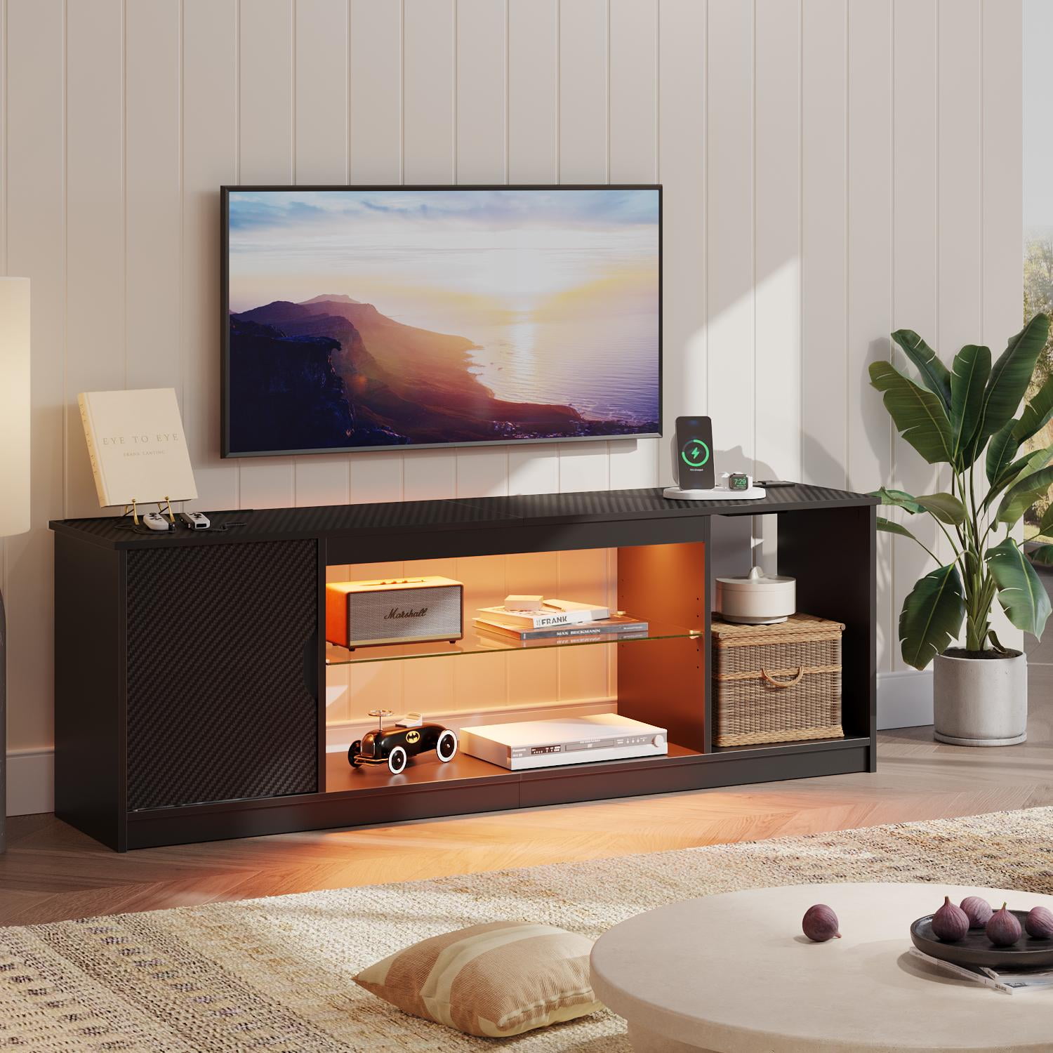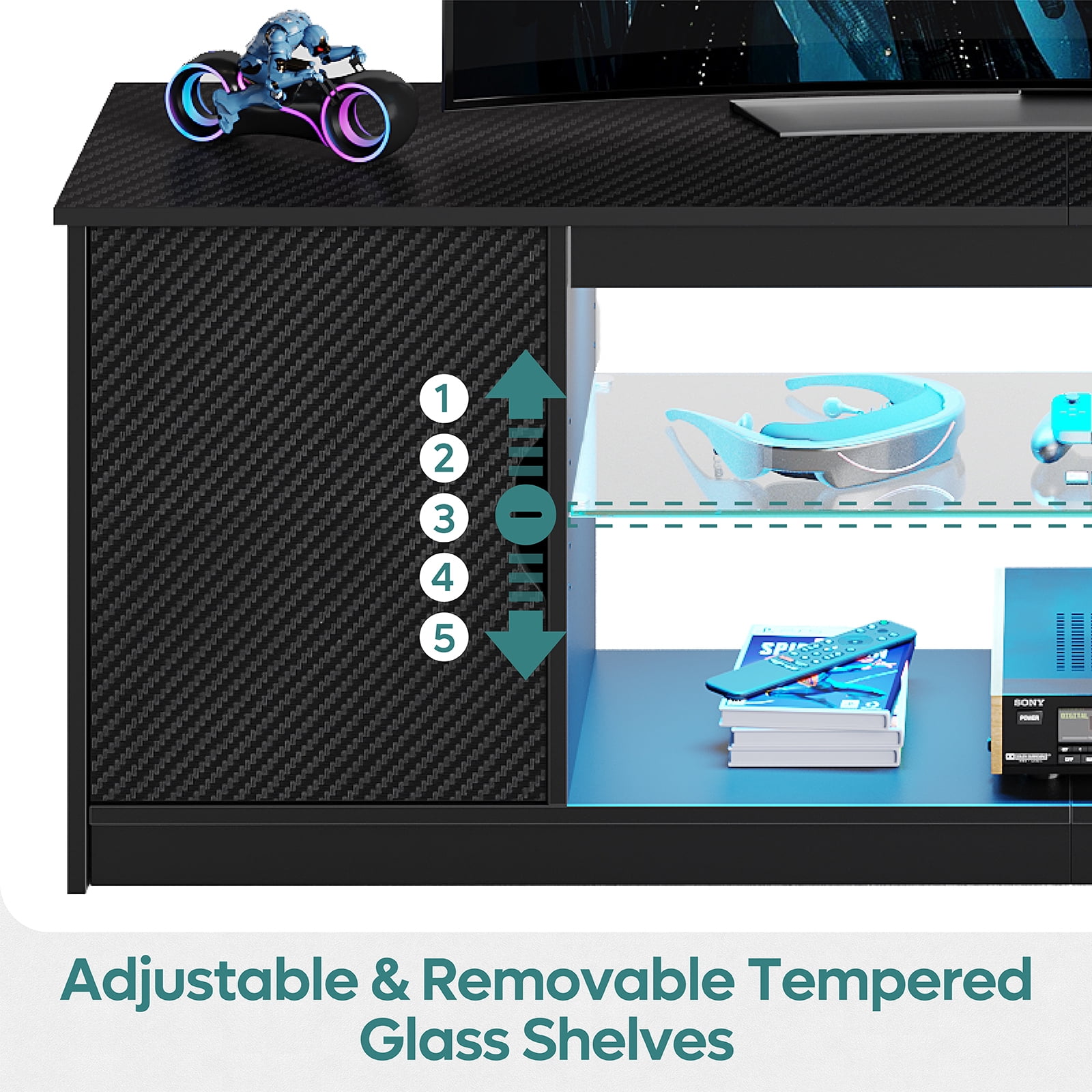 Bestier LED TV Stand for TVs up to 65″, Entertainment Center with Power Outlet & Storage Cabinet, Carbon Fiber