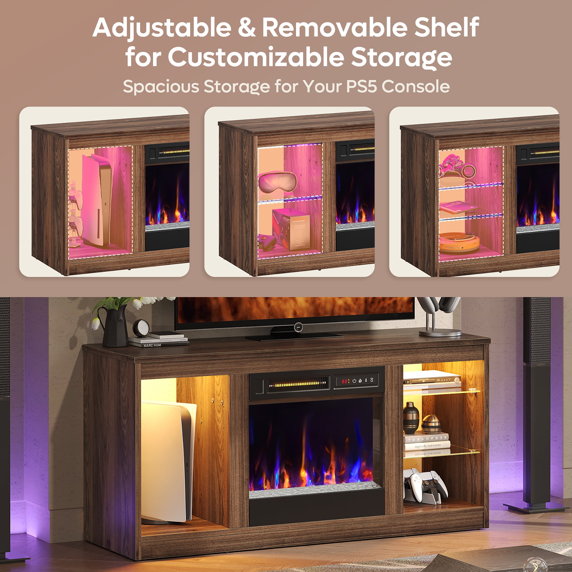 Inserted Electric Fireplace: Experience the warmth of our TV stand with an 18-inch crystal fireplace insert that heats up to 400 square feet of space. Adjustable temperatures range from 62°F to 92°F for your comfort. With 7 flame colors, 5 levels of brightness, and a timer function, it adapts to any atmosphere. Rest assured that it has been rigorously tested and is ETL and FC safety certified to give you and your loved ones peace of mind. LED Lights with Multiple Modes: This TV stand comes with 7 colors of LED lights and 20 dynamic modes to add a splash of color to your free time. The integrated remote control allows you to personalize the fireplace flame and lights. With glass storage shelves paired with LED lights, it easily creates a unique atmosphere that complements any living room style. Adjustable Glass Shelves: Our fireplace TV console features 2 open compartments that provide plenty of room for your PS5 game console, books, DVD player and remotes. With adjustable glass shelves, you can adjust the storage space to your liking. Whether you’re watching TV or playing games, this LED entertainment center enhances your viewing experience. Farmhouse Walnut Texture Style: The Bestier Modern Electric Fireplace TV Stand features a sophisticated walnut texture that blends farmhouse charm with modern elegance. Its versatile design complements most family styles, making it a stylish and functional focal point in your living room. This unique texture adds warmth and character to any home decor. Durable and Sturdy Construction: Standing at 23.3 inches tall, this TV stand is made from high-quality P2 particle board, ensuring durability and longevity. The robust construction provides a stable and reliable base for your TV and other entertainment essentials, fitting TVs up to 55 inches and ensuring it withstands daily use. Clear Instructions for Easy Assembly: This Fireplace TV stand comes with clear step-by-step instructions for quick and easy assembly. You can spend less time installing and more time enjoying your new entertainment center with fireplace and LED lights. The user-friendly design ensures a smooth and easy assembly process. Specifications: Color: Walnut Style: Farmhouse Heating Coverage: 400 square feet Fireplace with remote: Yes (Batteries are not included.) Timer Function: Yes