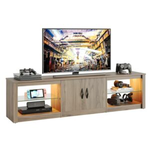 The Bestier TV Stand is a stylish and useful item. It fits TVs up to 75 inches. One special feature is its RGB LED with remote control. This lets you add color to your entertainment area. The stand has 4 open shelves with tempered glass. These offer lots of storage for DVDs, games, pictures, and more. There s also a closed shelf in the middle. This helps keep your room neat and tidy. The TV stand looks good with most home styles. It s a great gift for friends and family moving into a new home.