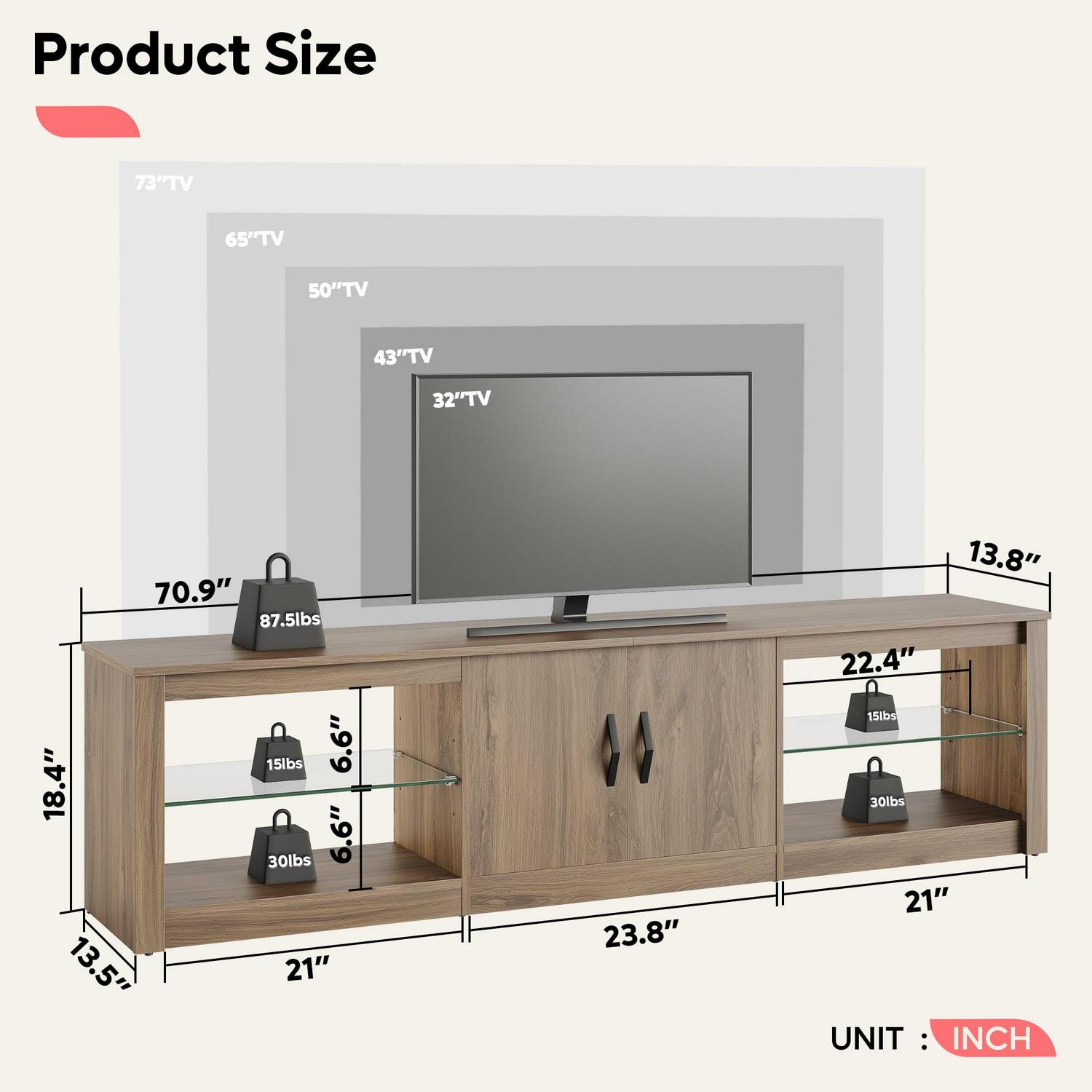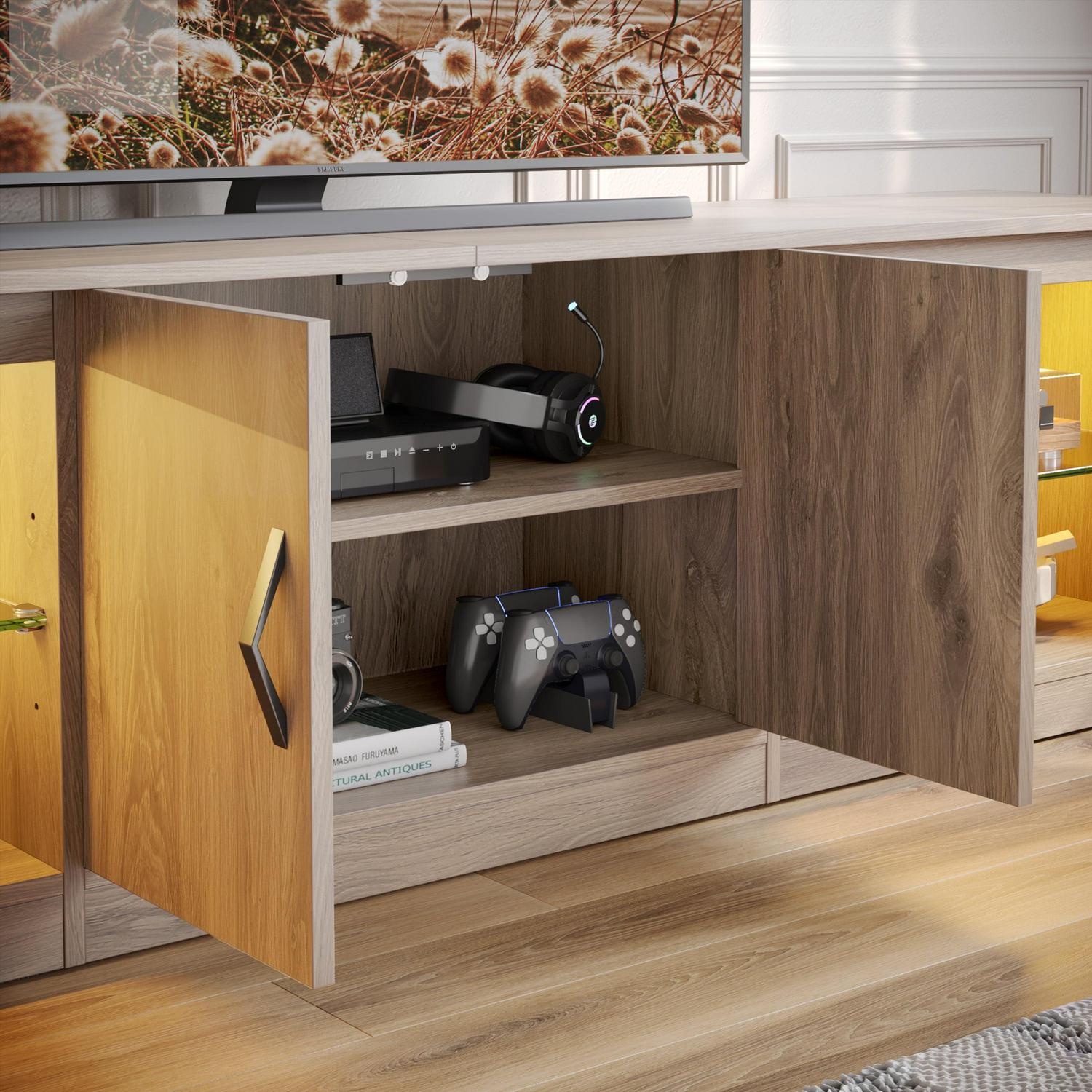 – 70″ TV Stand with Cabinets: 70.8″ L * 13.8″ W * 18.5″ H. Large light up TV console has two cabinets with door in the middle to protect your privacy. Back wire holes inside also help you organize wires and cables.