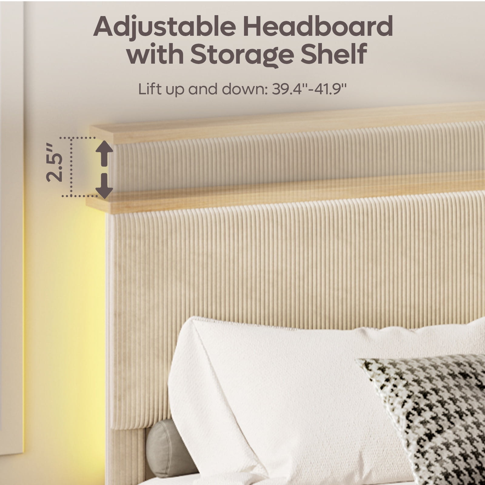 Bestier Queen Platform Bed with Adjustable Storage Headboard Shelf, LED Corduroy Upholstered Bed Frame, Beige Modern & Elegant: Bestier Platform Bed headboard featuring a modern vertical channel design makes a statement in any bedroom space. And luxurious corduroy not only adds softness but also completes your contemporary aesthetic. Adjustable Storage Headboard: This upholstered bed frame with an adjustable headboard from 39.4’’ to 41.9’’. And 4.5 inch widened headboard design of this upholstered bed maximizes space. Store your phone, clock, glasses, and decor on the top shelving. Stay organized! LED Platform Bed Frame: The unique RGB LED light strips on both sides of the headboard support 7 colors and 22 modes, remote controlled, create your favorite bedroom atmosphere. Sturdy & Noise Free: Upholstered Bed Frame engineered with thicken solid wood frames and sturdy end legs. The six self-tapping screws connecting the bed slats, ensuring ultimate stability and durability and minimize any potential for unwanted sounds.The weight capacity up to 1100 lbs. Quick Assembly: Each part of the corduroy platform bed is clearly labeled and numbered on each and you just need to match those numbers in order to assemble. No Box Spring Needed: Require no bulky box spring or extra foundation. After assembling the upholstered platform bed with headboard, just put your latex, foam or spring mattress on the wooden slats, and everything is all set. Click Here To Explore More For Besiter BedFrame Collection