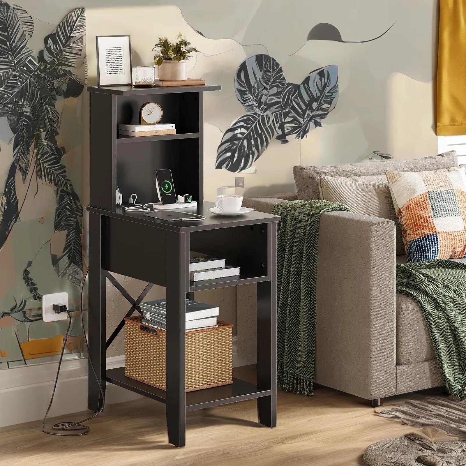 【Bedside Table with Charging Station】: Upgrade your bedside experience with our side table. Featuring 2 AC outlets and 2 USB ports(Only one end table is equipped with charging station), The end table offers seamless charging for your bedside essentials like lamps, smartphones, tablets, and laptops. Enjoy the convenience of charging your devices while relaxing in bed or on the sofa 【Spacious and Versatile Storage】: Our night stand set 2 offers diverse storage solutions for all your needs. With dual-tiered shelves atop, perfect for organizing small accessories like watches and alarm clocks, and a generous tabletop space ideal for iPads, phones, and beyond. The open cabinet conveniently stores books or bedside essentials, while the lower shelf adds extra display and storage space, enhancing your bedroom organization 【Sturdy and Stable】: Crafted from durable particle board, this black night stands effortlessly supports up to 50 pounds on its tabletop and 15-30 pounds on each shelf, with a total weight capacity of 132 pounds. Enhanced stability is provided by an X-shaped iron frame supporting the bottom shelf, ensuring a steadfast and shake-free experience 【Night Stands for Bedrooms Set of 2】: Measuring 13.4″D x 18.4″W x 36.8″H, this sofa side table boasts a sleek design and perfect height, making it ideal for placement beside your bed or sofa. Offering ample storage space for all your essentials, it seamlessly fits into any room, whether it’s your bedroom, living area, or office, ensuring seamless integration into your living space 【Effortless Setup】: Simplify your installation process with our easy-to-follow assembly instructions. We provide all the necessary accessories and installation instruction, ensuring a seamless setup for your new tall bedside table