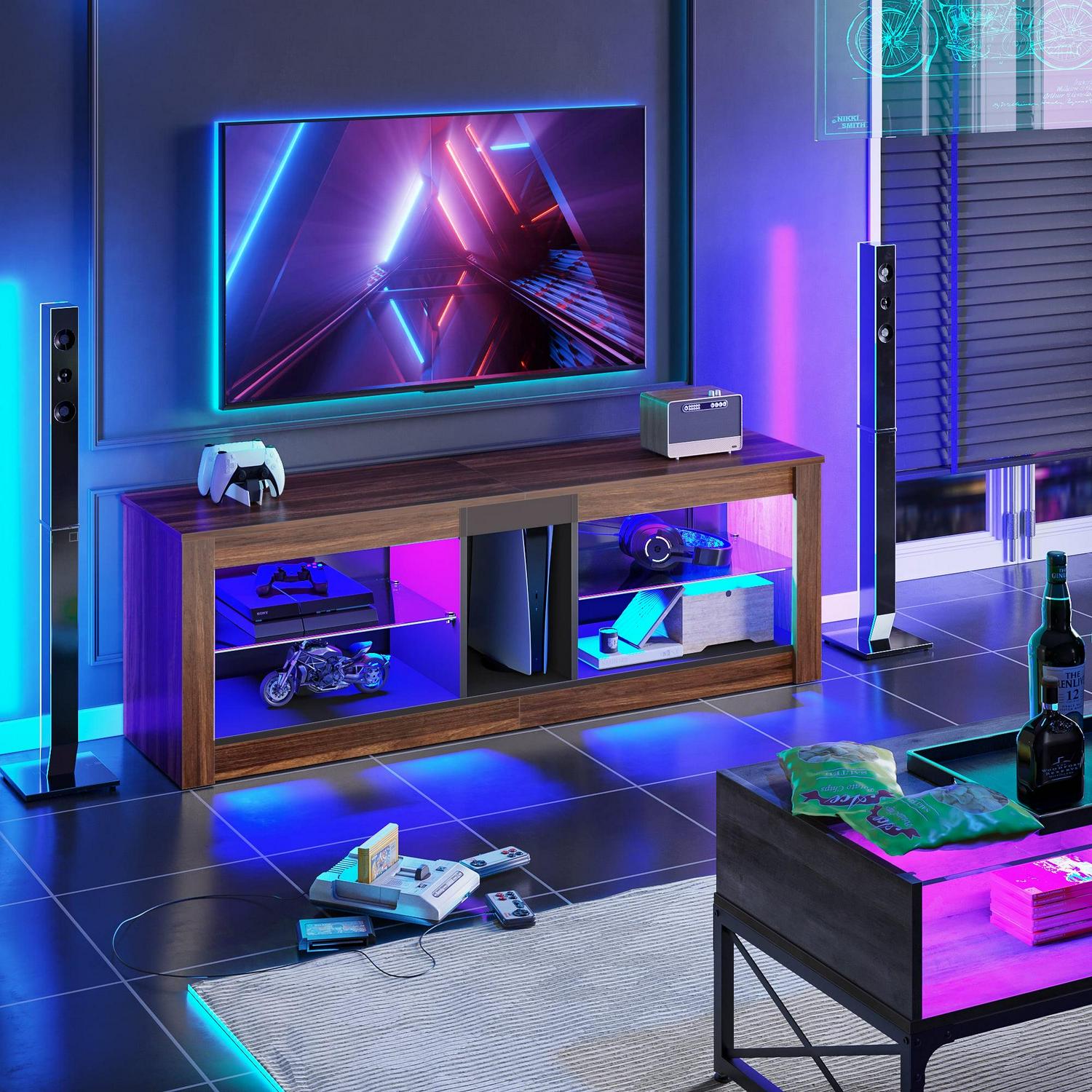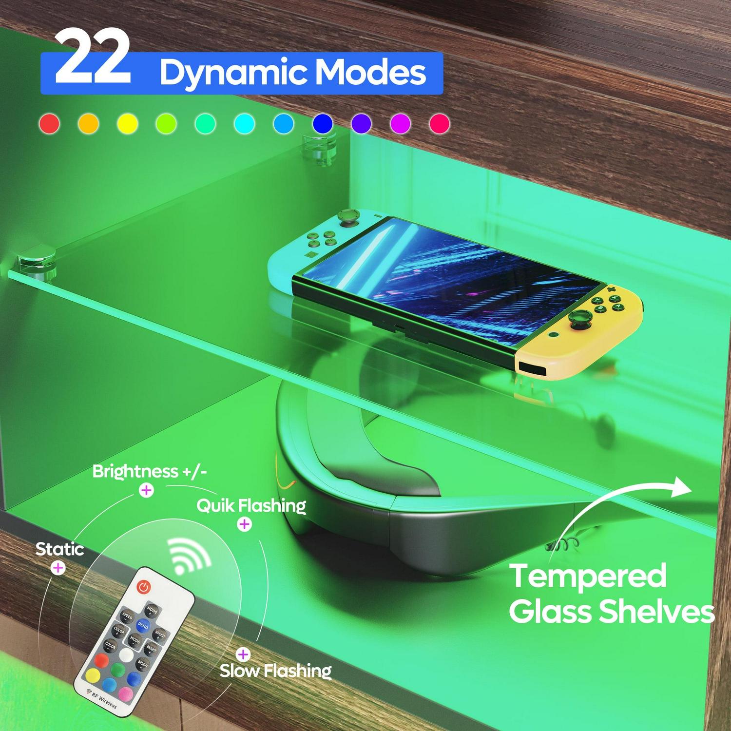 – LED TV Stand: Bestier Gaming TV stand features built-in LED lights that can be personalized using a wireless remote. It offers 7 main colours and 22 display modes to create the perfect ambiance. What’s more, the glass plates can reflect the light, which adds atmosphere in your room.