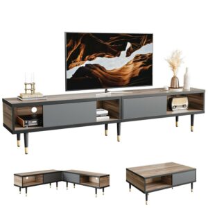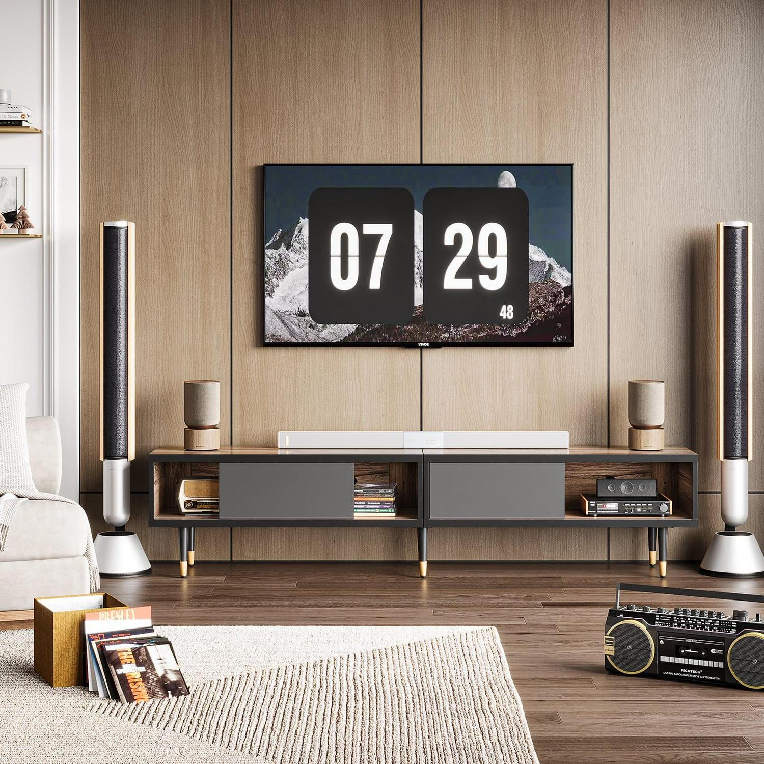 This Bestier 80-inch living room TV stand entertainment center can accommodate a 85 inch TV and has a weight capacity of 100 pounds. It is supported by six metal legs to ensure stability. The material used is CARB-certified P2 particle board, providing excellent safety and durability. It consists of two 40-inch parts that you can DIY according to your preferences. If you don’t want it to be an 80-inch entertainment center, you can transform it into a square coffee table or a corner TV stand. The Cabinet panel can slide freely as needed, and there are holes at the back for better cable management. The included anti-tip kit ensures the safety of your children and the TV, bringing you the best living experience.