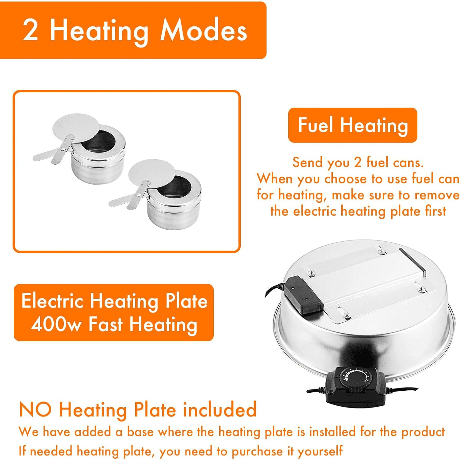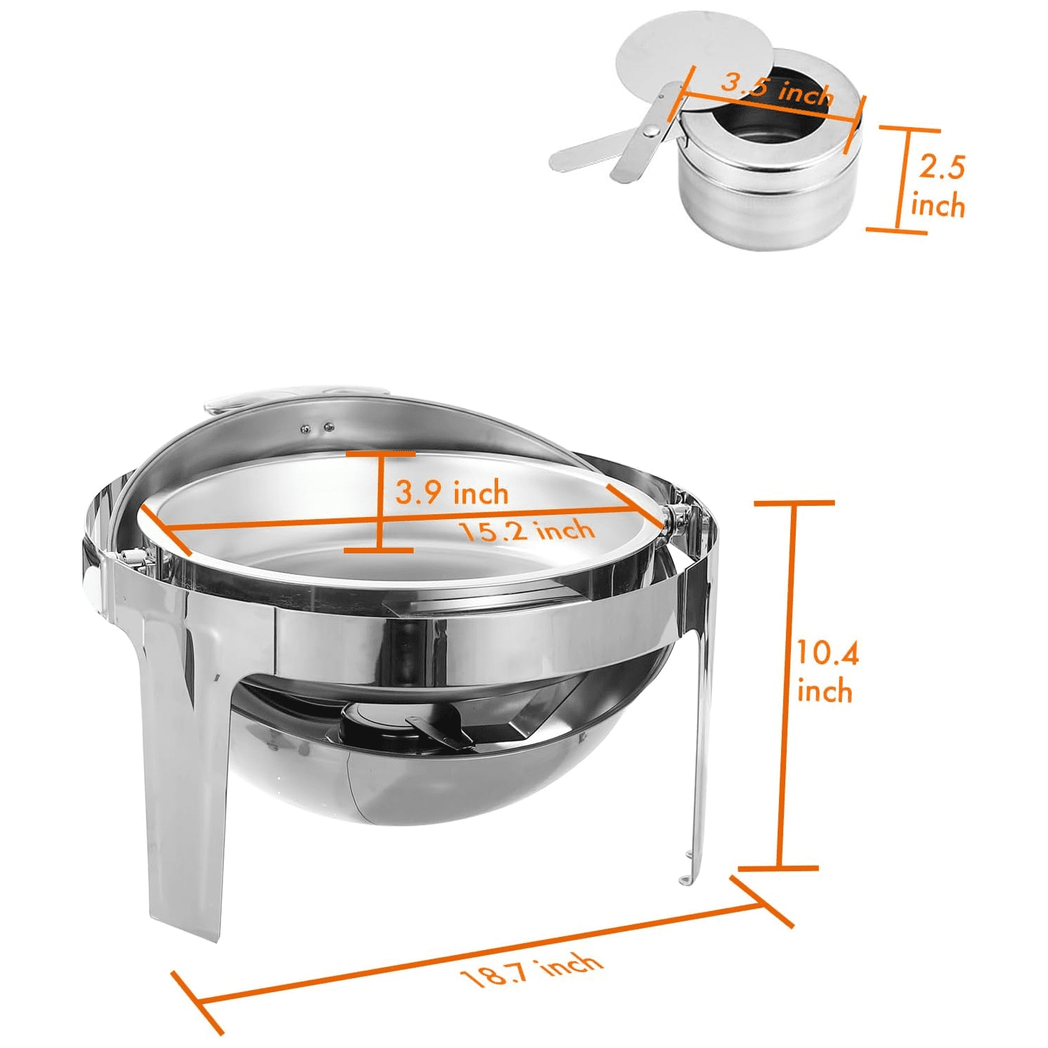 BESTSLE Chafing Dish Buffet Set 🍅【Chafing Dish Buffet Set】- Offers large serving capacity. Consists of 1 food pan, 1 water pan, 1 fuel holder. Overall Size:18.1”L x 11”H. Food pan size: 14.1”L x 2.5” H. Water pan size: 14.1”L x 4.1” H. Weight: 15 lbs. Each dish could hold 6 quart 🎂【90/180° ROLL TOP & Glass Window】- 180° full opening or 90° intermediate opening options , upgraded bearing makes opening and closing easy, provides convenient serving.So you don’t have to put the lid back and forth. And the lid is designed with high quality bearings, which can help the round chafing dish reduce noise and operate smoothly(NOTE:Excluding heating plates) 🍤【Maintain Food Temperature】-Chafing dish has a bottom tray that can support two fuel burners which is is perfect for buffet serving and other situations where you want to keep food warm for extended periods of time. Roll top lid with a T-shaped handle for easy opening and closing, improves the convenience for guests serving themselves and reduces the risk of accidental burns from coming into contact with hot food 🍥【Delicious Visibility】-Chafing dishes Made of food-grade stainless steel, it features safety and durability. Rust-proof and heat or cold resistant features allow longer service life. The precise hemming process prioritizes safety, allowing you to handle them without concern for accidental cuts.While ensuring the food remains uncontaminated 🍝【Wide Application】-This durable chafing dish maintains foods at just the right temperature and can keep food hot or cold for hoursChafer will make your guests full of praise. The bright polished mirror finish will sparkle and reflect the surrounding ambient lighting for an elegant visual effect. This stainless steel chafing dish is perfect for catering, parties, hotels and weddings