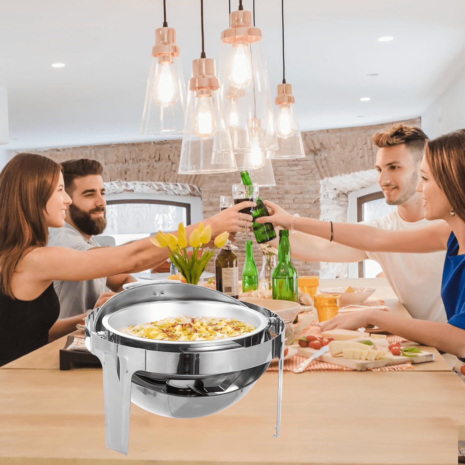 BESTSLE Chafing Dish Buffet Set The 6L round chafing dish buffet set features with transparent glass lid which can see what is in the pans without opening the lid when keeping warming. And the vents on the lid keep the air circulating inside the pan to keep the food fresh.We have added A removable lid holder on the side where you can put the lid on the shelf, and the drip tray avoid dripping water vapor on the table, cleaner and safer. It is perfect for wedding, party ,banquet, catering event etc. Capacity:6L Material: Stainless Steel&PC Product function: keep wam dishes Heating methods: alcohol & electric