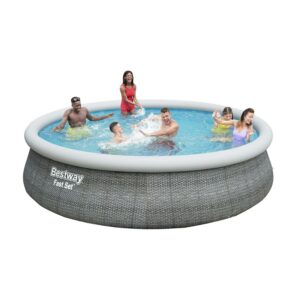 The Bestway fast set pool is quick and easy to set up, and it doesn t require any tools to get the job done. The sturdy TriTech liner is made out of a durable material that is reinforced for strength and puncture-resistance. This pool set also comes with a filter pump, a ladder and a pool cover. When the season s over, storage is fast and simple. The water releases easily through the flow control valve, and then the pool can fold up for compact off-season storage. Start the summer off right with a fast set pool. Warning: Choking hazard – small parts. Not for children under 3 yrs. Caution: This ladder is designed and manufactures for a specific pool wall height and/or deck of the pool.