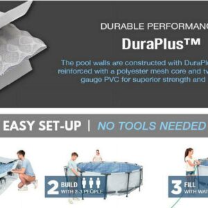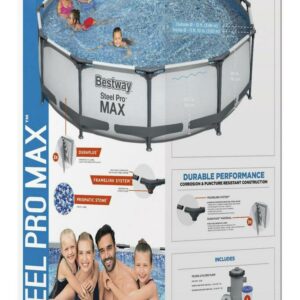 Bestway gives you the most cost effective way to bring a durable long lasting swimming pool to your backyard. The 12’x32″ Steel Pro Frame Above Ground Swimming Pool sets up in 60 minutes or less and includes everything you need to begin your swimming fun. With proper maintenance and care your 12’x32″ Steel Pro Frame Above Ground Pool will give you years of enjoyment. The strong and rust resistant metal frame pools are wrapped with heavy duty PVC and polyester 3-Ply walls. At the end of the season draining your pool is made easy with the attached Flow Control Drain Valve. The valve can attach to your garden hose so water can be drained away from your home. Your pool comes with a 330 Gallon Filter Pump and Filter Cartridge, Heavy Duty Repair Patch and free DVD detailing pool set up and maintenance. Order today!