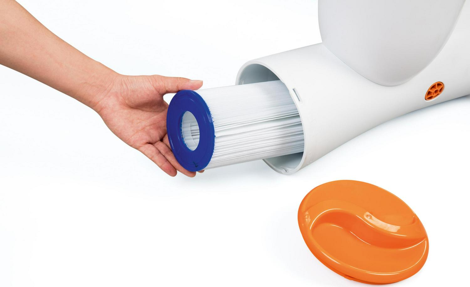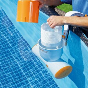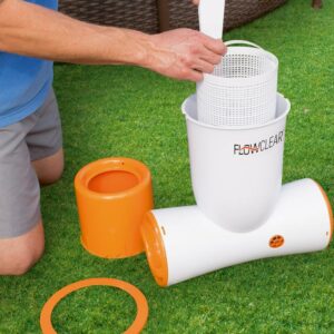 The Flowclear 1050 gal Skimatic Filter Pump is an above-ground pool pump filtration system combining a surface and water skimmer with no extra hoses needed! This innovative pump by Bestway is simple and easy to install in your above ground pool* simply hang it over the edge of the pool, plug it in, be sure it is immersed in water and watch as it starts to go to work cleaning your pool! Plus, it works silently no more noisy pumps! The Skimatic filter pump has a large capacity tank that sucks in floating leaves and other debris, keeping your pool water fresh and clean. The above-ground pool pump can be cleaned with a water hose daily just be sure you have it unplugged before you do any maintenance on the pump. It utilizes #58012 filter cartridges, which we recommend changing every 2 weeks for optimal use. For use with 1,100-31,700 L (300-8,400 gallons) pools. You will love your Skimatic Filter Pump! *For use with all above ground pools except Steel Wall Pools.