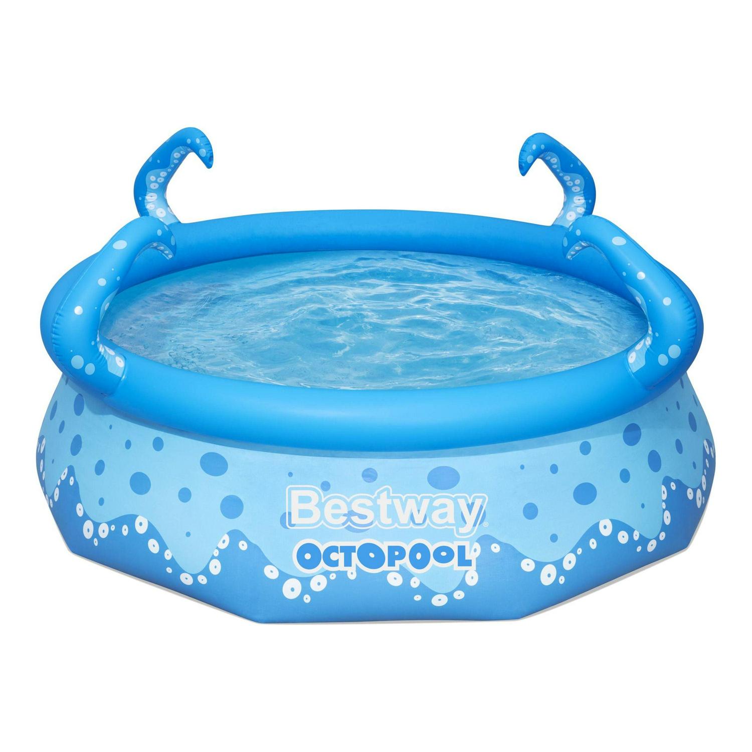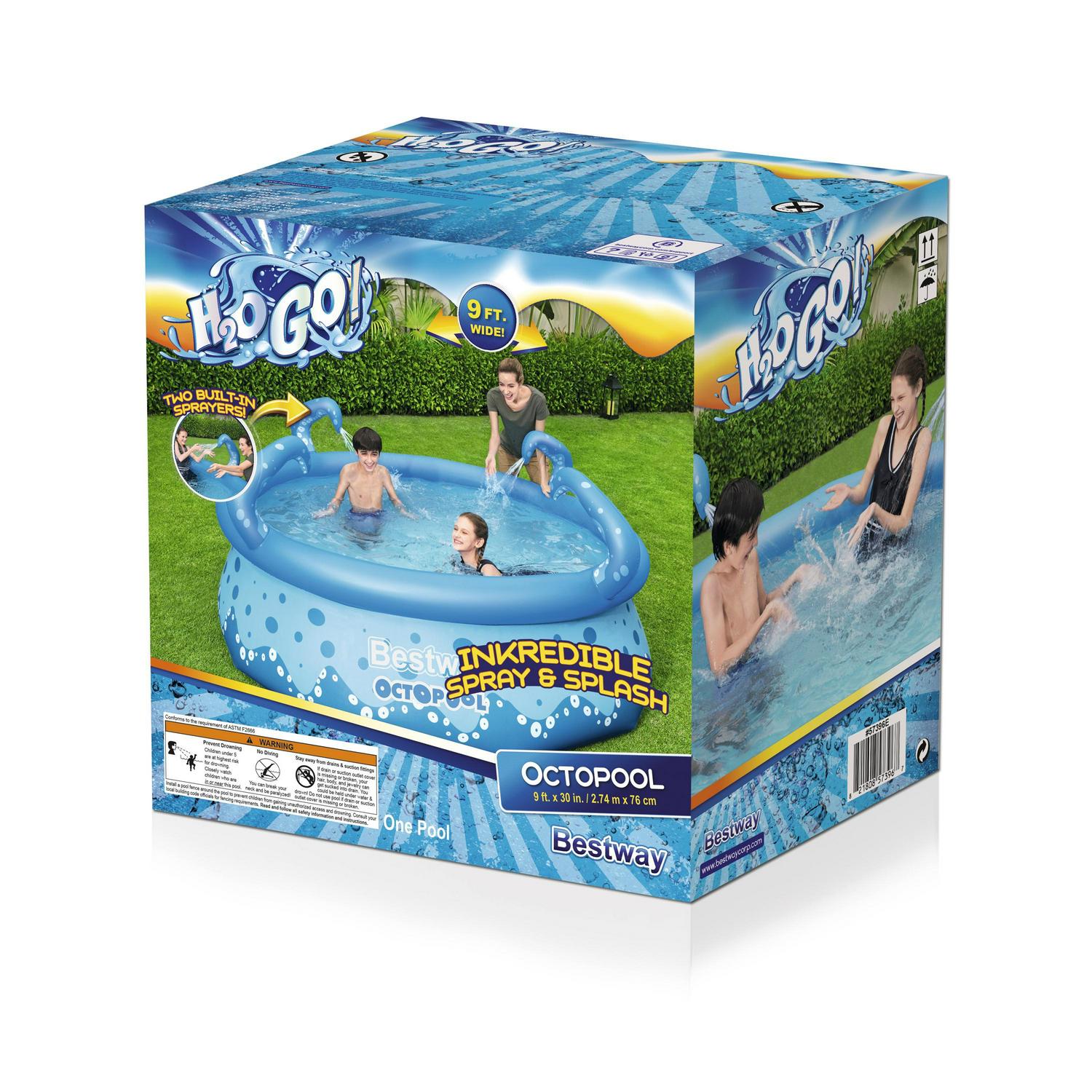 The H2OGO! OctoPool is a fun twist on the traditional Bestway Fast Set pool. With an inflatable top ring, the pool liner rises as its being filled with water. All you have to do is place it on a flat, level surface. The OctoPool features four tentacles, two of which are also built-in sprayers for an incredible time splashing in the water! This pool also features our Tritech liner, which is an extra durable and puncture-resistant material so the fun can last all summer long. The H2OGO! OctoPool is simple to set up, take back down and easy to store during the off-season. WARNINGS: Keep children under supervision in the water. No diving. Do not set up pool on sloping ground.