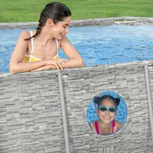 Enjoy a summer full of fun with the Bestway Power Steel Swim Vista Above-Ground Pool. Back and better than ever, the Swim Vista Series offers a truly unique pool experience. With reinforced, fortified portholes built into the sides of the pool, swimmers can wave and make silly faces as they paddle by. These windows allow parents to easily keep an eye on the kids as they dip and diver underwater. Your energy-filled kid will be swimming laps in no time with the minimal-tool setup process. Featuring an ultra-durable construction, this outdoor pool is made with a corrosion-proof steel frame equipped with a Seal and Lock System for a secure connection. Sturdy, Tritech liner design is made of high-quality 3-layer materials reinforced for strength and resist punctures, ensuring your pool will last summer after summer. Including a filter pump, ladder, and a secure pool, you’ll have everything you need for a perfect day in the sun. The pool has a Chemconnect dispenser that maintains clean, healthy pool water by providing a stable level of chlorine evenly dispersed throughout the pool. Splash the day away in the Bestway Swim Vista Swimming Pool.
