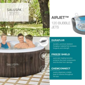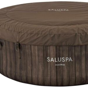 After a long day, there s nothing more relaxing than sinking into warm, bubbling water right in your own backyard. The SaluSpa Madrid AirJet provides an enhanced, soothing massage experience for up to 4 people, while still being quick and easy to set up. Simply attach the pump and watch as it inflates. Control at Your Fingertips: This unique 177 gal. inflatable hot tub can be controlled from your smart device through the Bestway Smart Hub App, reaching a maximum temperature of 104 F . This new innovation makes the Madrid one of the most convenient spas on the market. The app lets you set your spa to the perfect temperature, activate the Power Saving Timer, run the water filter and control the AirJet massage system – all from the palm of your hand. Soothing Massage System: The AirJet system features 120 jets which release bubbles from the bottom of the spa to create a warm, bubbling hot tub environment. These soothing bubbles will help you relax and unwind right from the comfort of your home. Designed to provide the ultimate comfort and relaxation experience, this massage system features two intensity levels, so your relaxation time is completely customizable. Durable Construction: This spa s inflatable walls are made of durable, puncture-resistant, DuraPlus material which prevents damage. This type of internal construction prevents stretching and expansion, allowing the spa to retain the same shape no matter how many times it’s inflated and deflated. The included Freeze Shield automatic heating function prevents inner components from freezing during colder temperatures ensuring you can enjoy your spa year after year. Contents: Equipped with a pump that quickly inflates the spa, heats it up, runs filtration and controls the massage system, this spa is both easy and convenient. The pump can easily be reached from inside the spa and features cup holders for drinks and snacks. Also included is a ChemConnect dispenser that maintains clean, healthy water by evenly dispersing the proper amount of chlorine. To top it all off, the Madrid spa comes with a reinforced cover that locks in heat while not in use, as well as keeping dust and debris from collecting on the water.
