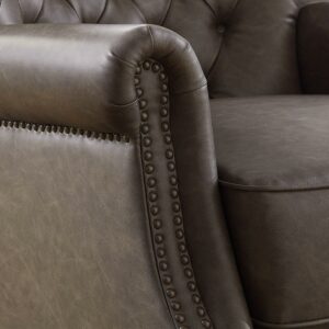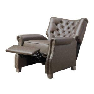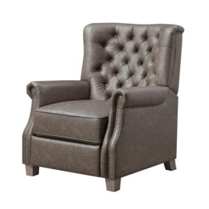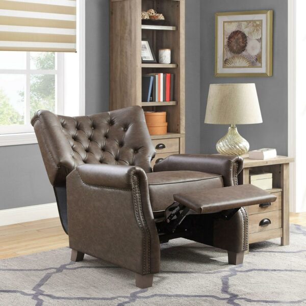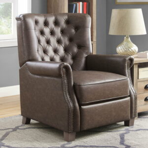 – This elegant recliner features a contemporary button-tufted chair back design and stylish nailhead trim that brings a classic touch to this modern chair.