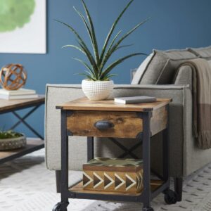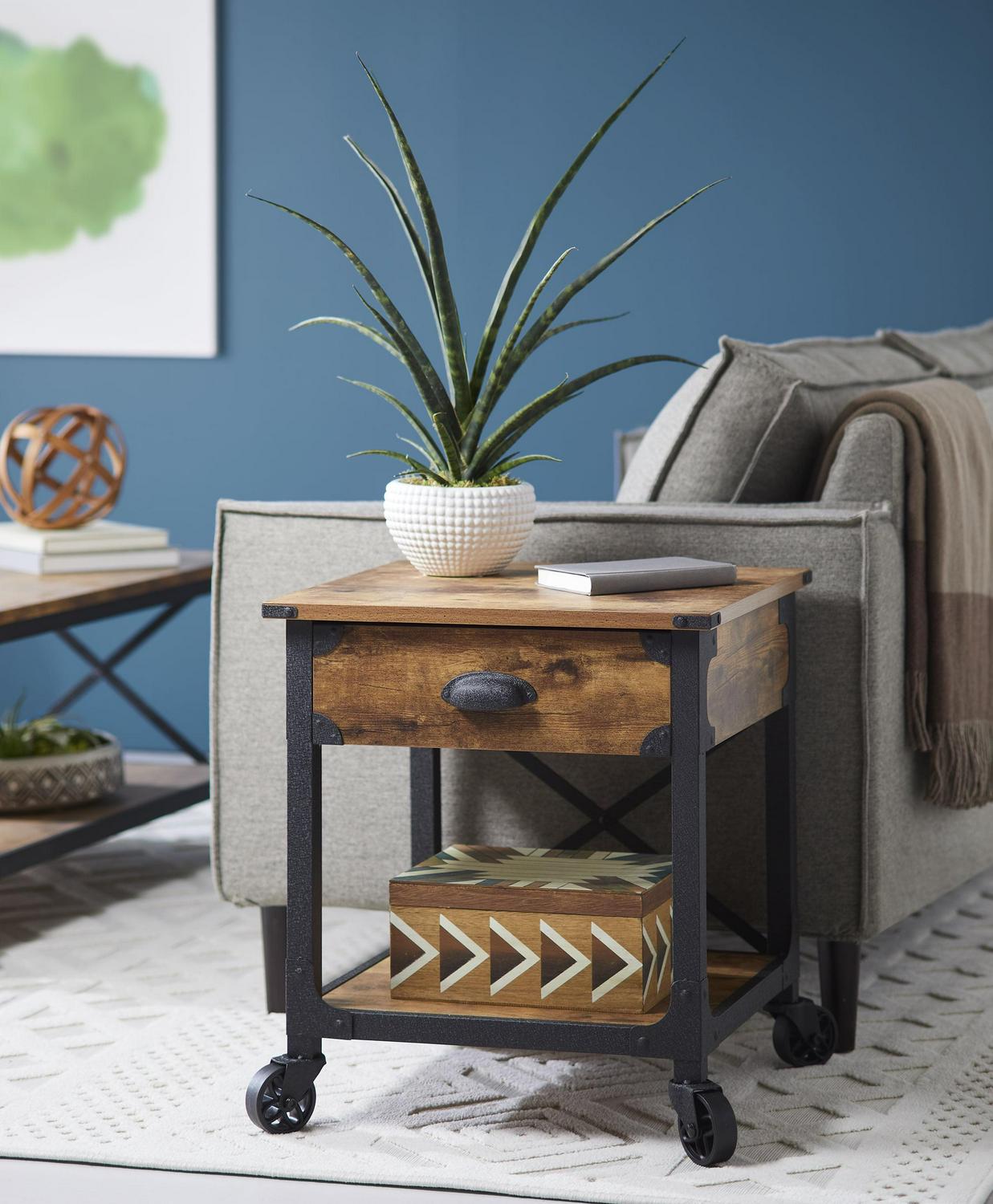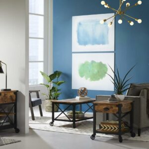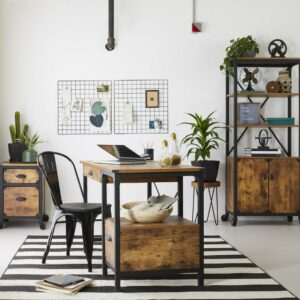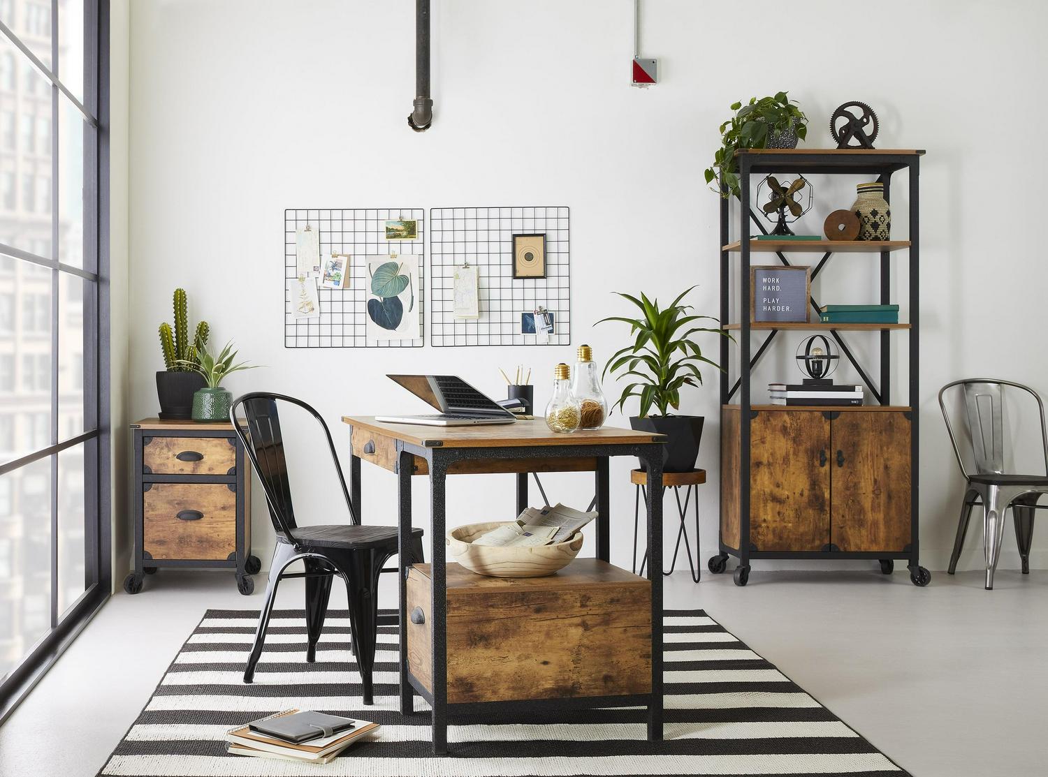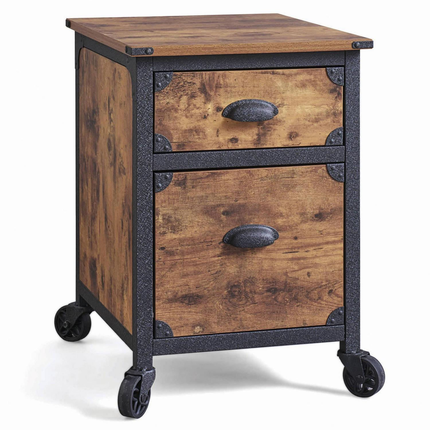 It’s just what you might expect! This Better Homes & Gardens Rustic Country file cabinet brings a rustic, country feel with a touch of industrial to your home office. A mixed material aesthetic combines textured black powder-coated metal framing, bin pulls, bent corner accents, and fixed wheels with a Weathered Pine finish. This pedestal has two drawers for hidden storage. The lower drawer with full extension slides holds letter-sized files. Make this storage cabinet part of your at-home, country-inspired retreat, any day of the week. The Better Homes & Gardens File Rustic Country File Cabinet comes with the following features finished on all sides for versatile placement; fixed wheels, and the lower drawer holds letter-size hanging files for all your most important documents.