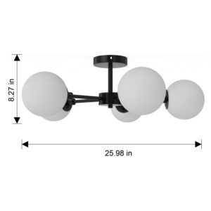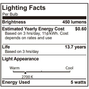 The Better Homes & Gardens fixture is well-designed for your home decoration. With five arms sticking out of the center, branching arms feature five frosted globe glass shades at the ends. This metal light fixture features a matte black finish. The vintage metal ceiling light comes with all mounting hardwired and instructions for quick installation. It is equipped with five dimmable 40W equivalence T6 opal filament bulbs. This decorative bulb is rated to last 13 years based on 3 hours per day use. This light bulb uses only 5 watts of energy to produce light, which is equal to light from a 40W incandescent. Our fixture is ETL listed for your safety. (BHS336179061001)