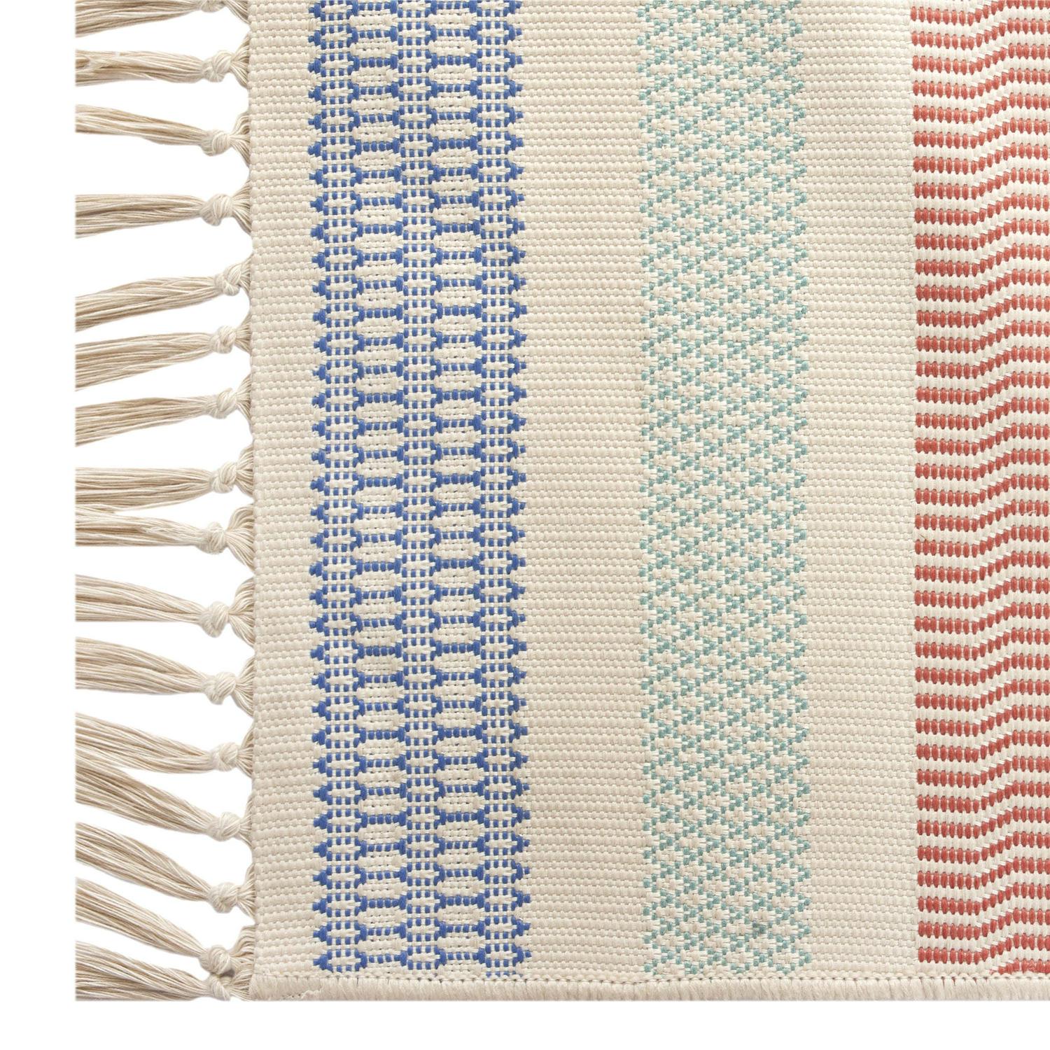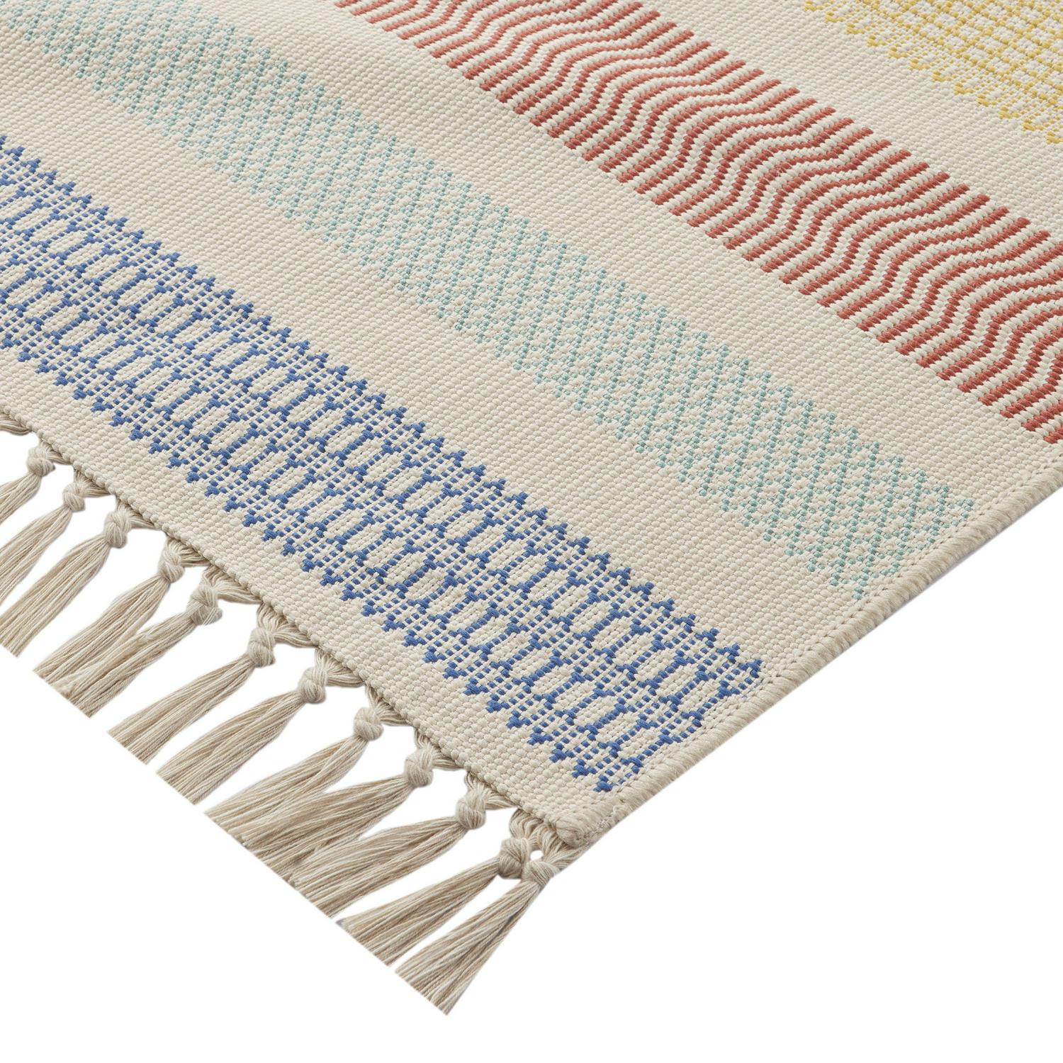 Liven up any indoor or outdoor space with the Better Homes & Gardens Multi-Colored Stripe Rug. The light color palette and tassels add brightness and texture to your floors, while still adding a subtle touch that blends seamlessly with your existing Decor. Made with 100% Polypropylene, this rug is designed to be weather and fade-resistant, ensuring long-lasting style in your home. Easy to care for with a vacuum, broom, or garden hose, the Better Homes & Gardens multi-colored stripe rug is ideal for high-traffic areas in busy households. Available in varying sizes, this rug is perfect for patios, entryways, kitchens, and any other living space in your home.