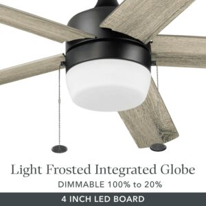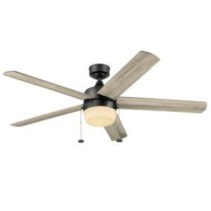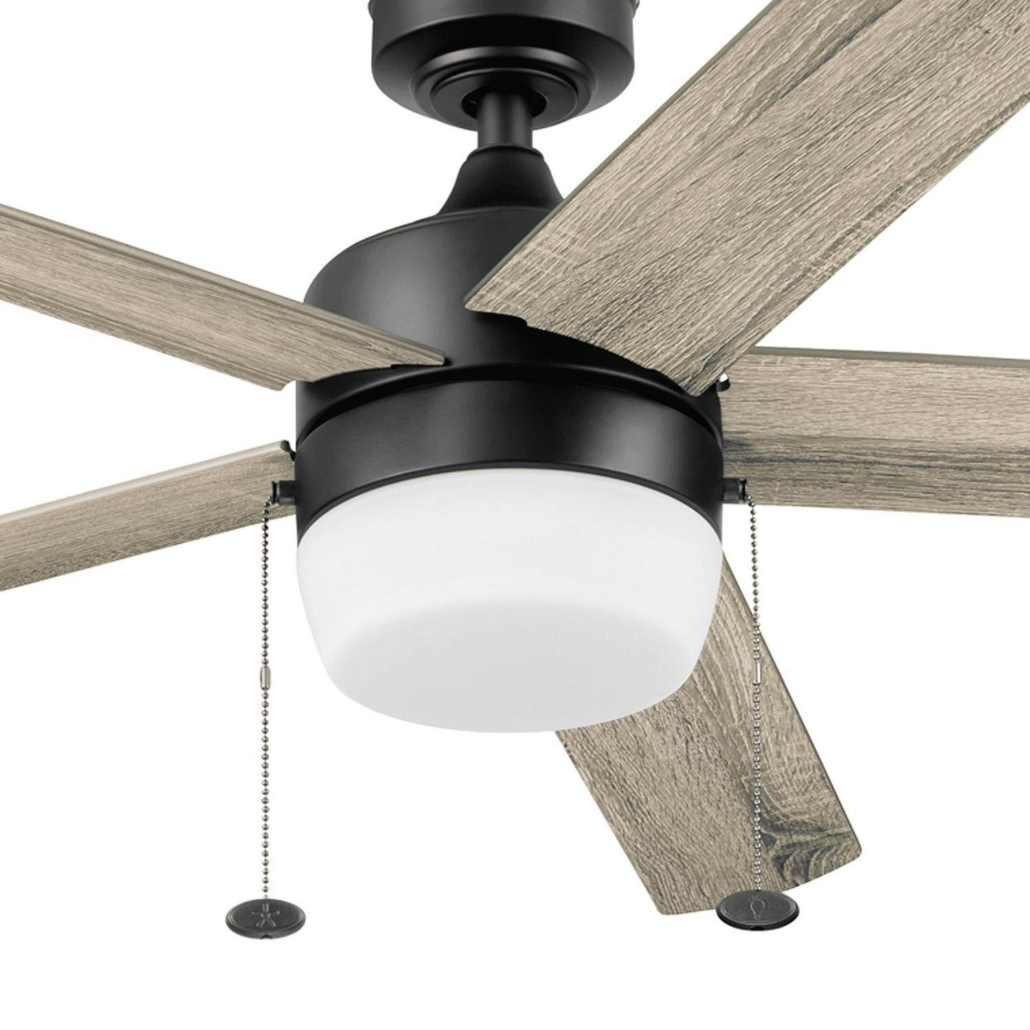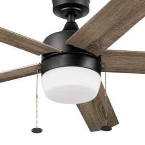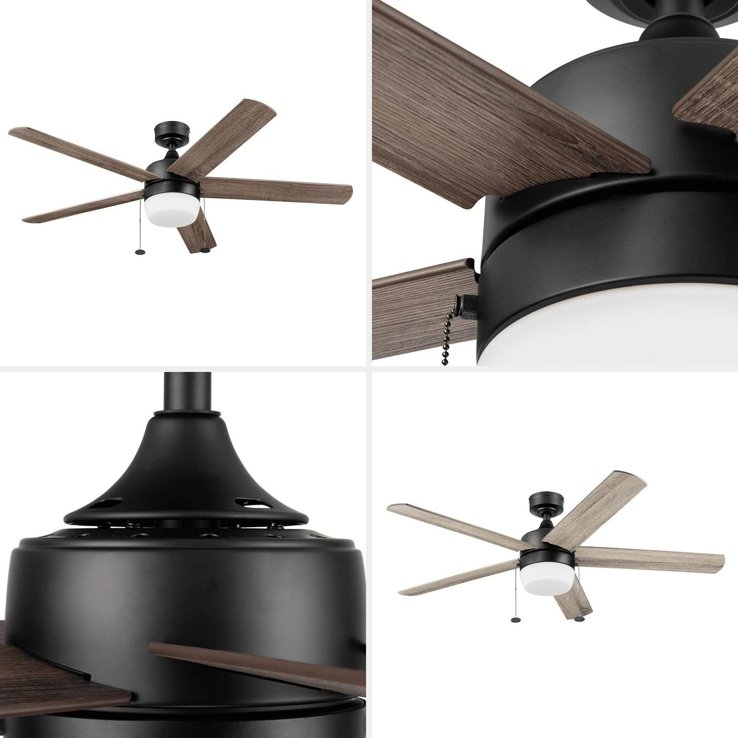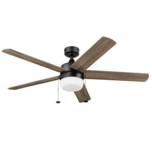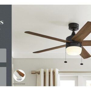This matte black ceiling fan features an integrated LED board with adjustable color changing technology. Use the toggle switch to change the color temperature – choose between Cool Daylight, Daylight, Cool White, Warm White, and Soft White. The 5-blade design provides comforting, adjustable airflow while the LED lights provide ideal lighting for the area. Easily control your ceiling fan’s 3 speeds and turn the light on and off with traditional pull chains. Use the reversible airflow switch to properly distribute air during warmer and colder months. This ceiling fan was created with high-quality materials that are durable and long-lasting and comes with a limited lifetime warranty from the manufacturer. Specifications: Sizing: 52-in 5-blade indoor fan for rooms up to 400 sq. ft. Lighting: 4 inch LED board included that provide 1400 lumens, 16 watts, and adjustable color temperature with 5 color settings (6500k, 5000k, 4000k, 3000k, 3700k)
