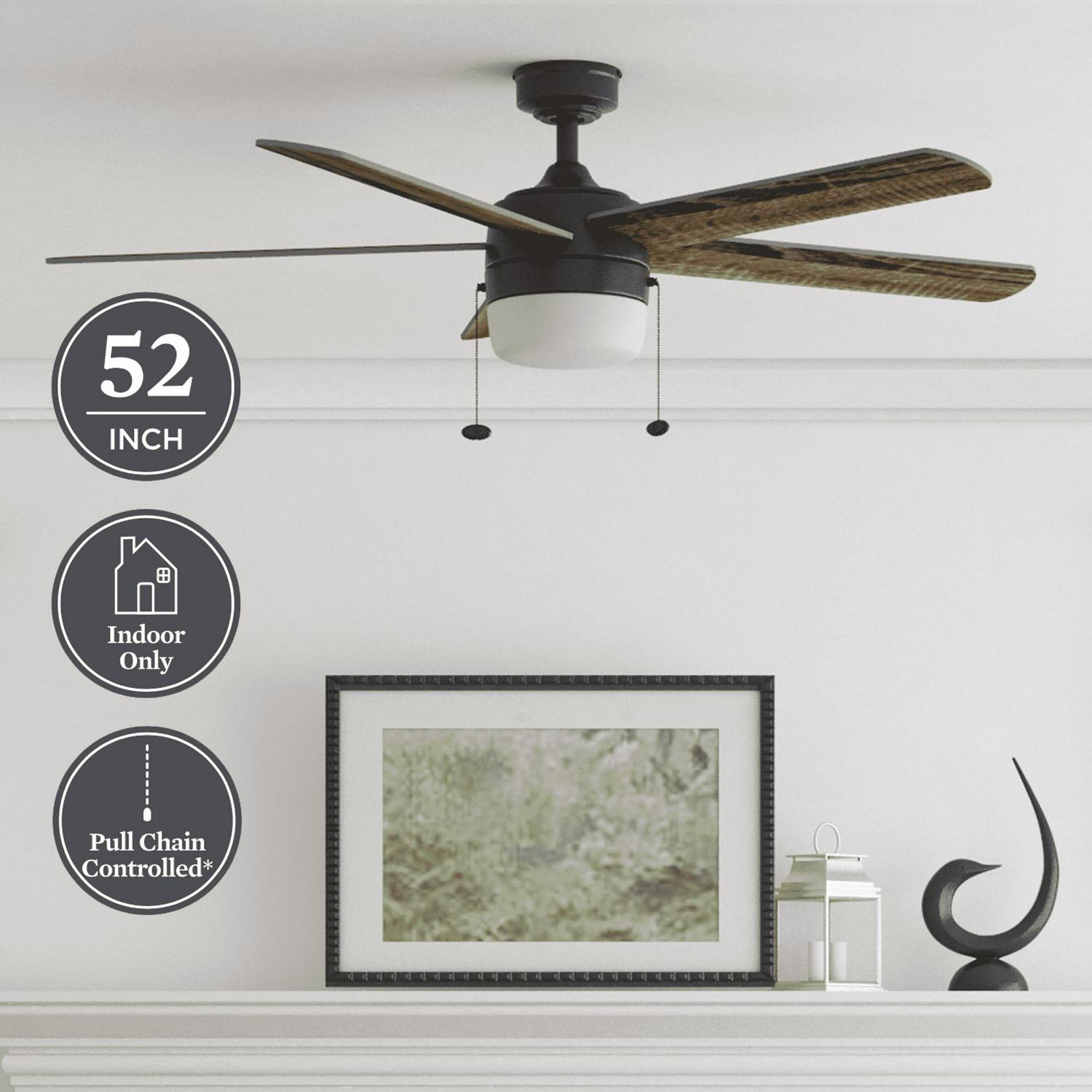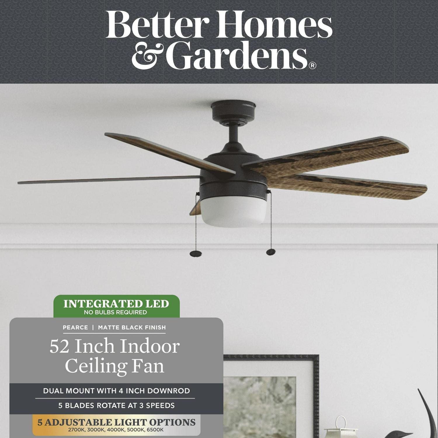 Better Homes and Gardens 52 Pearce Black Indoor Ceiling Fan with Light, Adjustable Color Temperature, 5 Blades, Pull Chains and Reverse Airflow