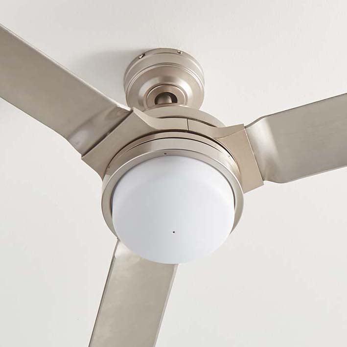 Outdoor, Wet Rated- Great for gazebos and pergolas; 3 Plastic Satin Nickel Blades; Modern, Contemporary Style; Frosted Plastic Integrated Globe; 3 Remote Controlled Speed Settings; Reversible for Energy Savings Throughout Winter and Summer Months; High Quality and Quiet Performance; Energy Star Bulb