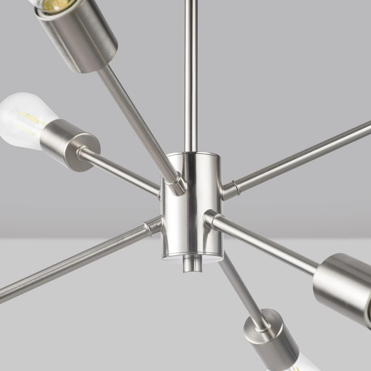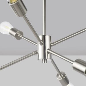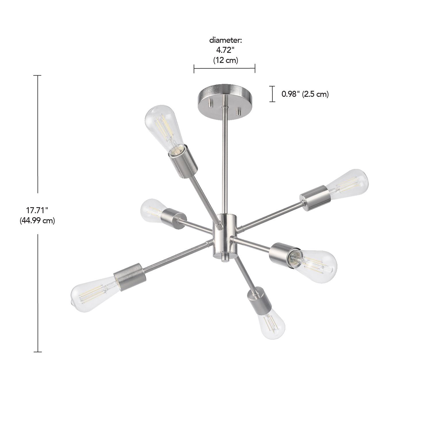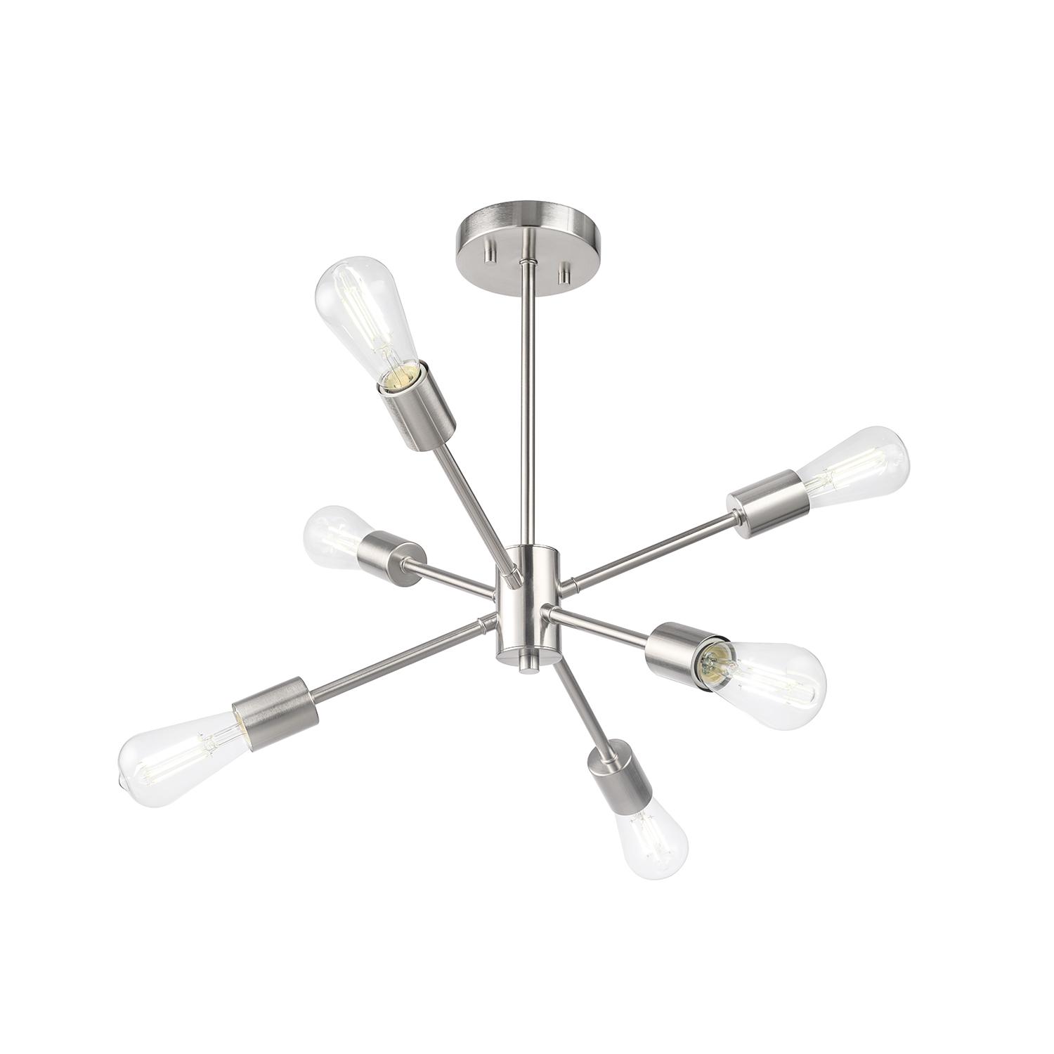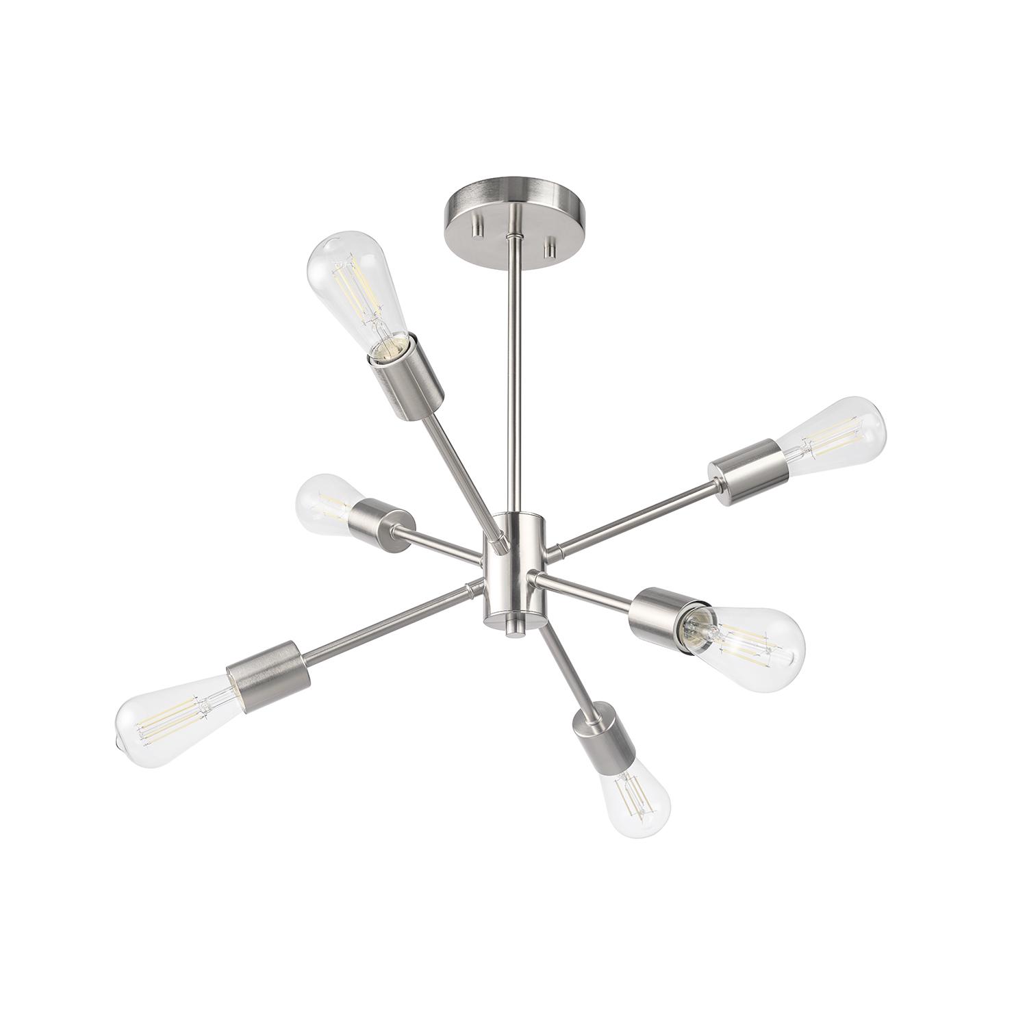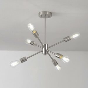 Better Homes & Gardens 6 Lights Semi-Flush Mount Ceiling Light. Modernizing the Sputnik design, uniquely shaped light sockets sprout from a perfectly round center piece and in a stunning Satin Nickel finish. Acting as a flawless centerpiece to any room, this ceiling light can be mounted in your bedroom, living room, or dining room to create dramatic flair. The 6 open socket construction allows you to use the bulbs of your choice. Vintage Edison bulbs create old-school appeal. Designer bulbs offer a unique take on a classic design while Smart Bulbs create lighting ambiance for every mood. With a standard E26 base, the options are truly endless.