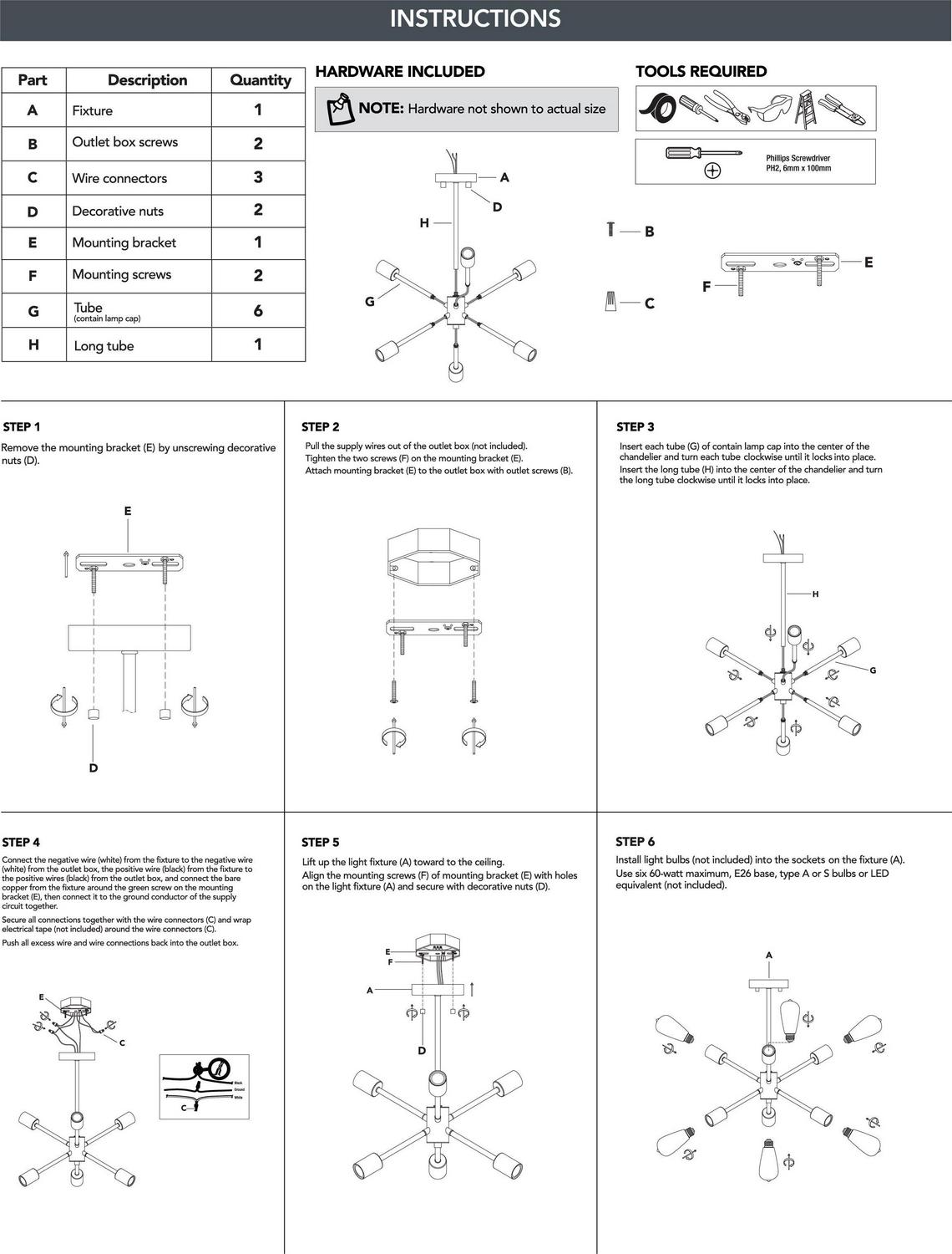 - Features: Bulb requirements 6x E26/Medium Base 60W Max Bulbs (not included)