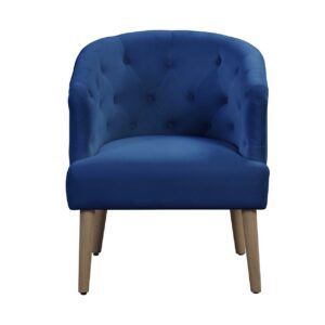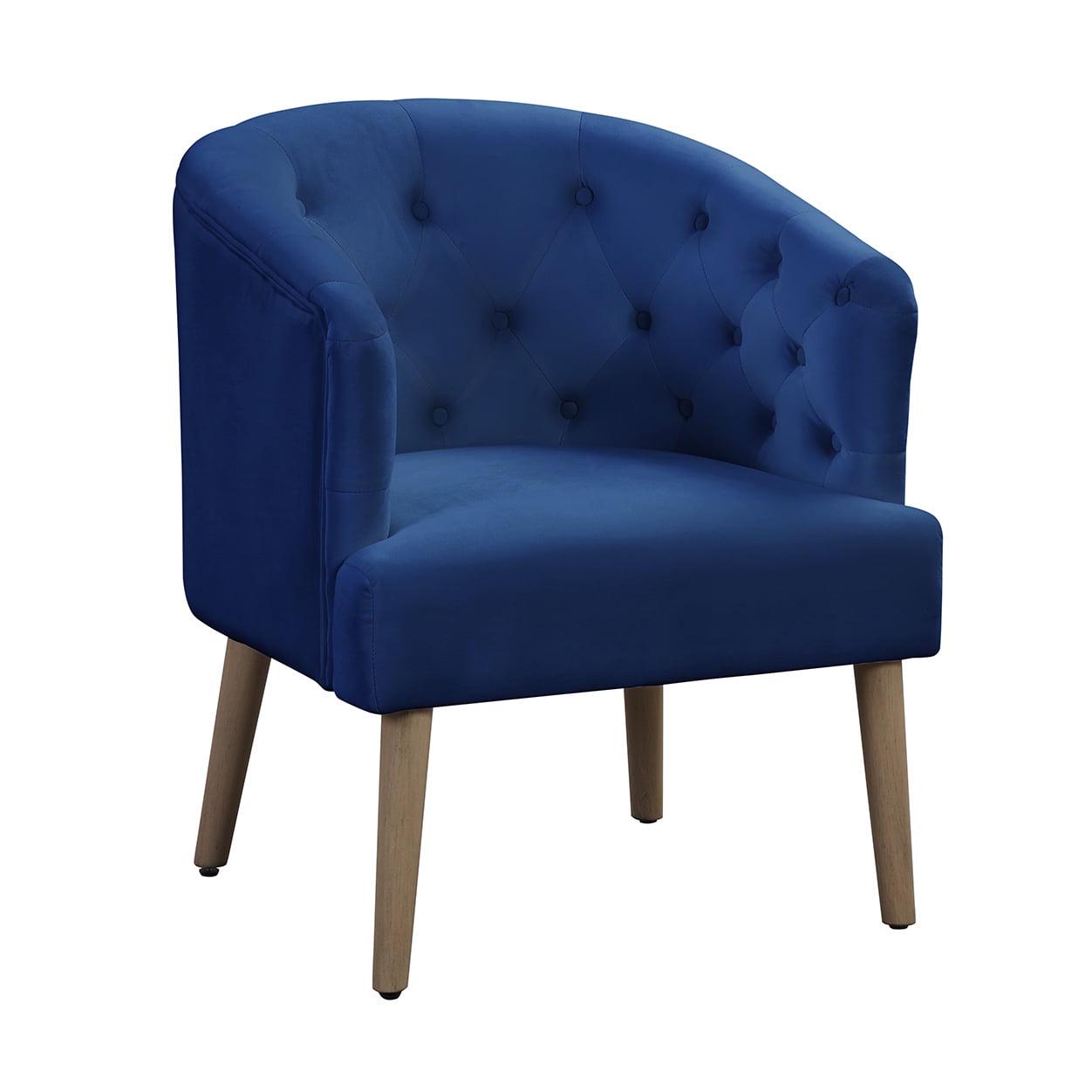 he Better Homes and Gardens Barrel chair is a great chair which is available for your living room, office or anywhere else you need extra seating. Made from sturdy, durable wood, this padded accent chair has a barrel silhouette featuring a curved back accented with diamond-pattern button tufting, and it stands gracefully on four round tapered legs. The fabric is a velvet material that feels soft,comfortable durable. The chair is roomy, the seat is springy and the fabric is comfortable.The height of the sides is perfect for resting your arms on them. This barrel chair is designed to envelop you in comfortable bliss.