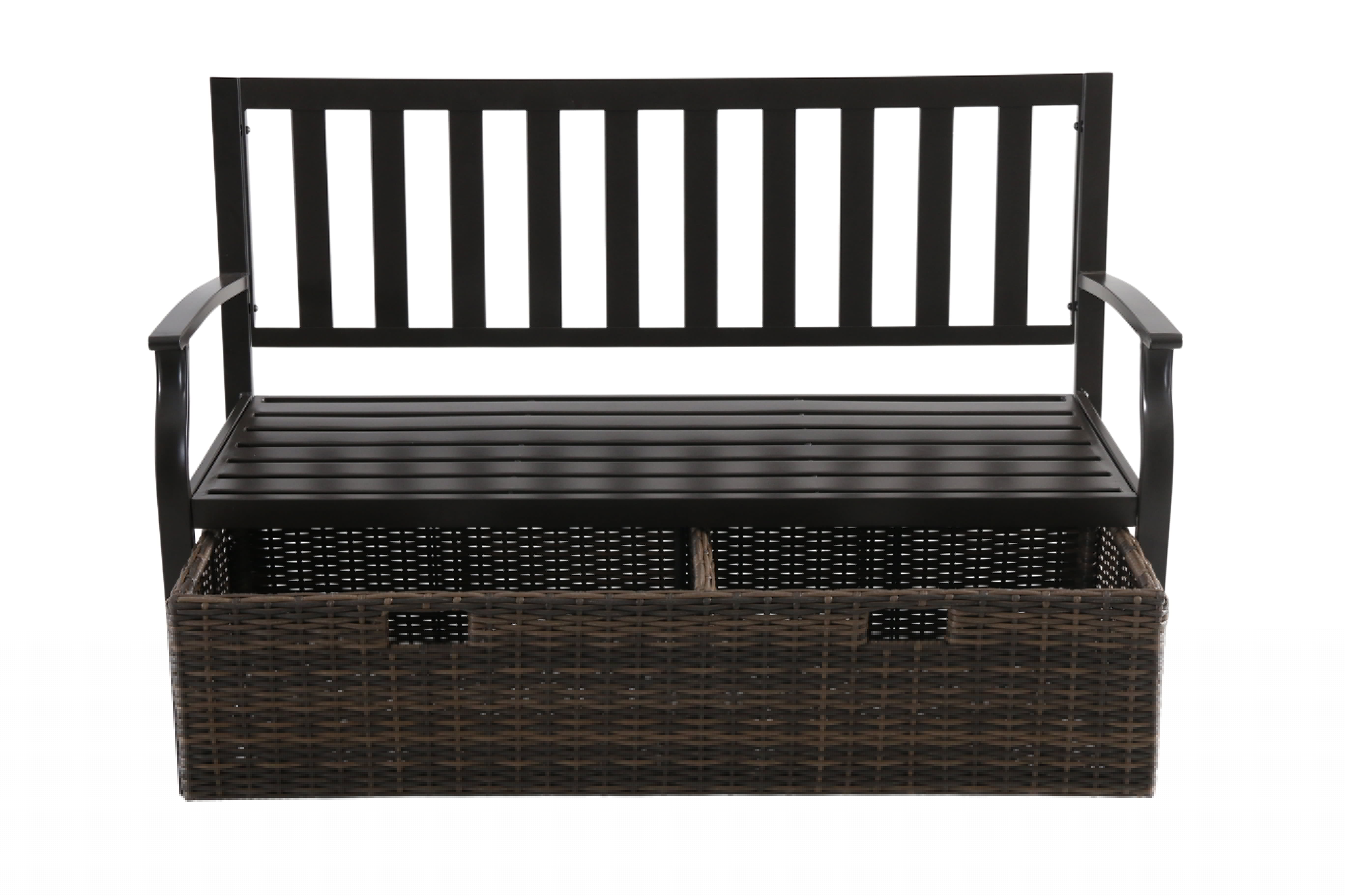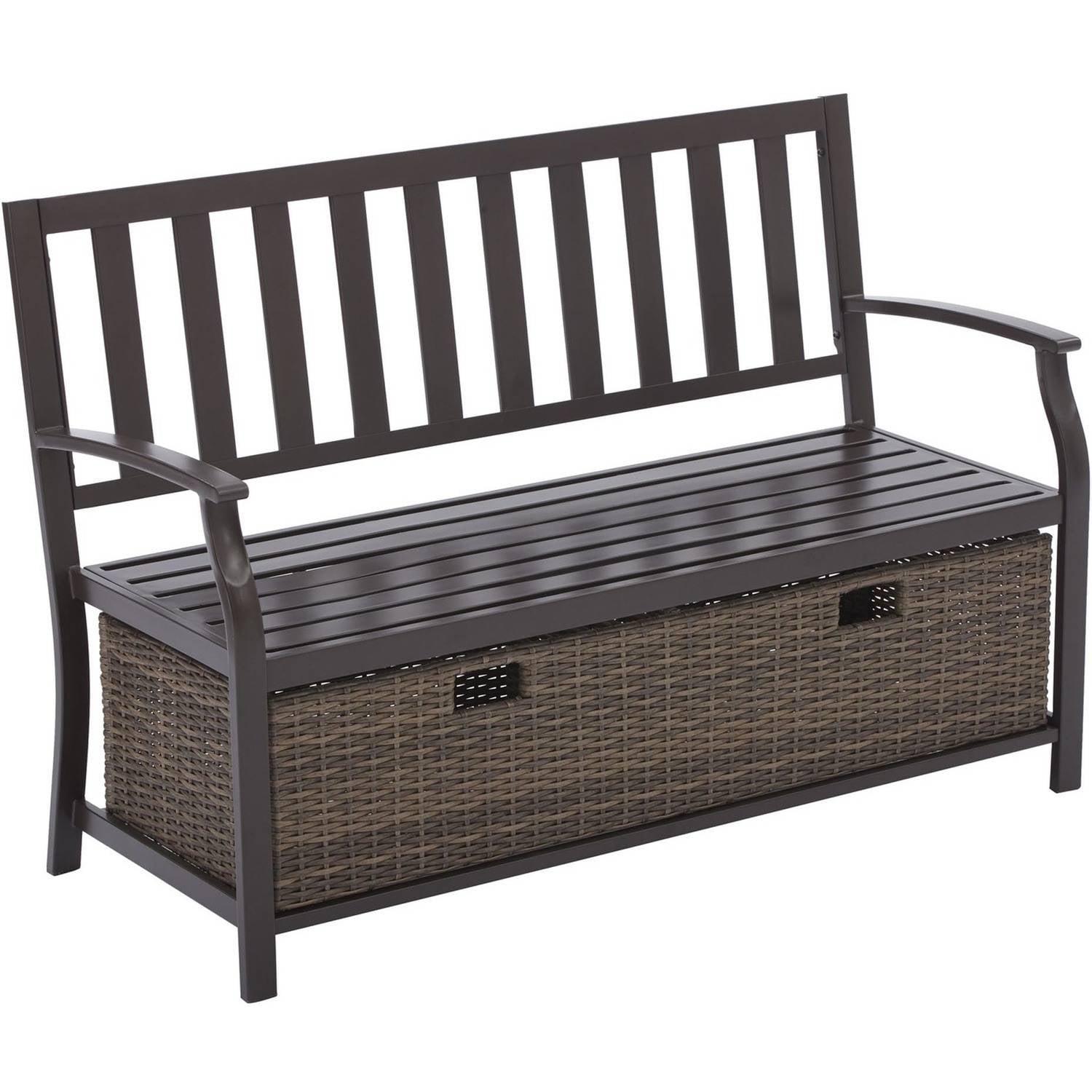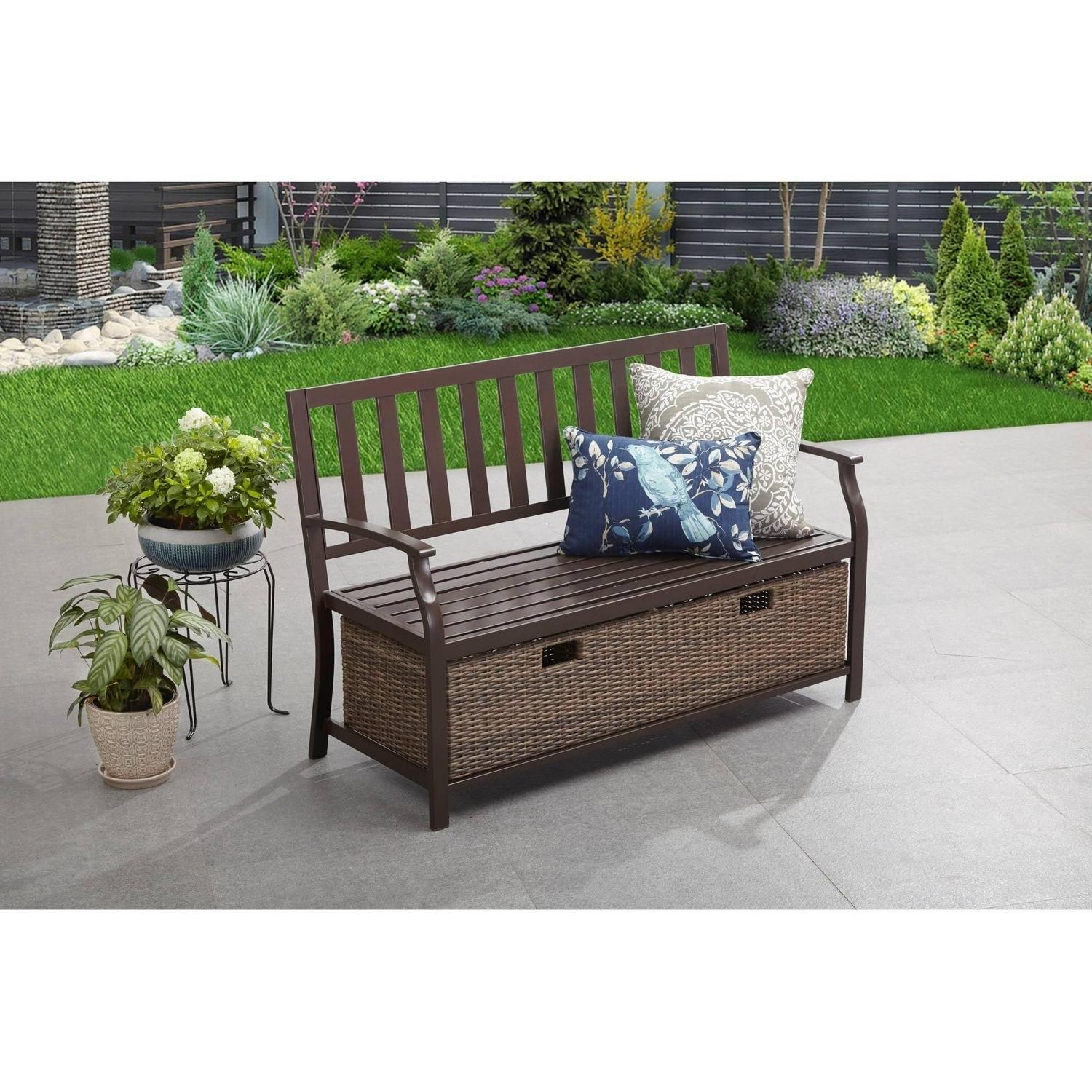 Better Homes and Gardens Camrose Farmhouse Steel Outdoor Bench with Wicker Storage Box, Bronze/Brown