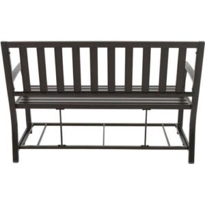 Enjoy the beauty of nature or have a chat over a cup of coffee in comfort on the elegantly styled Better Homes & Gardens Camrose Farmhouse Steel Outdoor Bench with Wicker Storage Box, Bronze/Brown. This versatile bench includes a multi-use storage box, so it makes a great addition to any porch, foyer, or entryway. It s constructed of E-coated, powder-coated, rust-resistant steel with a rich bronze-colored finish and matching, brown, all-weather, wicker for beauty, durability, and longevity. Design features include a high, slatted back and slatted seat for ventilation plus sloping armrests for extra comfort and style. The neutral-toned look and traditional style of the all-season storage bench complement most other outdoor furniture and decor. Personalize by adding some plush pillows (not included) for extra comfort. This bench with storage box is part of the Better Homes & Gardens Camrose Farmhouse outdoor furniture collection (other items sold separately). Instructions are included for easy assembly. Add a charming addition with functionality and quality craftsmanship to your patio, sunroom, deck, or garden with the Camrose Farmhouse Steel Outdoor Bench with Wicker Storage Box.