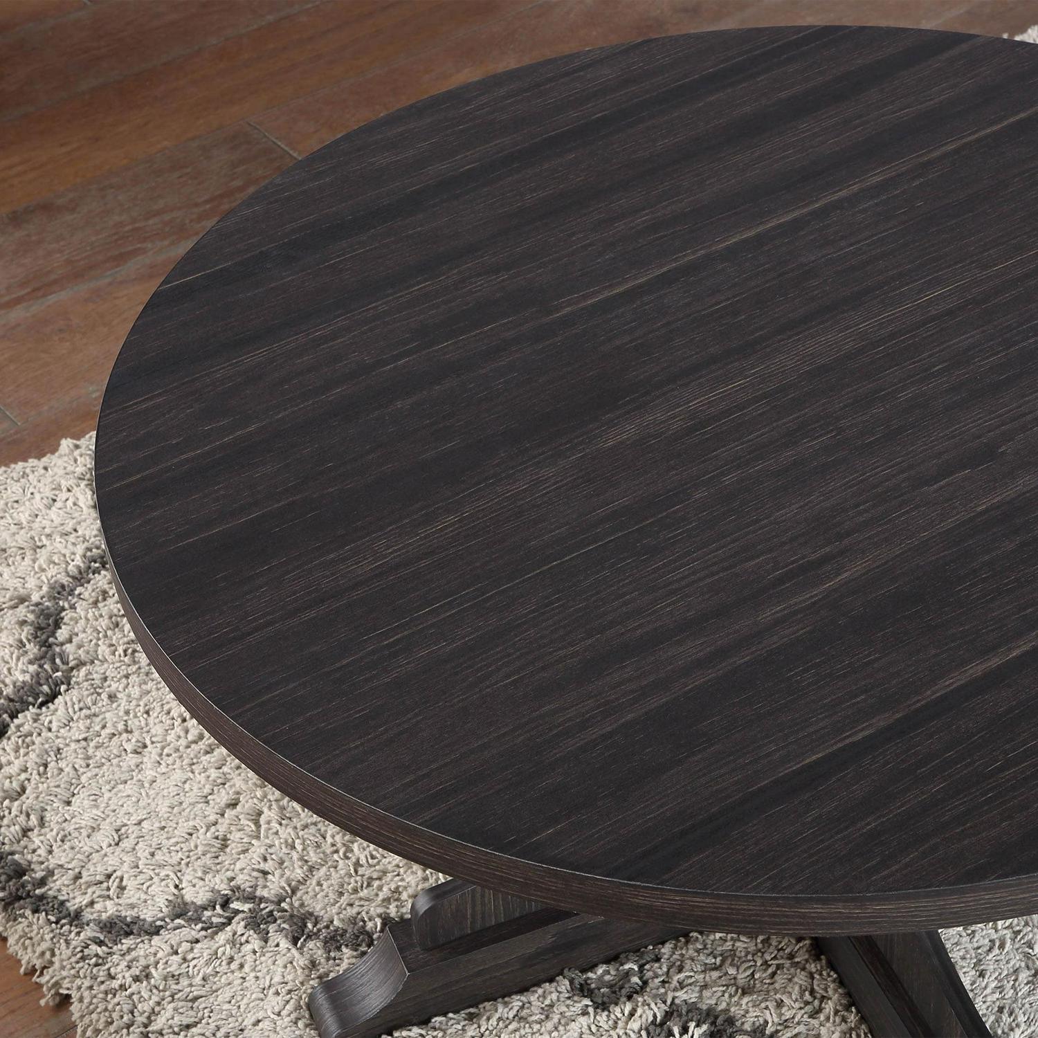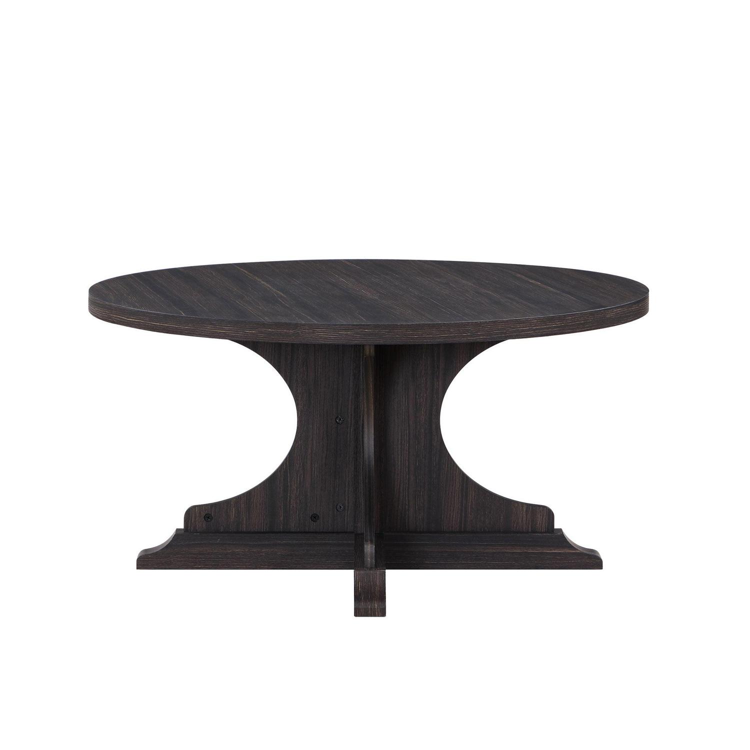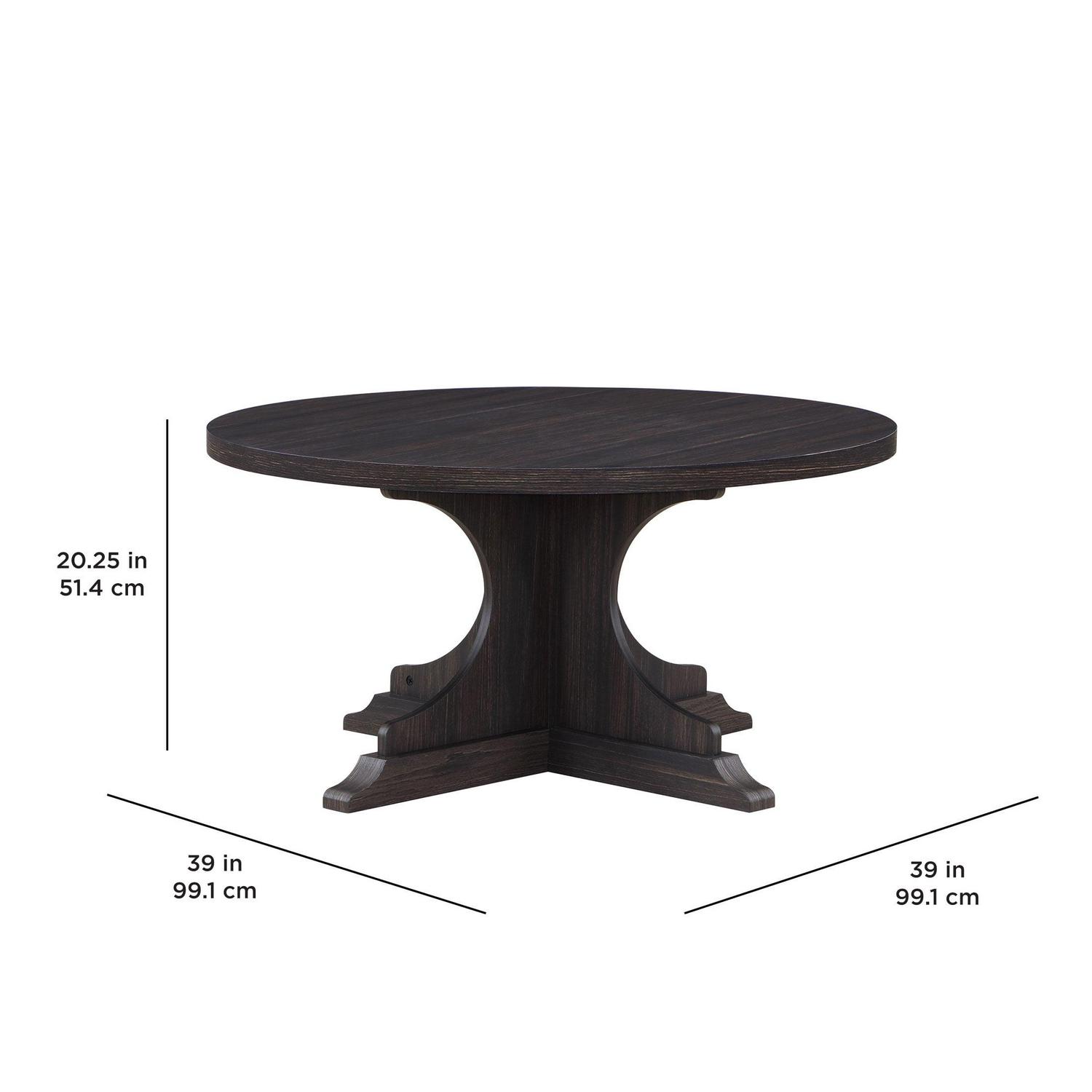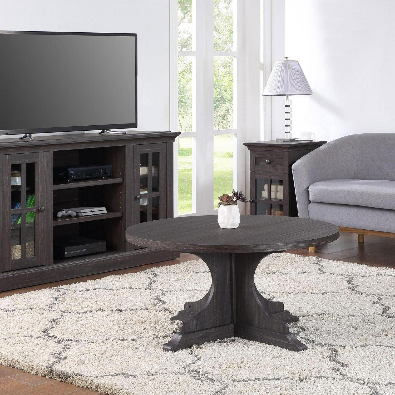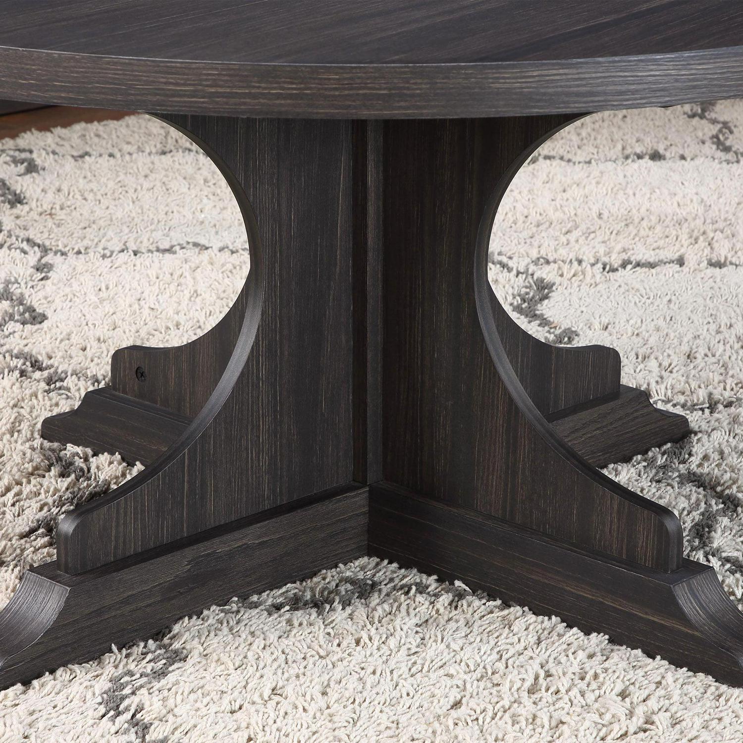The Better Homes and Gardens Canton Coffee Table with a pedestal base is a stylish and functional addition to any living room. The pedestal base provides stability and eliminates the need for legs, which allows for more legroom and seating flexibility. It is great for smaller spaces and allows you to maximize seating and floor space in your living room area. One of the advantages of a round coffee table with a pedestal base is its versatility. The round shape makes it easy to place in any area of the room, and the pedestal base provides a stable surface for drinks, snacks, and other items. You can create the ultimate living room scene by pairing the coffee table with other items from the Better Homes and Gardens Canton Collection (sold separately).
