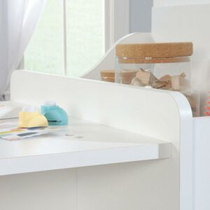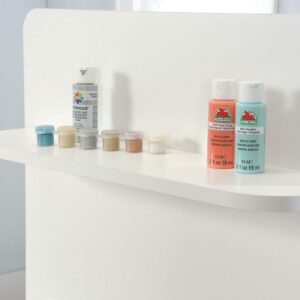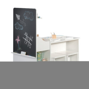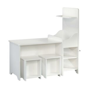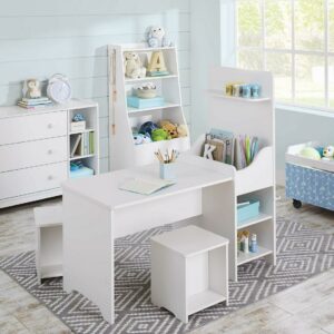 Create a fun and inviting space for your child’s imagination to run wild with this kid’s activity center from the Better Homes & Gardens Cartwheel collection. Its spacious tabletop provides your child with plenty of elbow room for coloring, crafting, or completing homework. Does it include two stools one for your little one and one for his or her bestie so they can play together all day long! The fun doesn’t stop there. It also features a large chalkboard with a tray so they can draw pictures and doodle messages. Its open shelving provides your child with convenient and easy access to storage for items like coloring books, board games, and baskets of crafting supplies too. It also includes a large bin and a small shelf for additional storage of any other miscellaneous items. Finished in White, this one-of-a-kind activity center provides your child with the perfect space for endless entertainment.