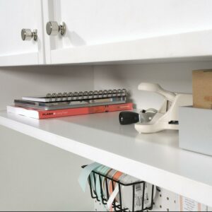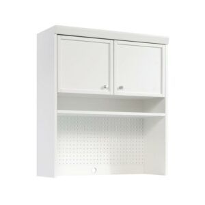 Need some extra storage for all your crafting and sewing supplies Check out this handy hutch from the Craft Pro Series. This storage hutch attaches to Storage Cabinet 421405, Storage Cabinet 421407, or Craft Table 421417 to add extra storage and display space for your crafting project necessities. This craft cabinet hutch features an adjustable shelf behind the doors for customizable storage space for yarn, books, paper, and more. An open shelf is ideal for easy-access storage to your stapler, scissors, or tape. A pegboard back on this craft furniture allows convenient and visible organization of tools and supplies. Cord access through the enclosed back make this craft storage hutch the must-have addition to the Sauder furniture that you already know and love. Finished in a crisp White, this hutch for craft table is the perfect addition to keep your hobby and craft space clean and organized.