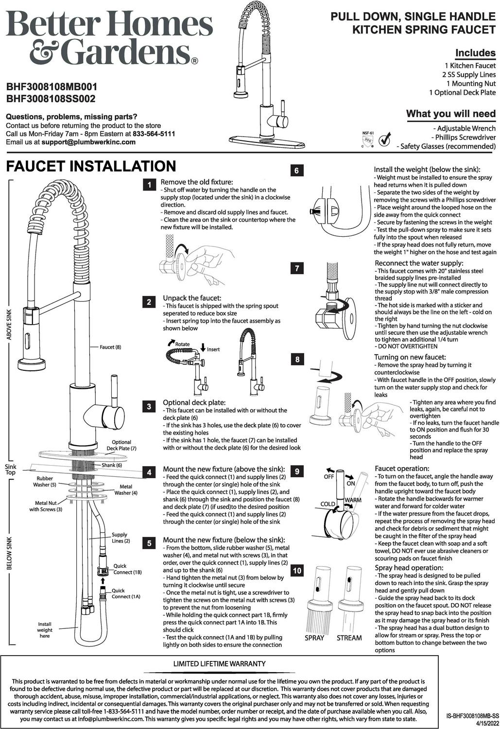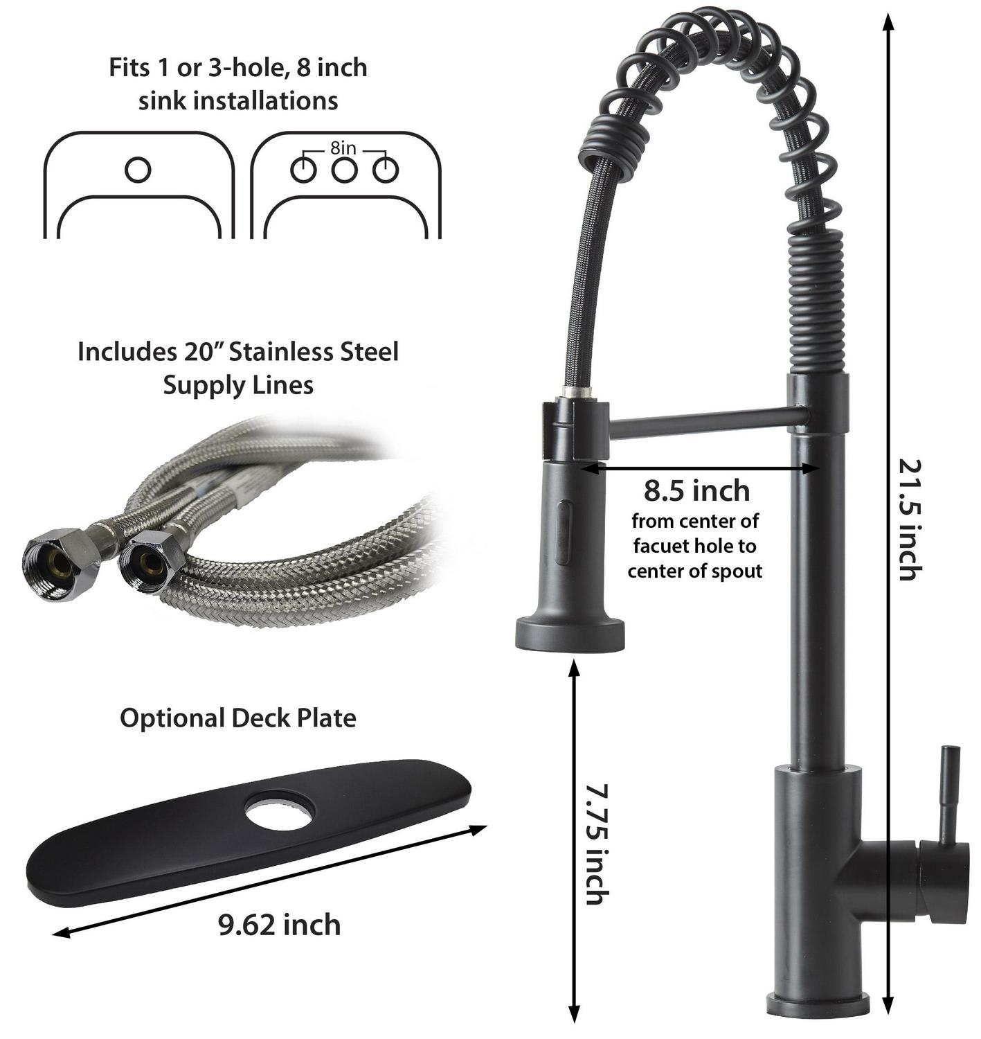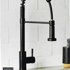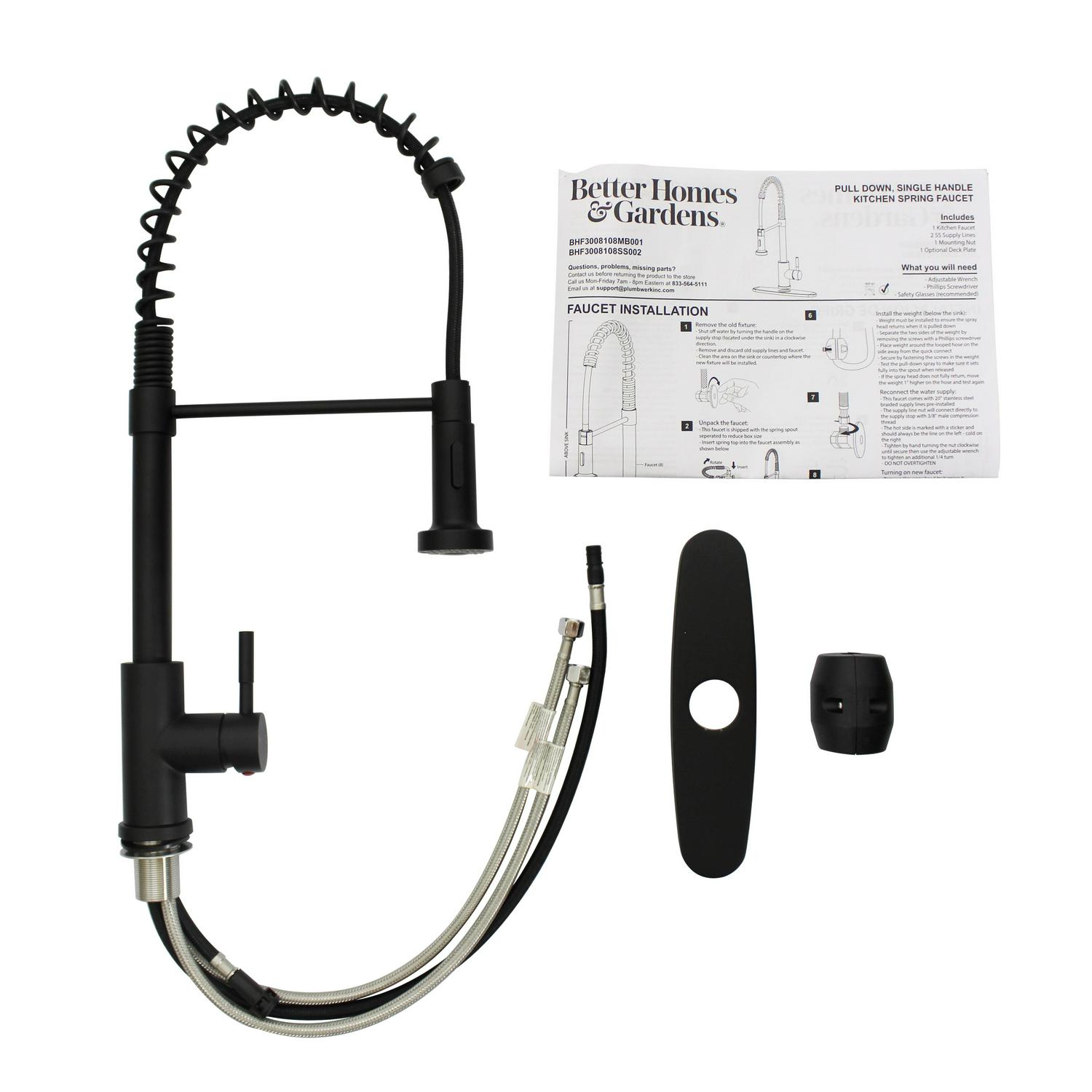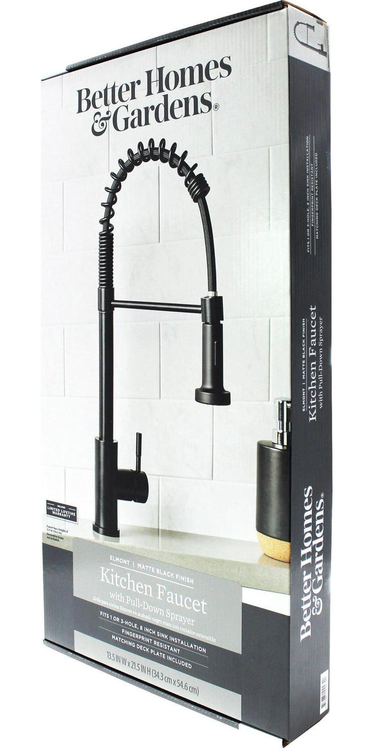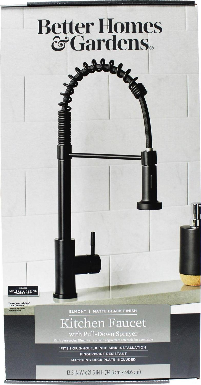 This Better Homes & Gardens Elmont Single Handle Spring Style Kitchen Faucet in Matte Black finish is a stylish statement for your kitchen. The perfect blend or strength and beauty, this faucet features a stylish spring design with a pull-down spray head that can be used in spray or stream function. The included optional deck plate allows for installation in 1 hole or 3 hole sink configurations. This single handle design allows for easy one hand operation of flow control and temperature. This faucet is covered by a Limited Lifetime Warranty. Clean periodically, but avoid use of abrasives cleaners, steel wool, or harsh chemicals.