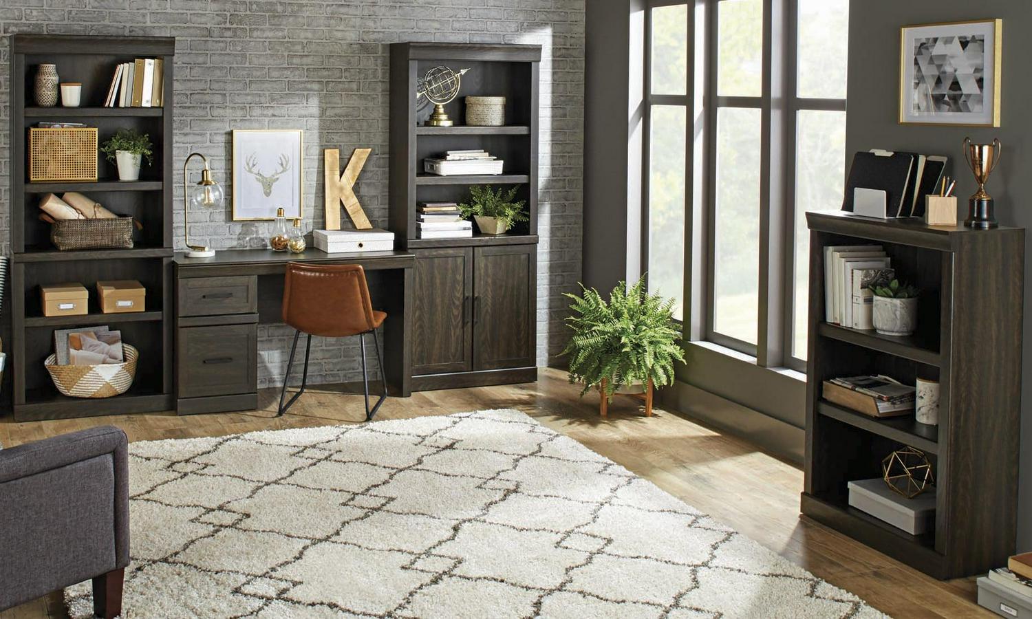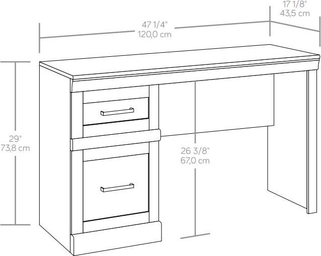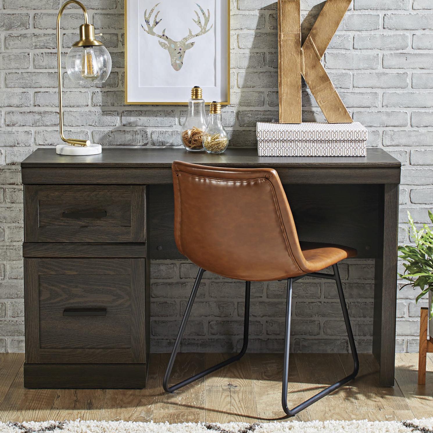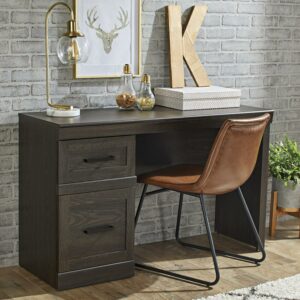 The office inspiration that you’ve been looking for. Create a fresh new look in your home office when you add the charming style and modern design of this desk from the Better Homes & Gardens Glendale collection. Its spacious top surface provides you with all the room you need for your must-have desk essentials like your laptop, stacks of notepads, a cup full of pens, and of course your favorite coffee mug. It even has space for some home decor like a lamp and picture frames too. It features a storage drawer that opens and closes on smooth metal runners for easy access to storage of miscellaneous items. It also includes a file drawer with full extension slides that accommodate letter-size hanging files so you can keep all your important papers organized. Finished in dark oak and detailed with attractive hardware, this beautiful desk gives you the style you want with the functionality you need.