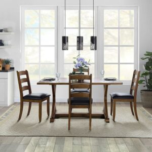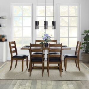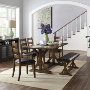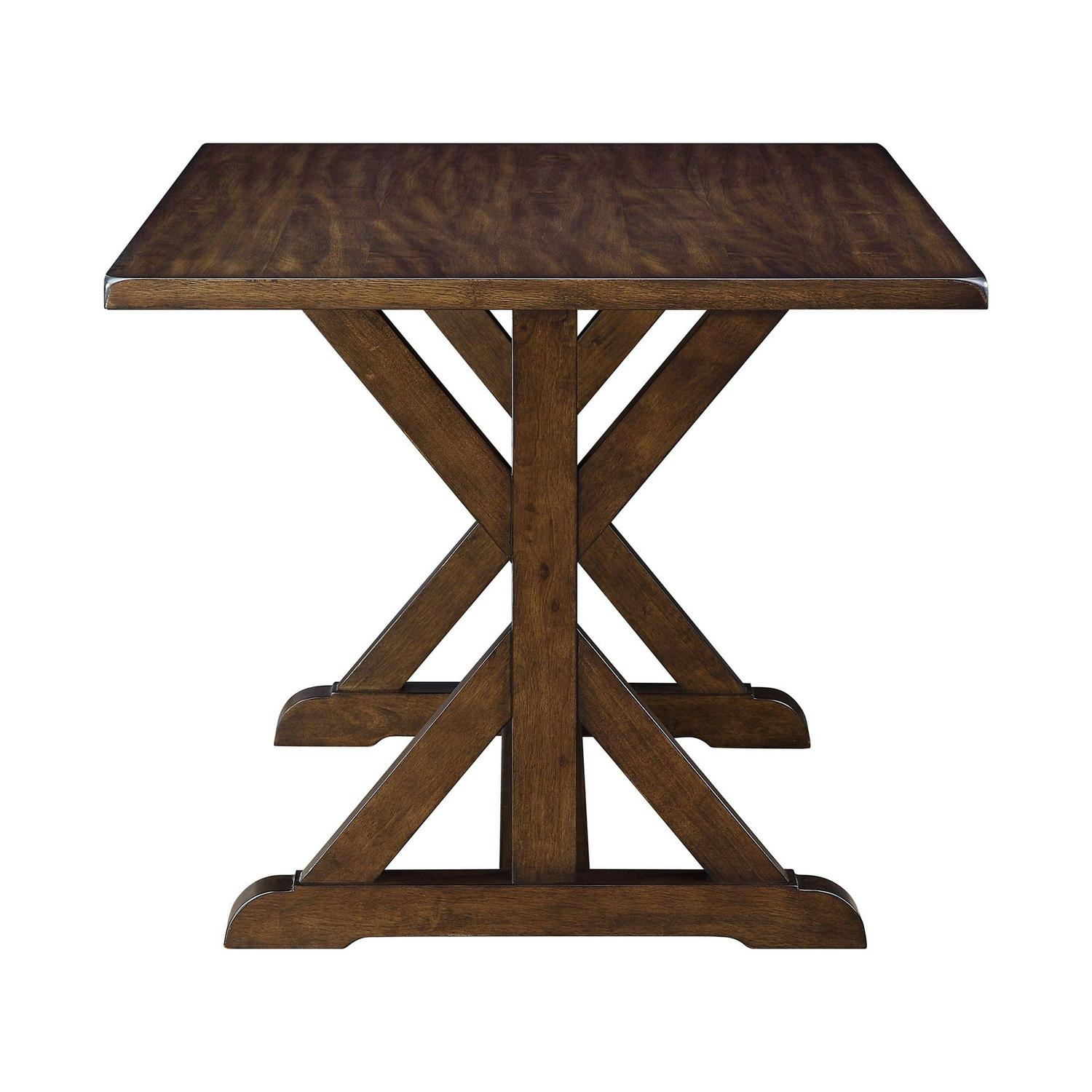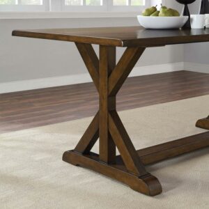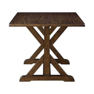 The Granary Modern Farmhouse Dining Table brings classic farmhouse charm into your dining room. The table is hand-finished in rich, warm brown tones that enhance the natural beauty of the wood grains. The trestle style base adds an architectural flare to the table elevating its character. Crafted from solid wood, the durable construction ensures that you will be enjoying this table for many years to come. It comfortably accommodates up to six people making it ideal for hosting family dinners, holiday gatherings or even game nights with friends. Combine the table with the Granary Modern Farmhouse Chairs, set of 2, and Granary Modern Farmhouse Padded Bench Seat to complete your dining set arrangement. Chairs 2-pack and Bench seat are each sold individually. Add the Granary Dining Table to your home today and make your dining room a favorite room in your home.