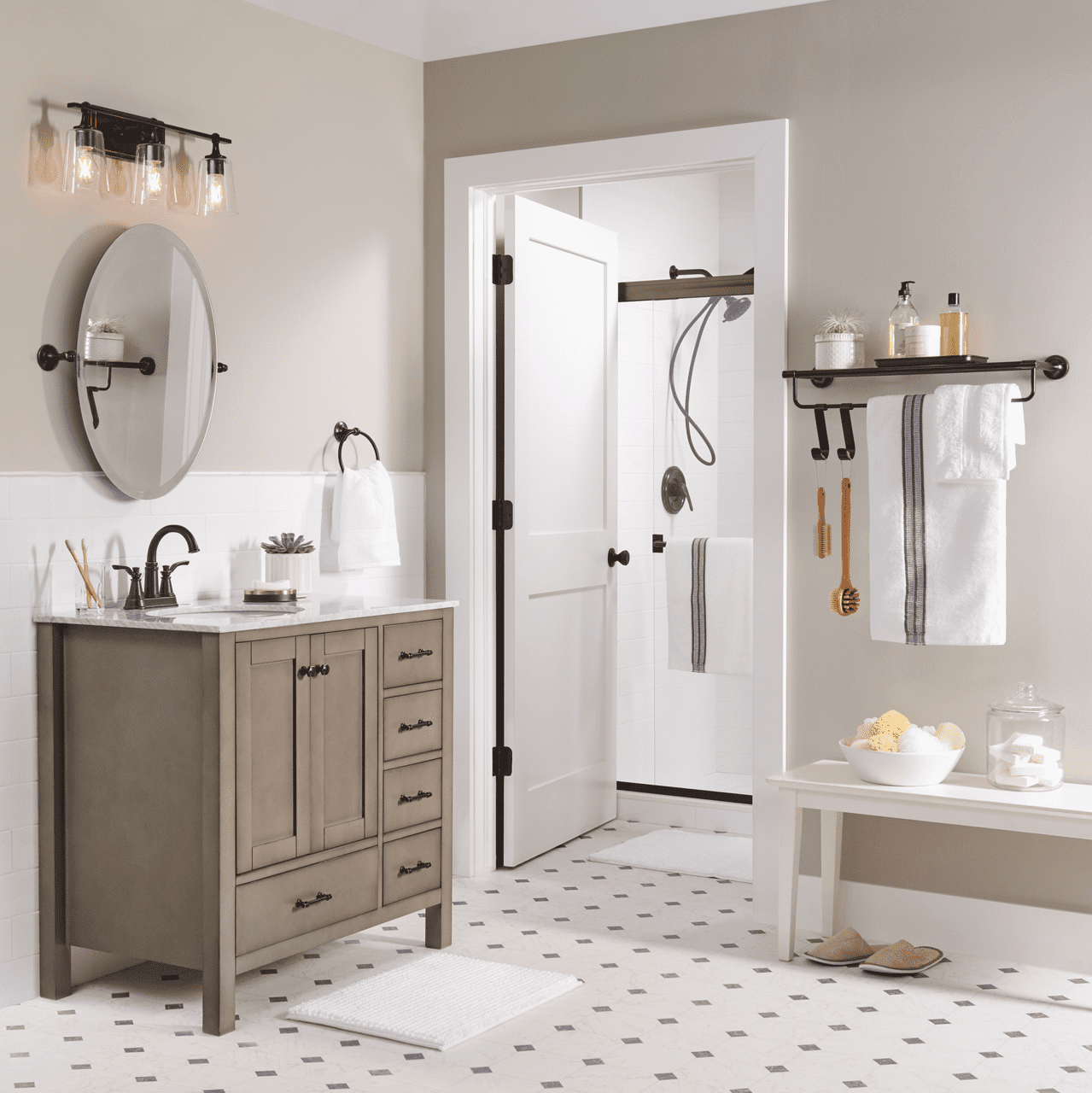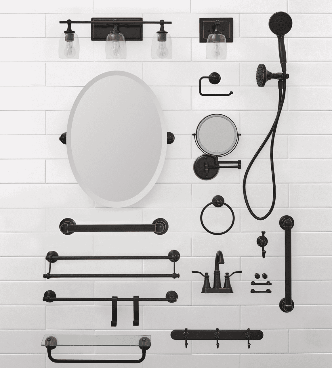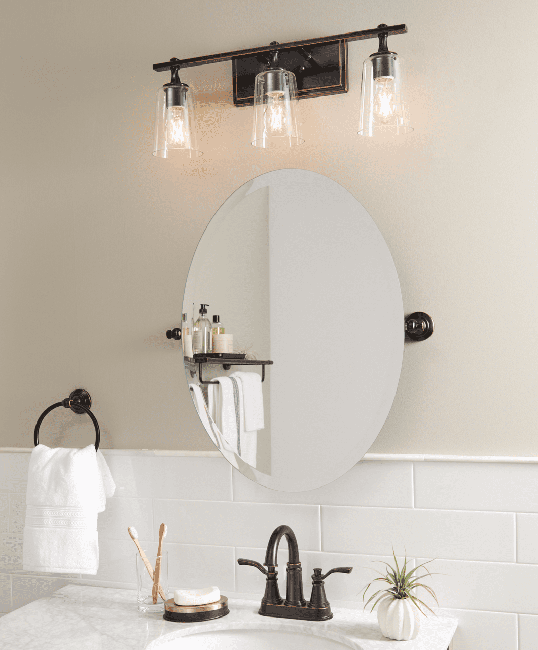 Features beveled edges and a tilt design for adjustability Mounting hardware and hanging template included High quality, upscale design from Better Homes & Gardens will give a beautiful update to any bathroom Zinc die cast construction provides exceptional reliability and durability Features durable wall-mounting system for hassle-free installation Long-lasting oil rubbed bronze finish helps prevent corrosion, tarnish or discoloration
