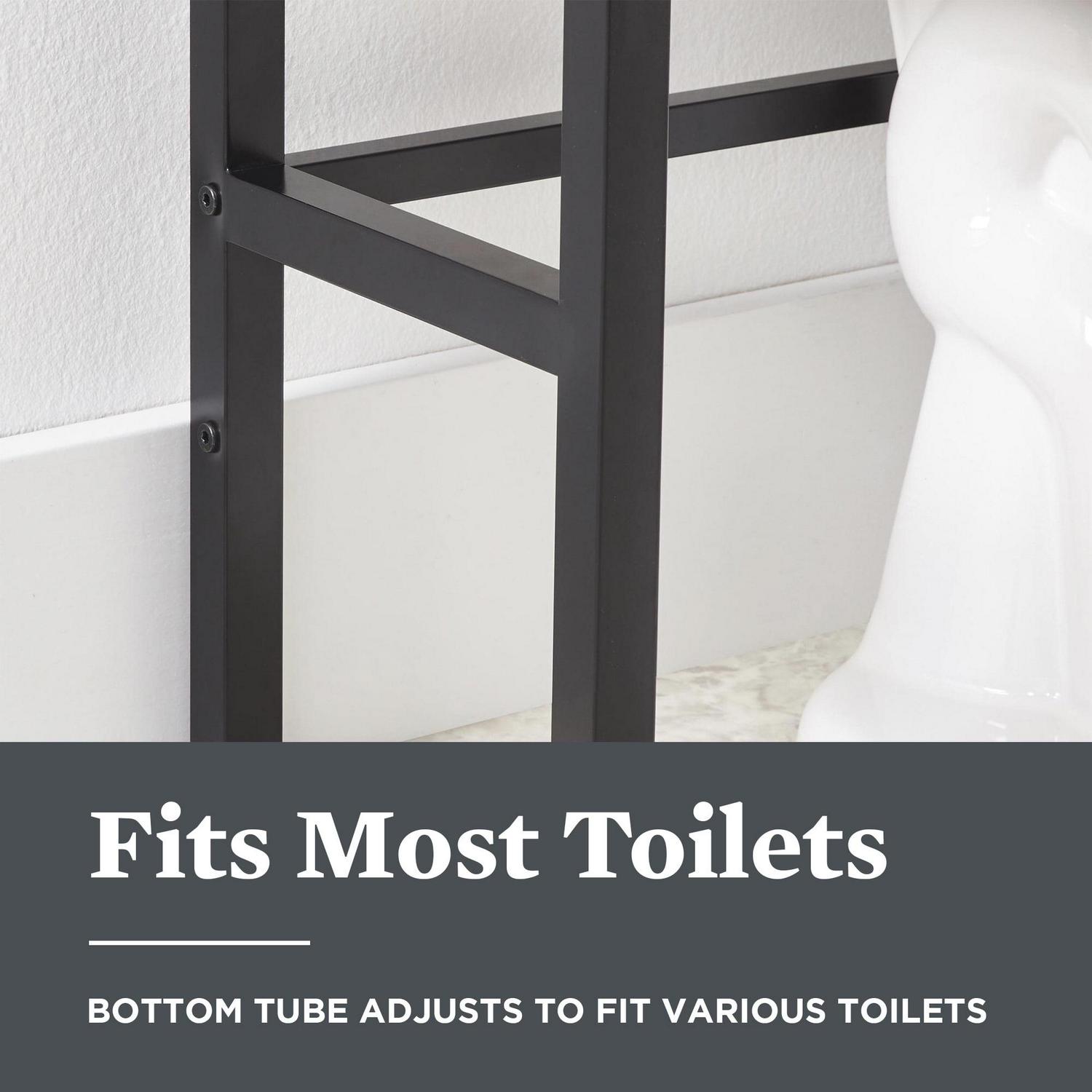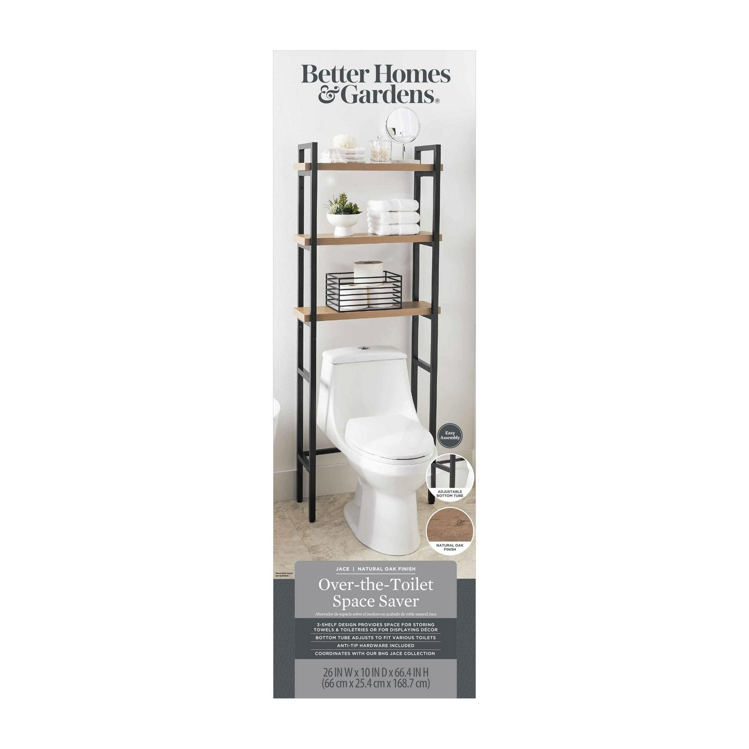 The Better Homes & Gardens Jace Over-the-Toilet Space Saver is proof that efficient bathroom storage does not need to be boring! Sleek and stylish looking, with a sturdy metal frame and engineered wood shelves with a natural oak finish, the Jace space saver is the ideal bath storage solution for almost any sized bathroom. Its 3 shelves provide valuable space for towels, washcloths and toiletries. Or use the space saver’s shelves to display decorative bath decor items. Adults and kids alike will find it useful for reducing bath clutter. The easy-to-assemble space saver’s adjustable bottom tube allows it to fit over various size toilets. The space saver measures 26 in. W by 10 in. D by 66.4 in. H.