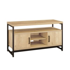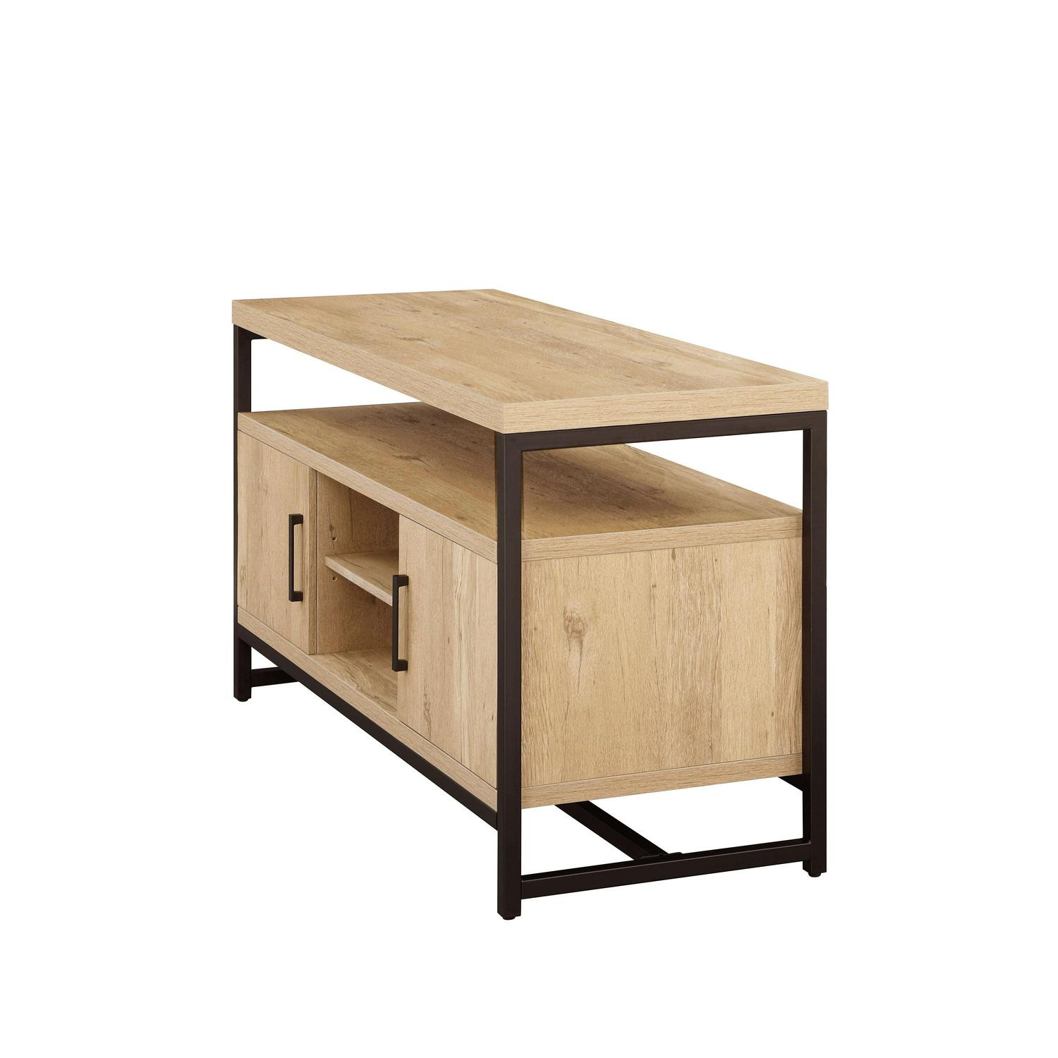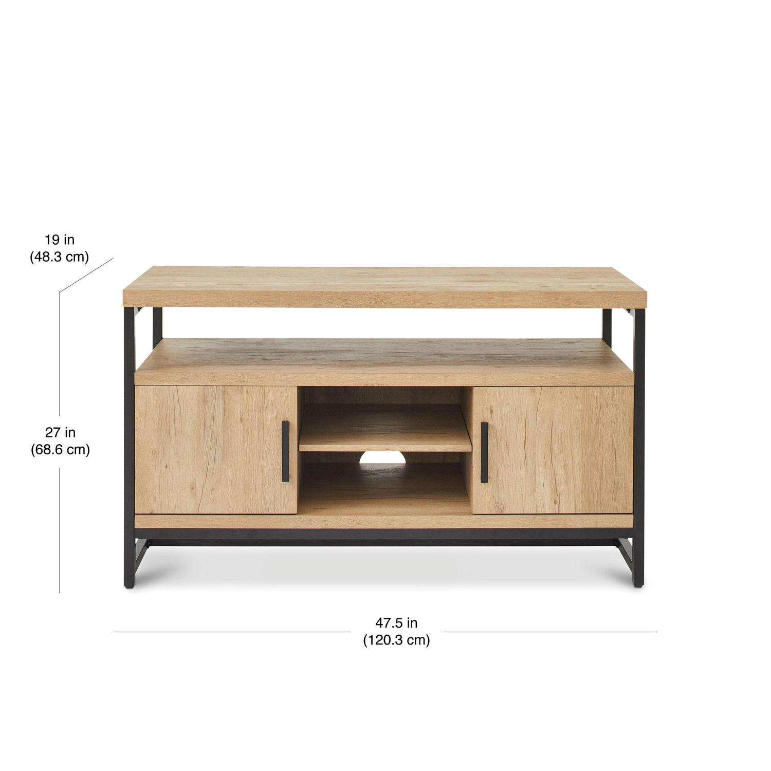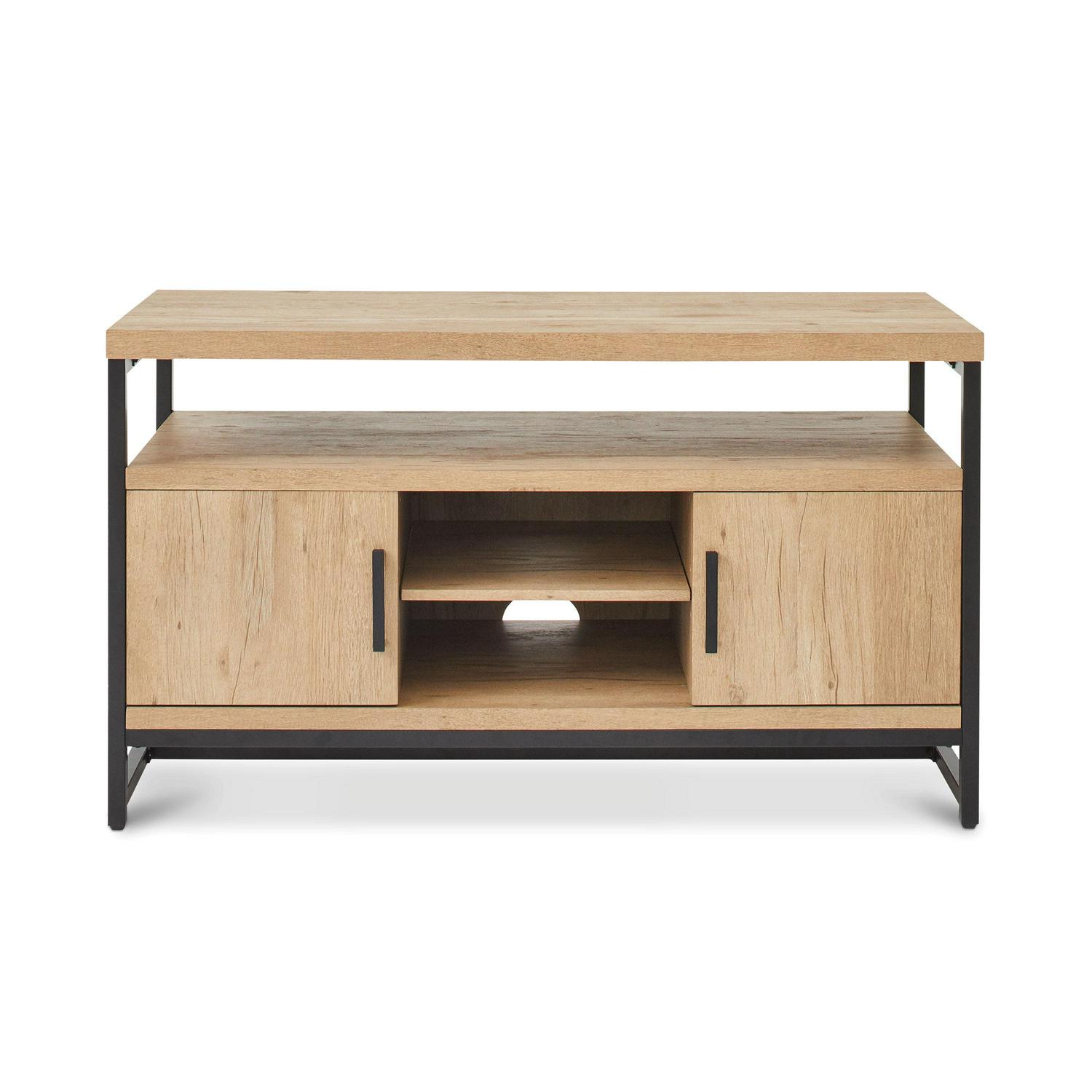 The rustic character of the natural oak finish complements the industrial style of the Better Homes and Gardens Jace Media Console s metal frame. This console will be a great fit with a variety of home decor styles from rustic to transitional and everything in between. The console features a spacious top that can fit a flat panel television up to 55 inches. The cabinet and shelving options this console provides makes it a great multi-purpose storage solution whether it s being used as a dining buffet, an accent table or an entertainment center. The top shelf is set up to be the ideal space for housing your audio/video components. There are two storage cabinets that include an adjustable shelf for flexible concealed storage along with an open center area for even more storage and display options. The back of the console features cable cutaways for conveniently organizing and managing cables and cords. Pair the console with the Better Homes & Gardens Jace 5-Tier Bookcase to create an enhanced entertainment center (sold separately).