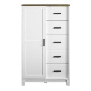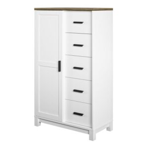 Elevate your bedroom décor with the charming Better Homes & Gardens Langley Bay Gentleman’s Chest. The Chest offers superior storage capabilities to ensure your wardrobe stays tidy and organized. With 5 shelves on the left side and 5 drawers stacked vertically on the right side, the Chest allows you to sort your clothes into convenient groupings so you know exactly where every piece of clothing is stored. The crisp white body of the Gentleman’s Chest is carefully crafted from durable and attractive painted MDF and blends effortlessly with the handsome woodgrain top constructed from laminated engineered wood. The drawers are conveniently lined in a laminate finish to prevent clothing from snagging on raw edges and the decorative framed drawer fronts lend to the chest’s stunning appearance. The perfect combination of ample storage space and beautiful design, the Langley Bay Gentleman’s Chest will be a standout feature in any room. Complete the look with the entire Langley Bay Collection for an exquisite bedroom makeover. A wall anchor kit is included to secure the Chest to the wall and prevent tipping injuries. The Gentleman’s Chest ships flat to your door and requires assembly upon opening. Two adults are recommended to assemble. Once assembled, the Gentleman’s Chest measures to be 53.125″H x 31.5″W x 15.75″D.