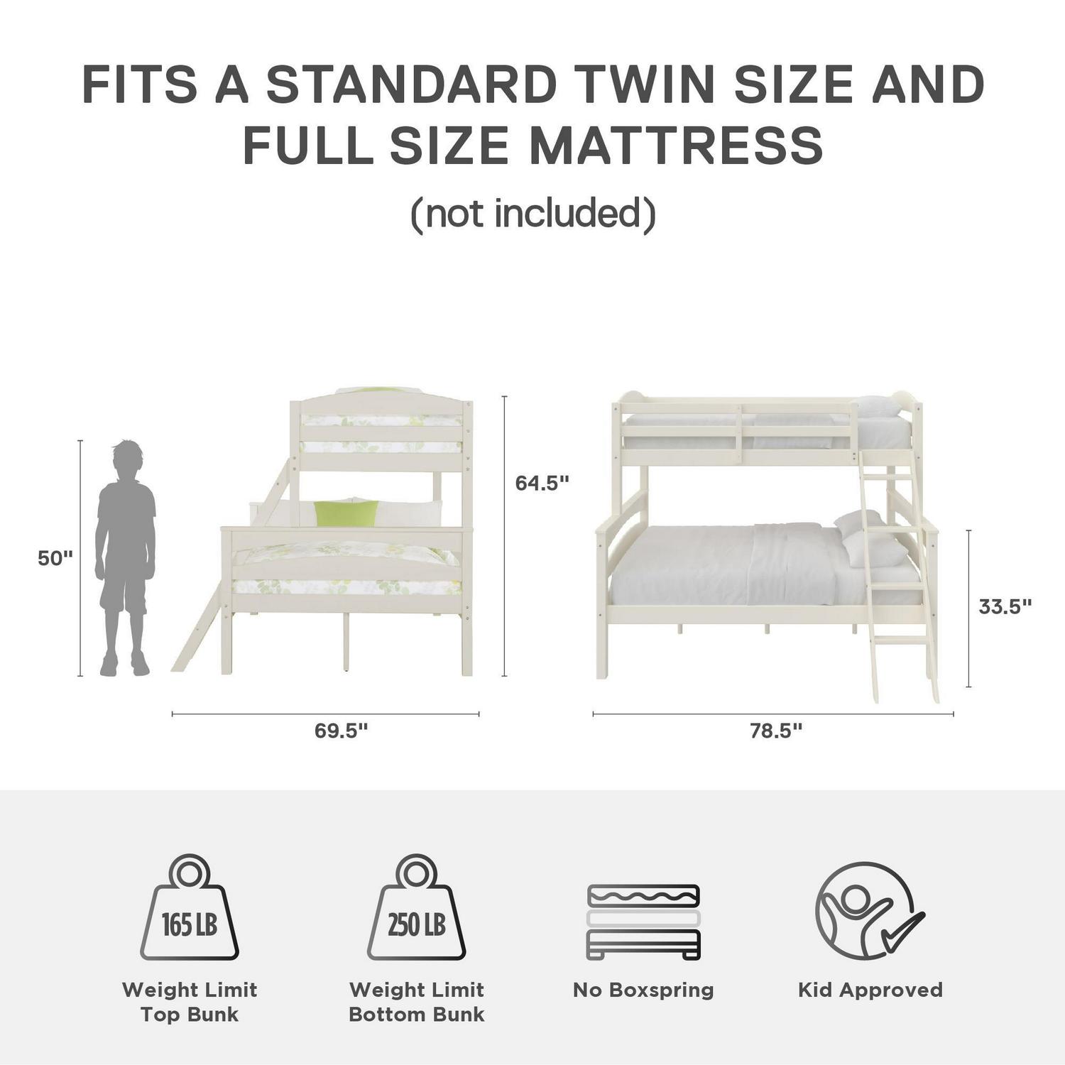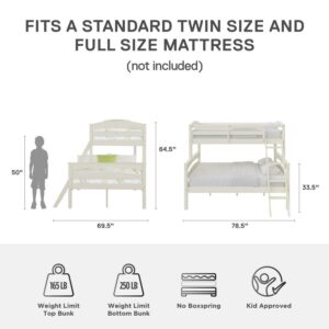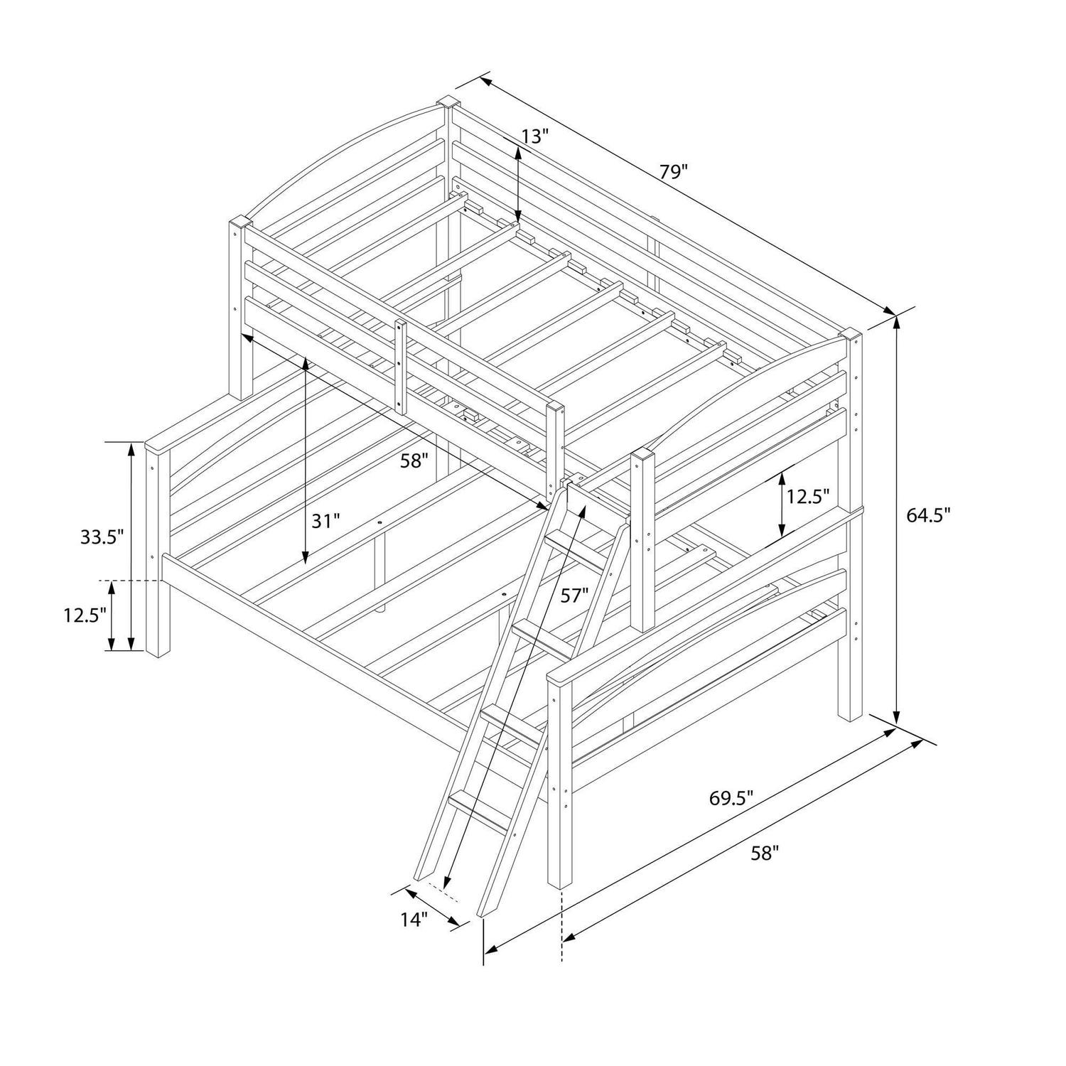 – Built for safety: Incudes a sturdy and easy-to-climb angled ladder and a 12.5″ guard rail. Non-toxic painted finish. Assembled dimensions of the bunk bed: 69.5″W x 79″L x 64.5″H; twin bed: 43.5″W x 31″H; full bed: 58″W x 33.5″H