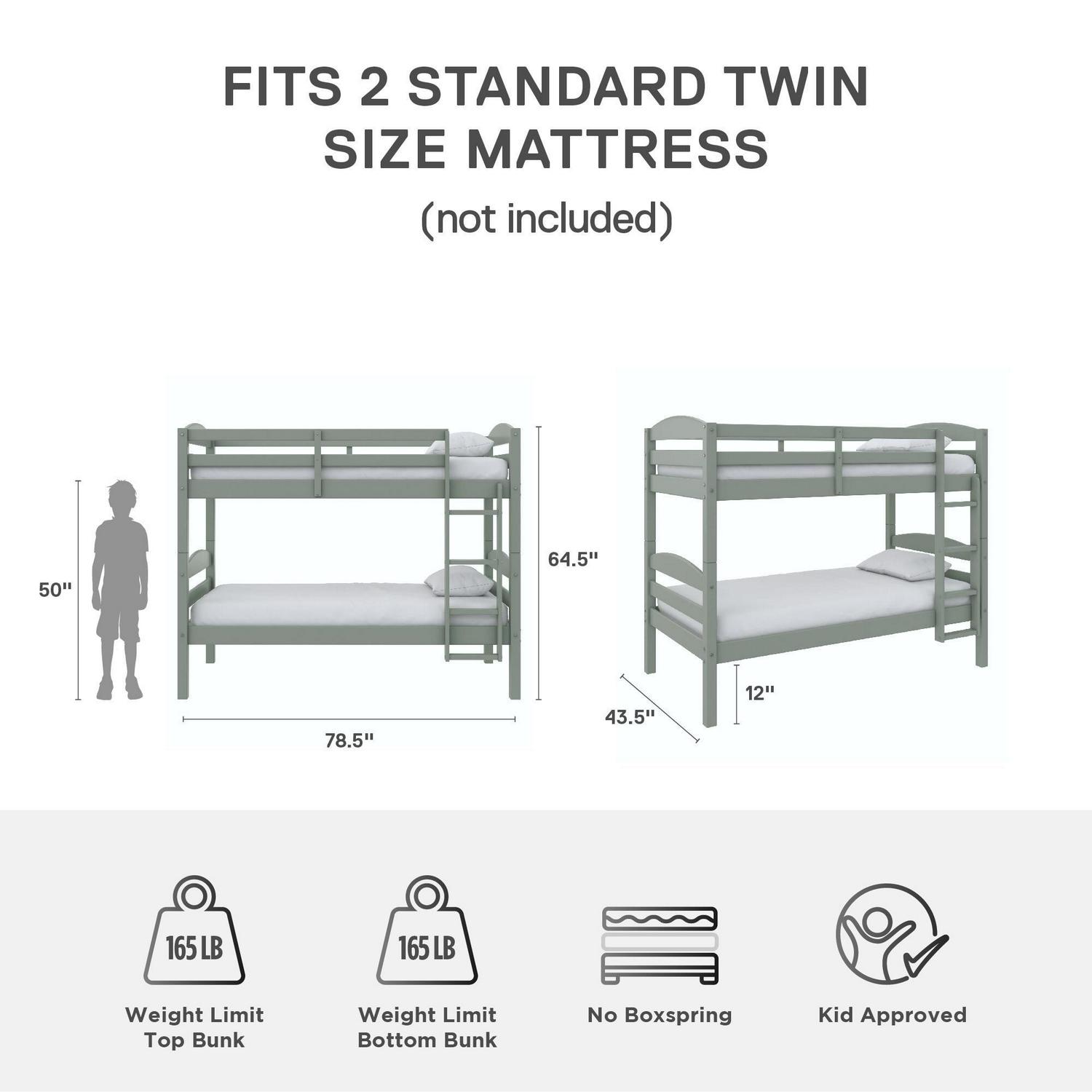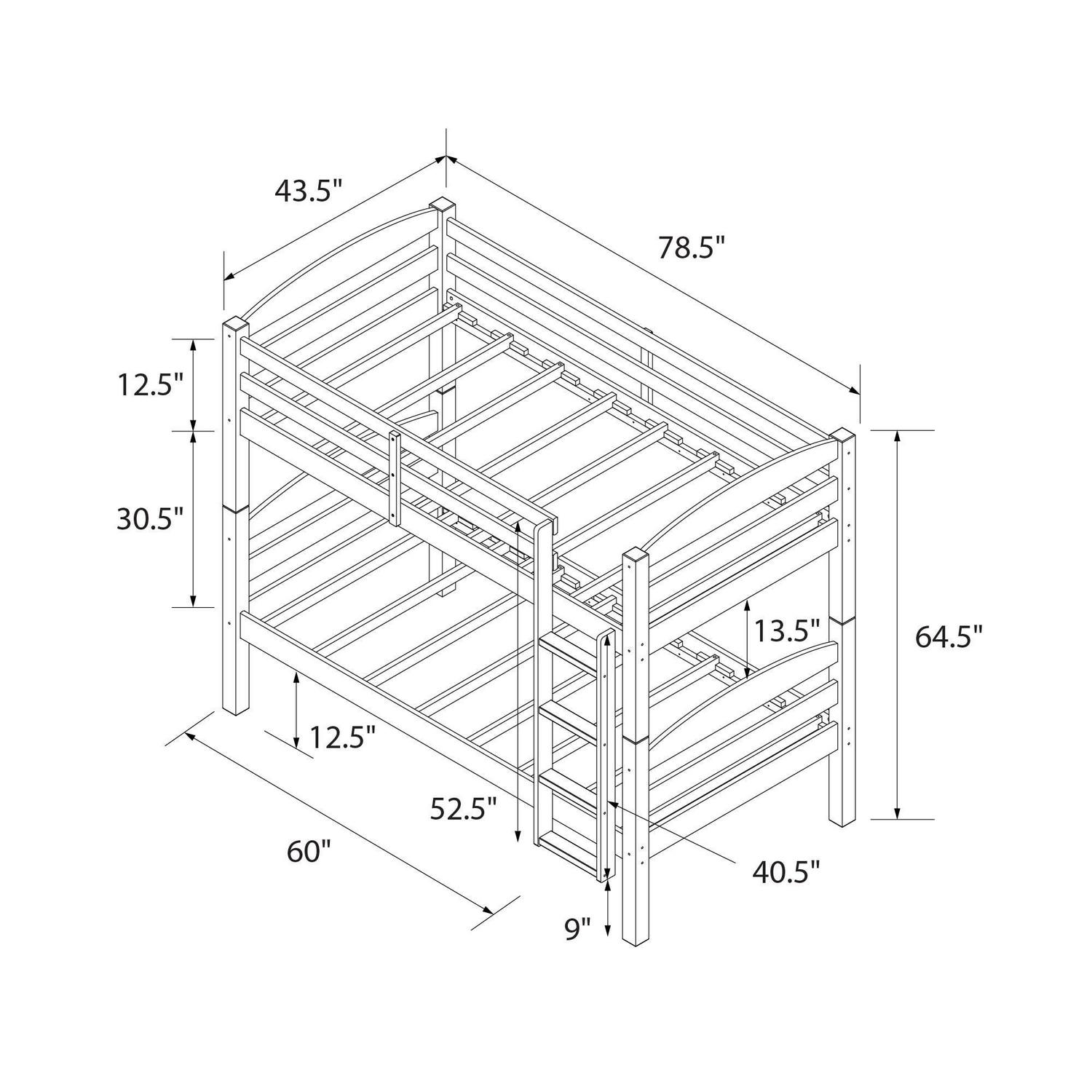 – Bunk bed assembled dimensions: 43.5″W x 78.5″L x 64.5″; net weight: 111 lbs.