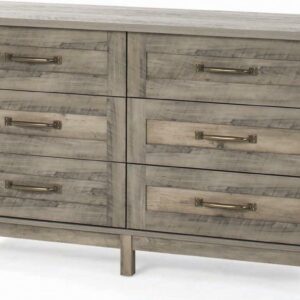 Create a rustic-inspired look while adding versatile storage options to your bedroom with this dresser from the Better Homes & Gardens Modern Farmhouse collection. This beautiful chest of drawers features six easy gliding drawers that open and close on smooth metal runners, making them ideal for convenient storage of an array of different items like stacks of button-up shirts and blue jeans to your collection of old t-shirts and sweat pants. It has room for all your stuff! Its spacious top surface provides you with additional space to store bedroom items and display your favorite home decor like an accent lamp, your makeup bag, bottles of perfume, and pictures of your family and friends. Its simple design and charming, good looks make this dresser a perfect fit for your bedroom. Finished in Rustic Gray and detailed with antique brass metal hardware, this beautiful dresser gives your home the style you want with the functionality you need.