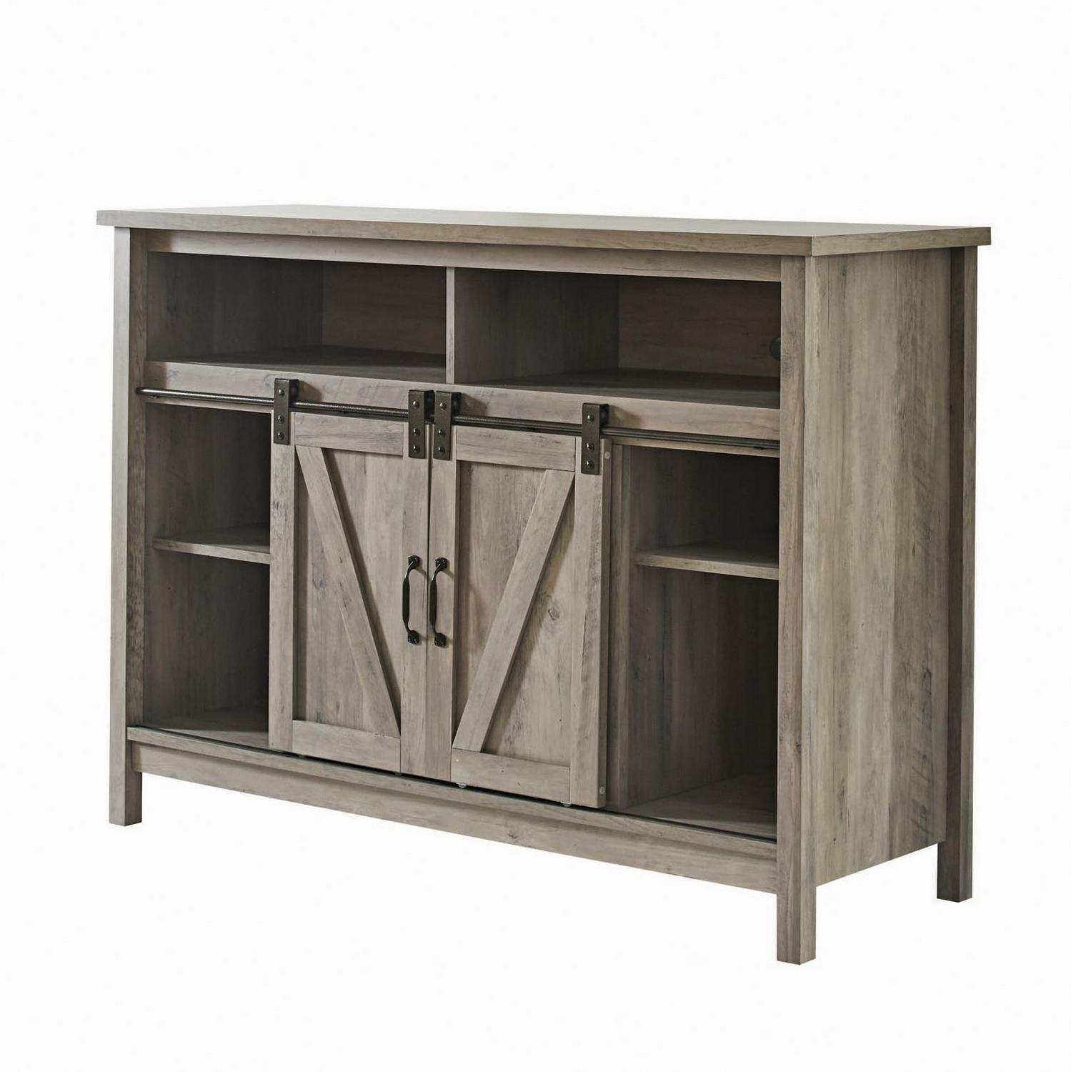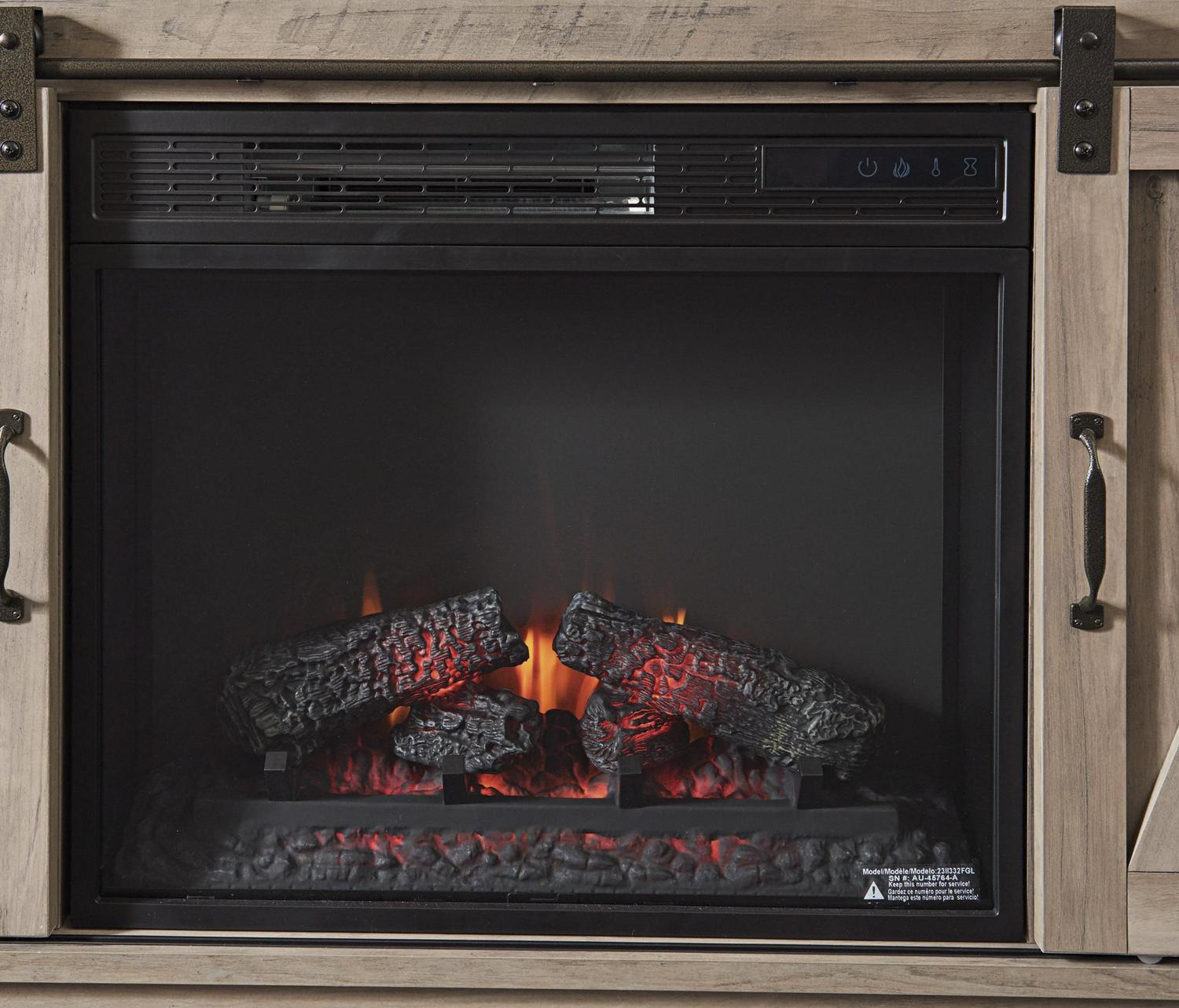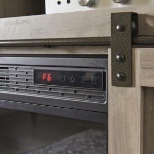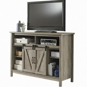 Grab some snacks, take a seat on the couch, and cozy up around this fireplace console from the Better Homes & Gardens modern farmhouse collection. It accommodates up to a 50″ TV, making it the perfect spot to binge-watch your favorite show or have an all-day movie marathon with your friends. It features divided open shelving that is ideal for holding your audio and video equipment. This unique stand features two sliding doors that glide side to side on a smooth metal railing. Behind each sliding door is an adjustable shelf that can be moved to different heights to create flexible storage options for items of all shapes and sizes. Never get cold feet again The fireplace insert heats up to 1000 sq. Ft. And includes a remote control so you can adjust it how you like from any place in the room. For safety reasons, the sensor on the fireplace insert cuts off power when the doors are rolled in front of it. Finished in rustic gray and detailed with stylish hardware, this beautiful TV stand is everything your home needs and more.