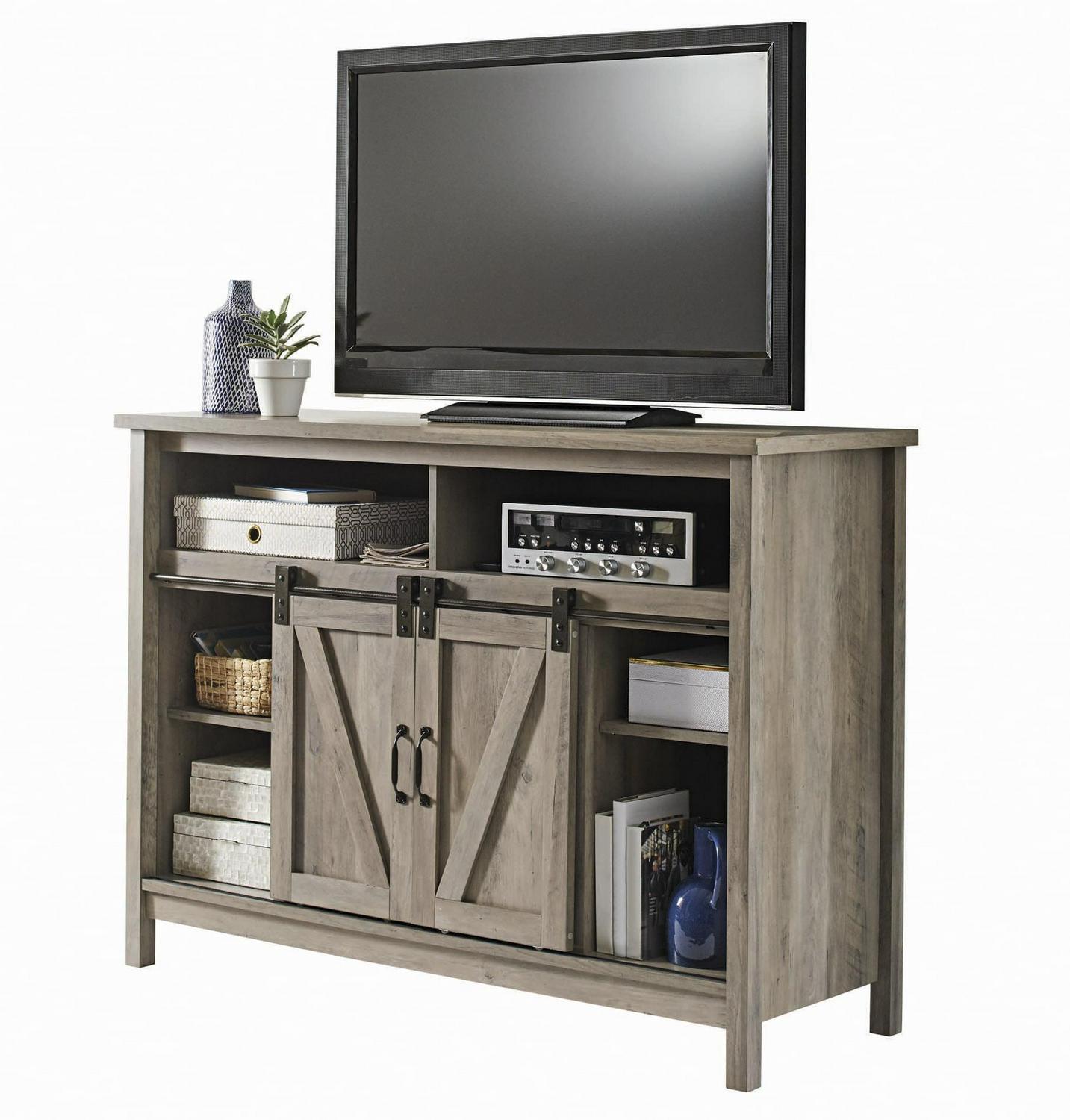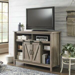 – Better Homes & Gardens Modern Farmhouse Fireplace TV Stand for TVs up to 50″, Rustic Gray Finish: