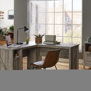 It s time for an office revamp! Do your home office a favor and give it the update it has always need by adding the beautiful style of the L-shaped desk from the Better Homes & Gardens Modern Farmhouse collection. Give yourself the extra work space you need. This office desk offers a spacious, L-shaped work area that provides you with all the room you need for items like your laptop, stacks of folders, notepads, and of course your hot cup of coffee. This home office desk features a drawer with full extension slides so you can keep important documents and files organized and hidden away. Its open shelf provides you with additional storage space for easy to reach items like stacks of paper or a stapler. This office desk is finished on all sides for versatile placement throughout your home. Finished in Rustic Gray and detailed with attractive hardware, this L-shaped desk will have you feeling motivated and ready to work.